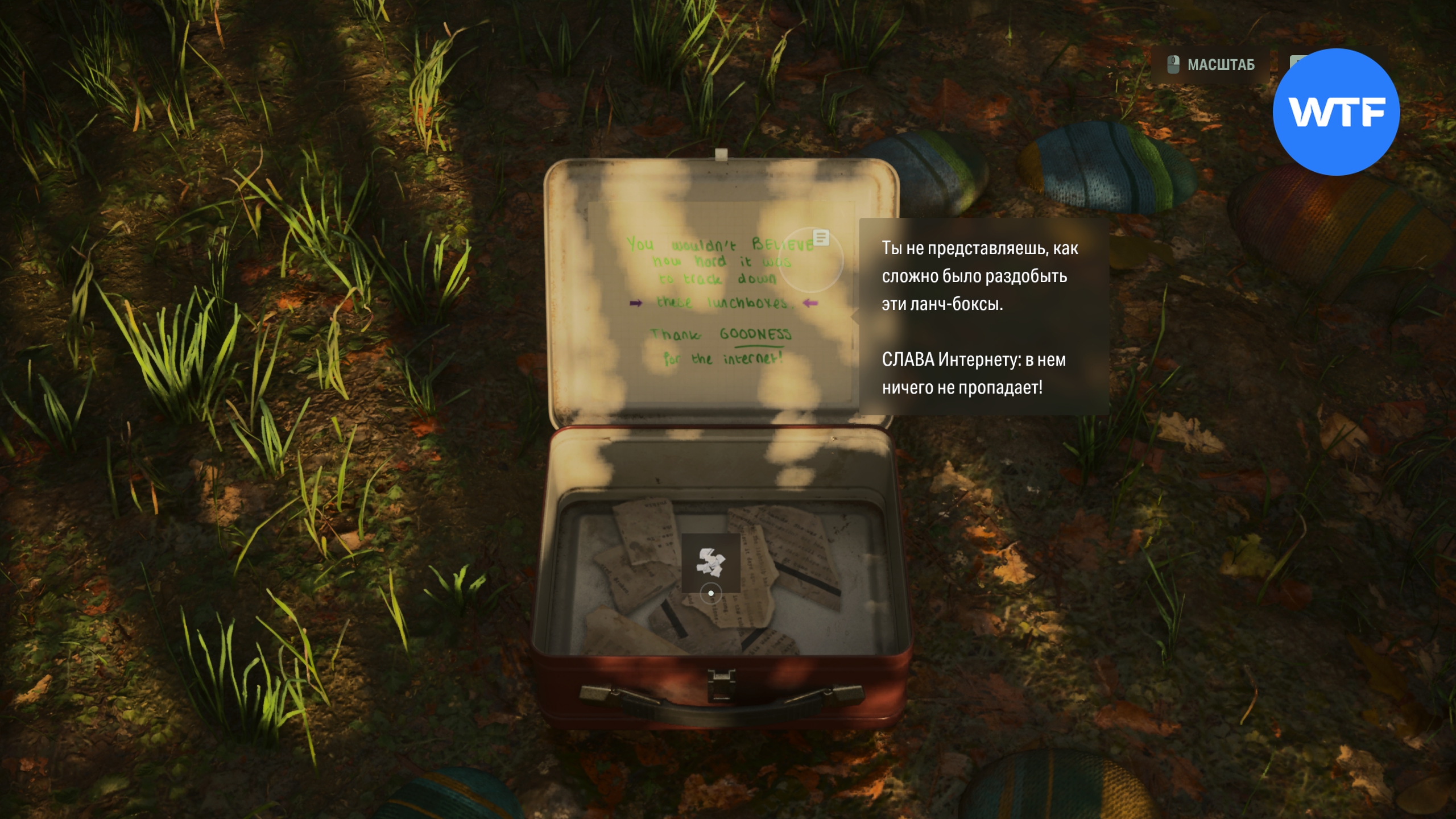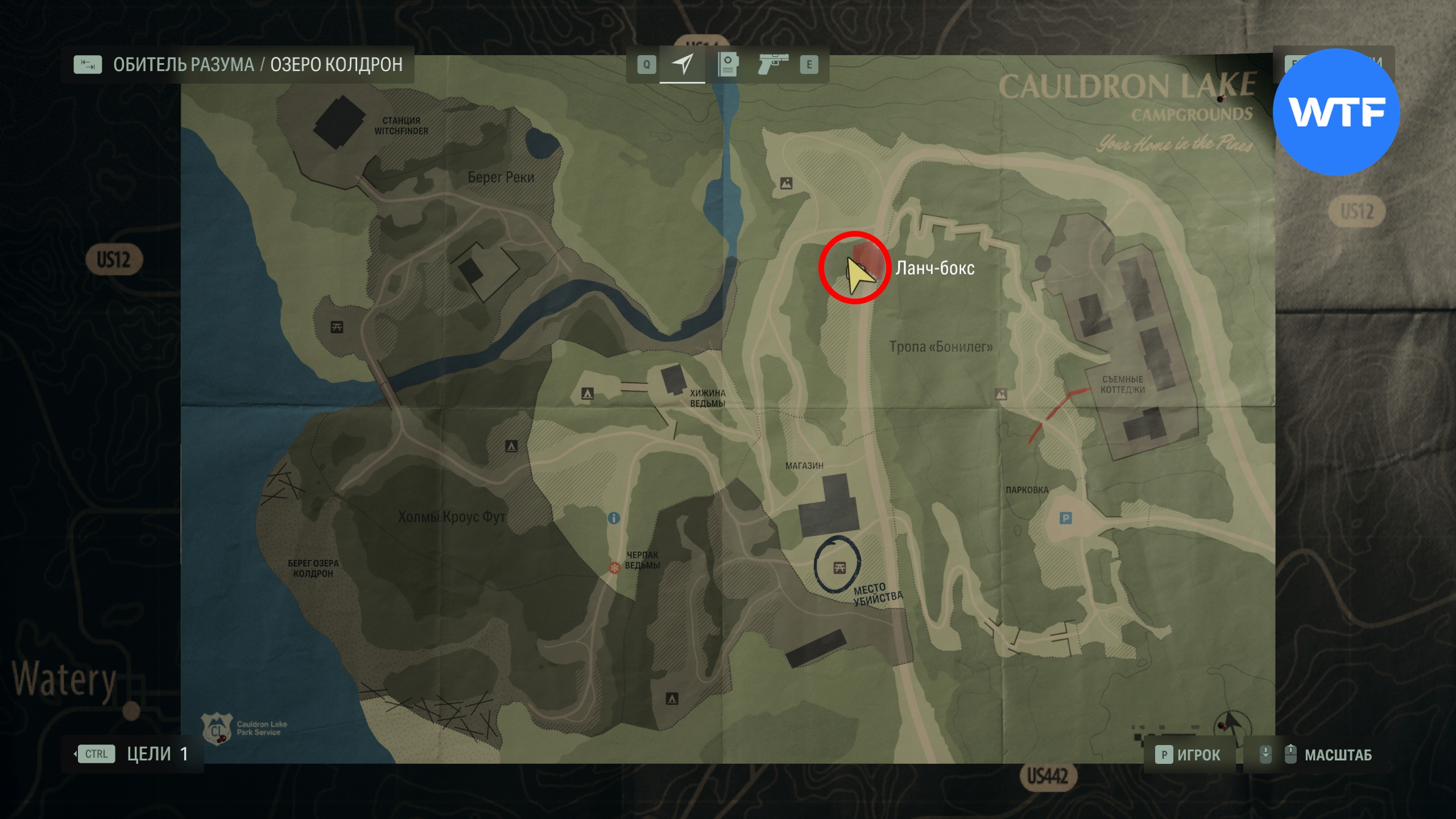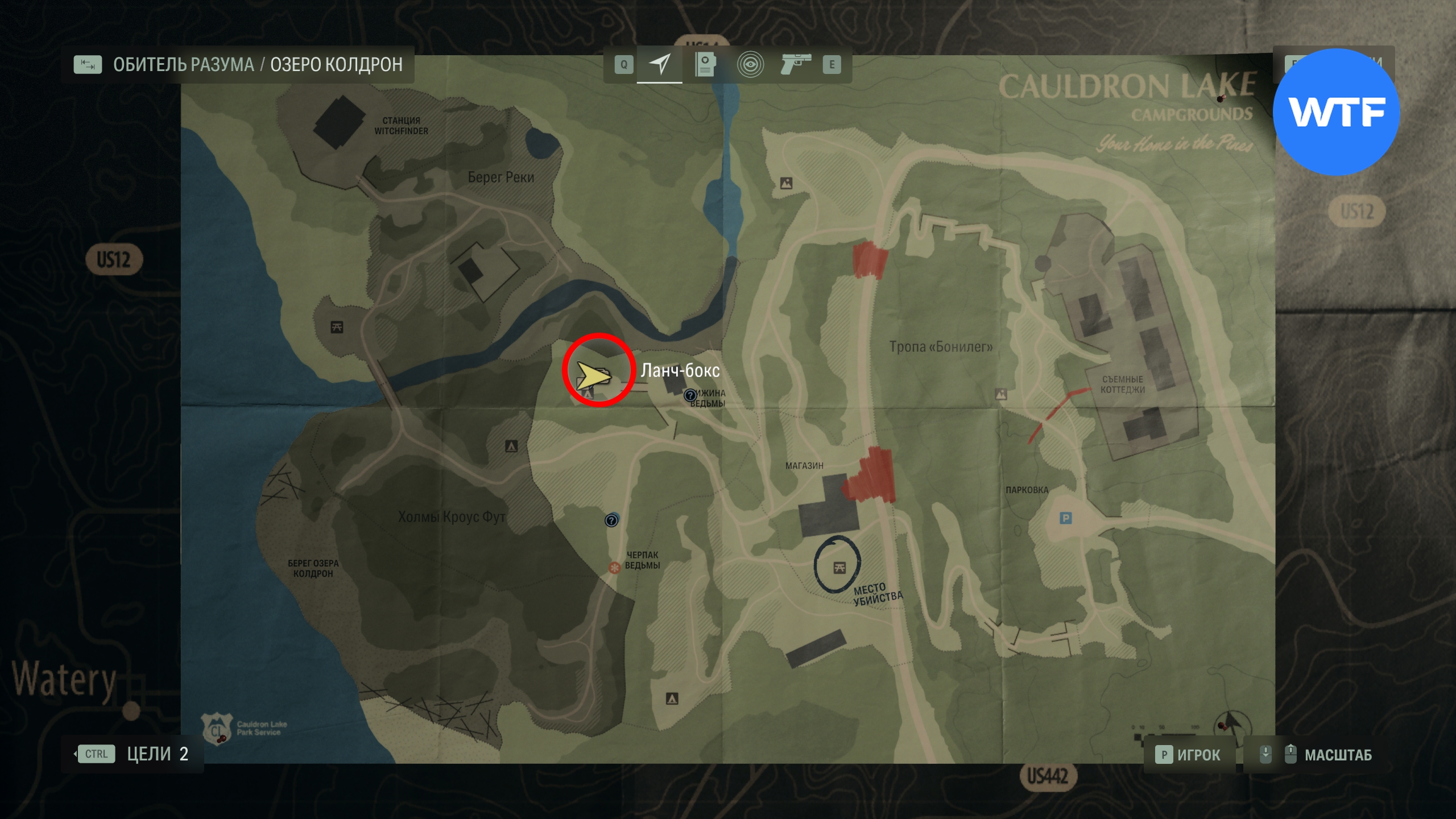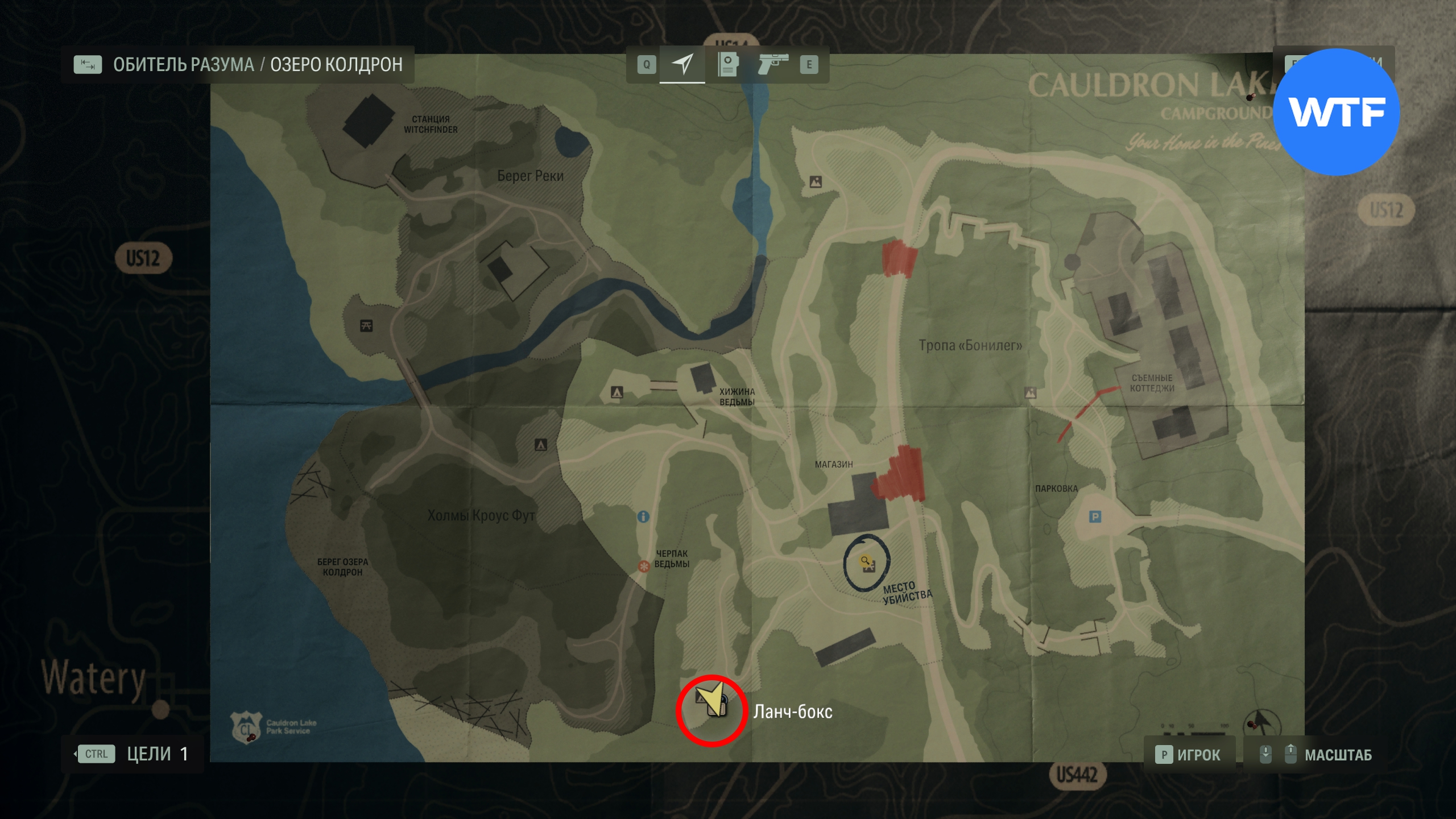 Снова вернитесь к месту убийства и на этот раз идите по тропинке на северо-запад к Хижине ведьмы. Пройдите по мостику слева от неё и увидите раскладное кемпинговое кресло и пару ящиков. Осмотрите кусты справа от дорожки, чтобы найти там коробку с этим ланчбоксом.
