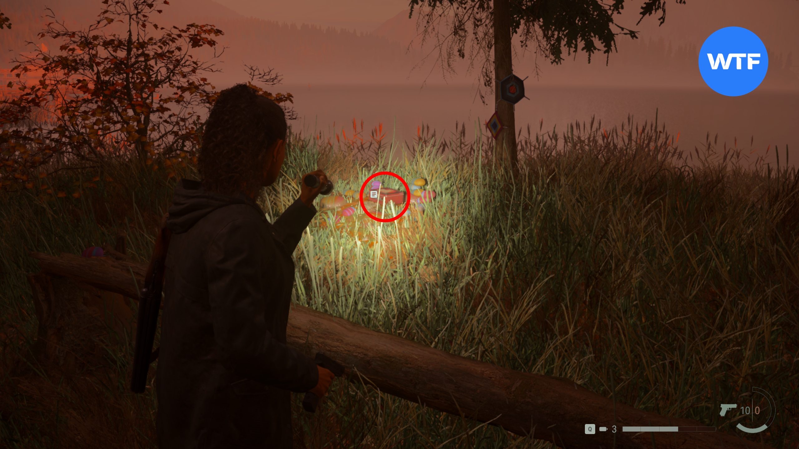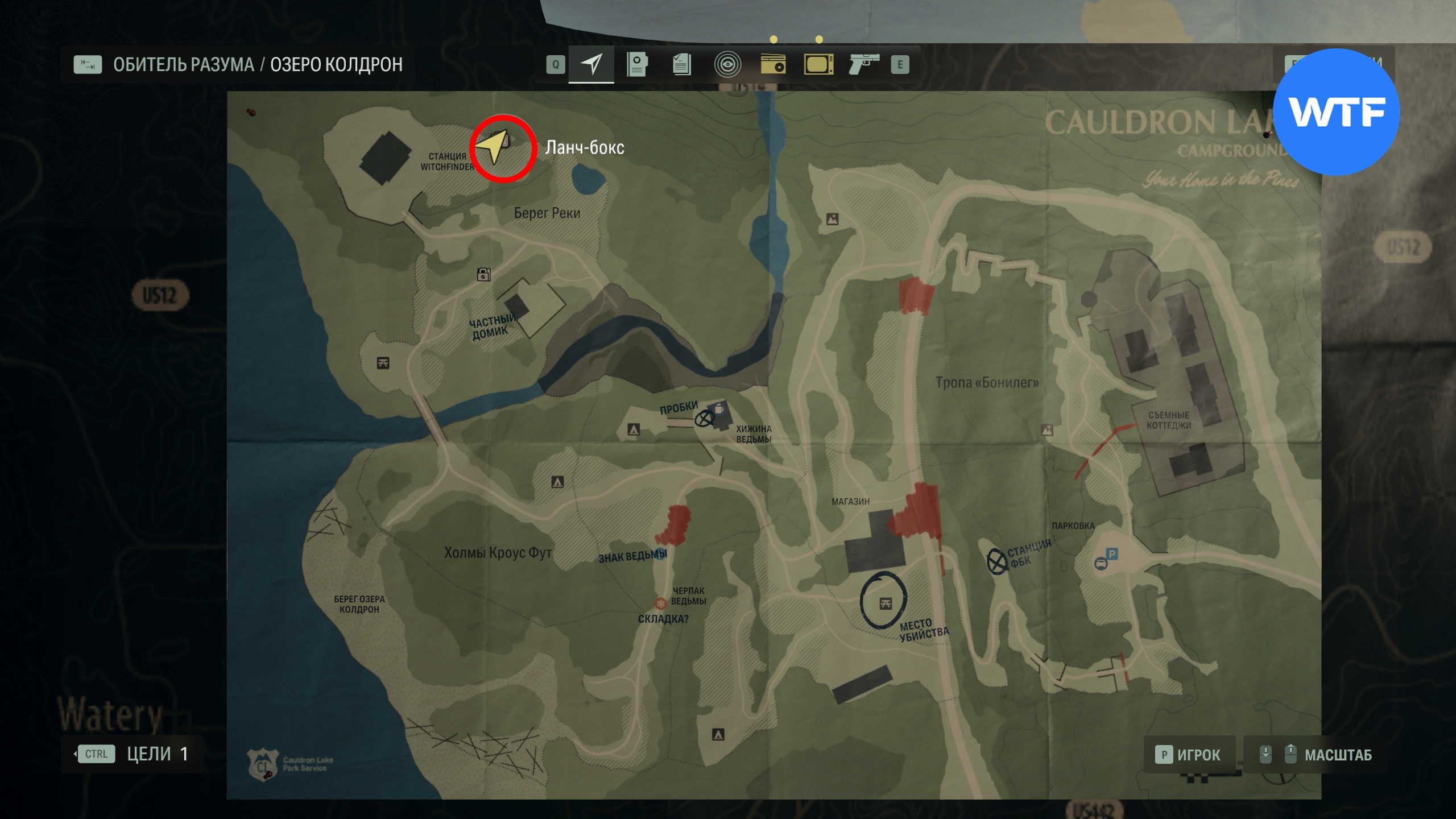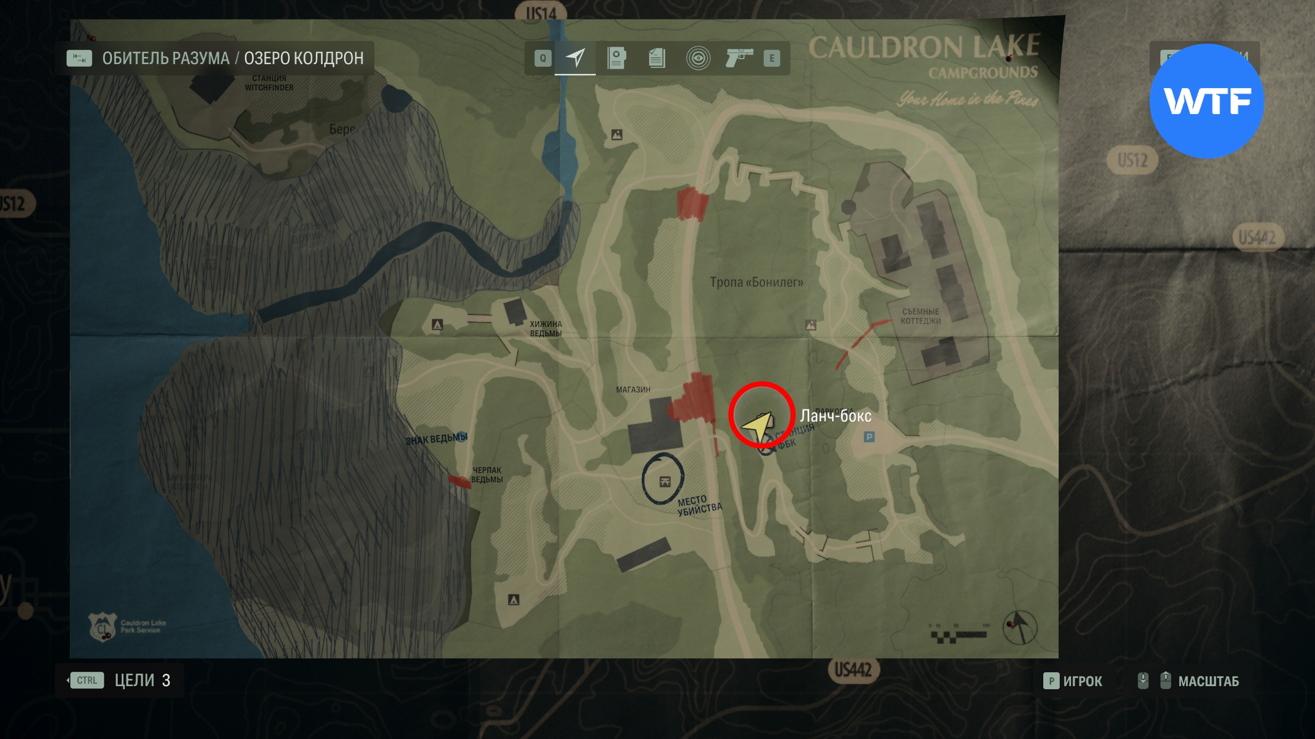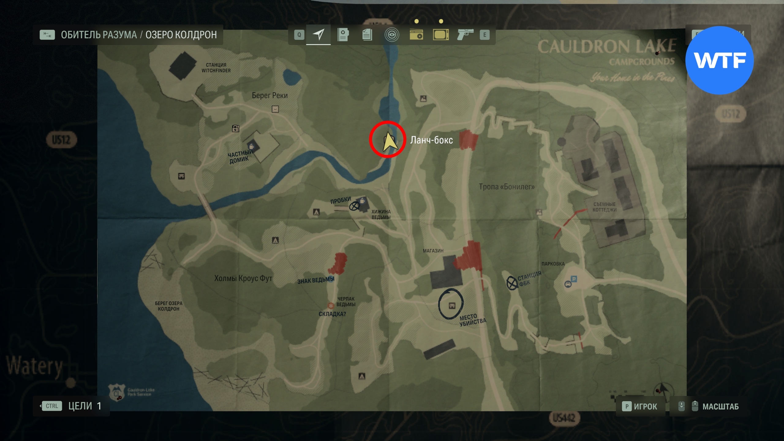 Снова вернитесь к месту убийства и на этот раз идите по тропинке на северо-запад к Хижине ведьмы. Пройдите по мостику слева от неё и увидите раскладное кемпинговое кресло и пару ящиков. Осмотрите кусты справа от дорожки, чтобы найти там коробку с этим ланчбоксом.