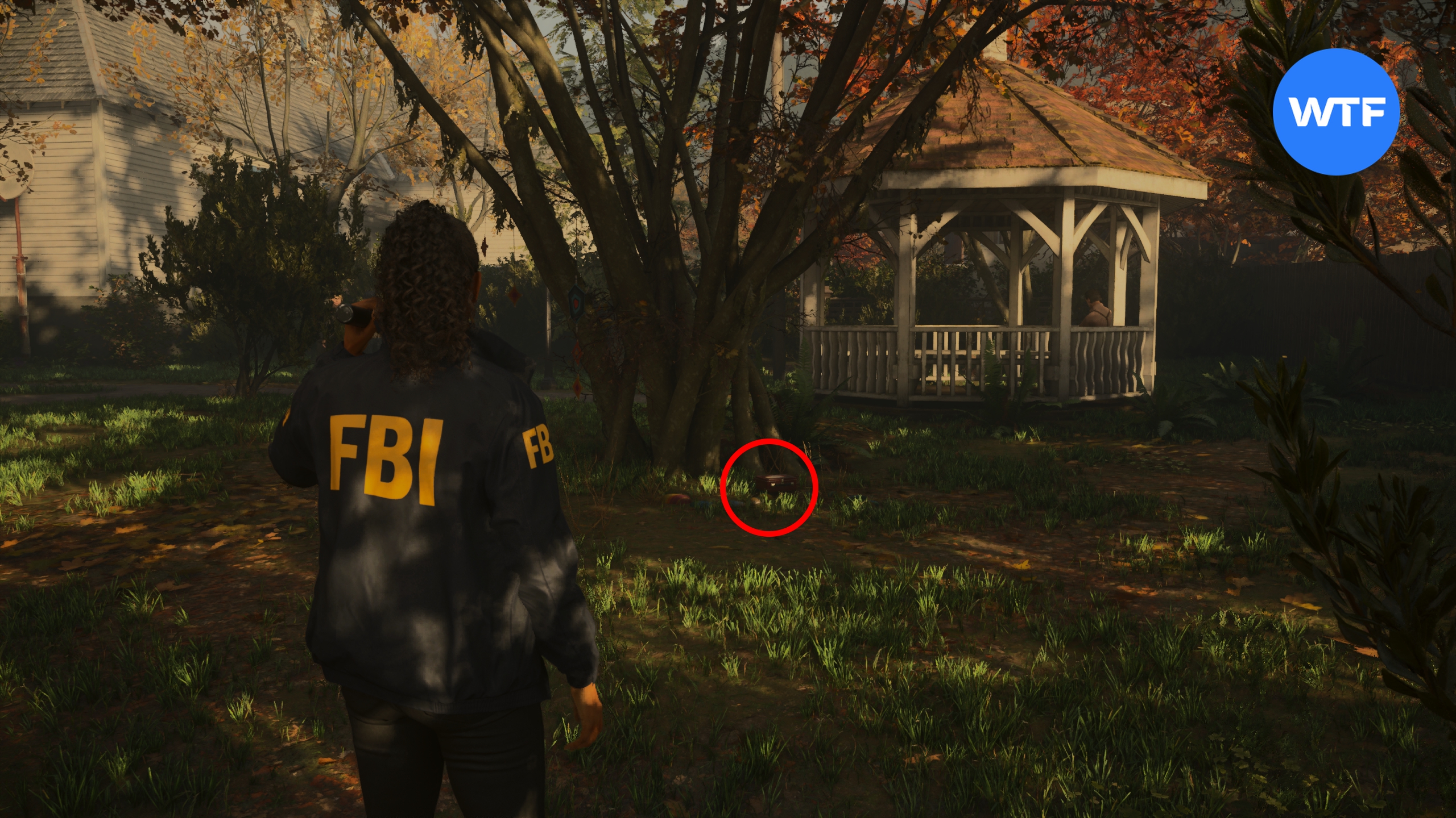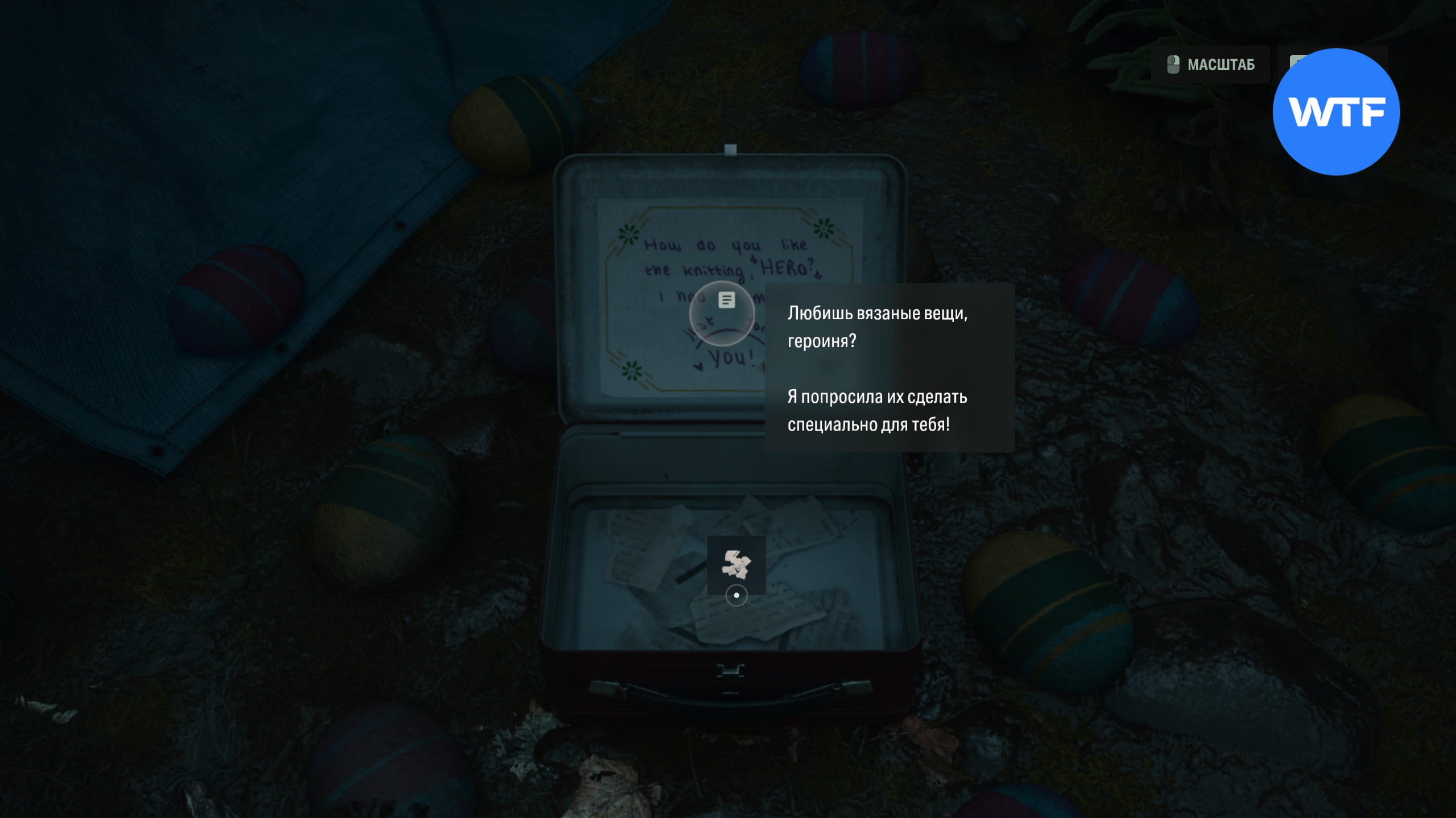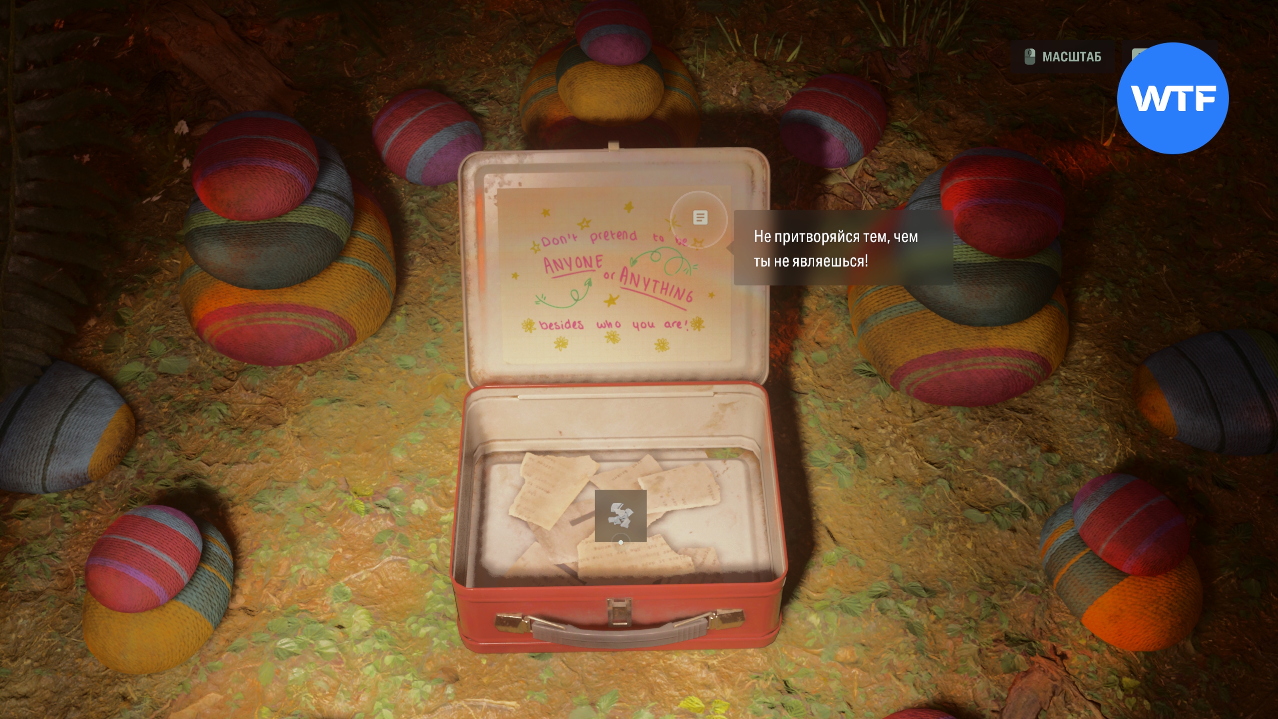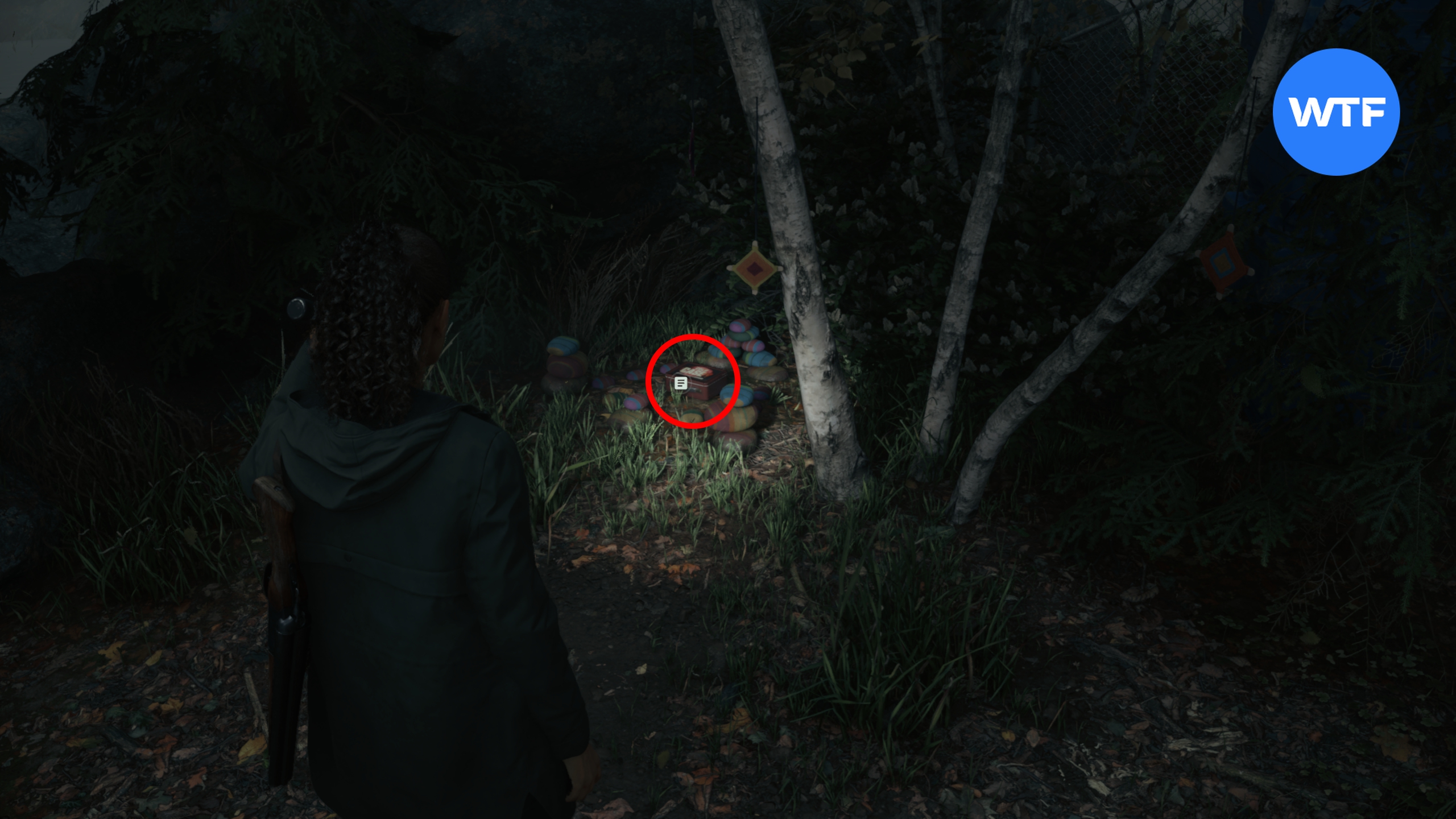 Снова вернитесь к месту убийства и на этот раз идите по тропинке на северо-запад к Хижине ведьмы. Пройдите по мостику слева от неё и увидите раскладное кемпинговое кресло и пару ящиков. Осмотрите кусты справа от дорожки, чтобы найти там коробку с этим ланчбоксом.