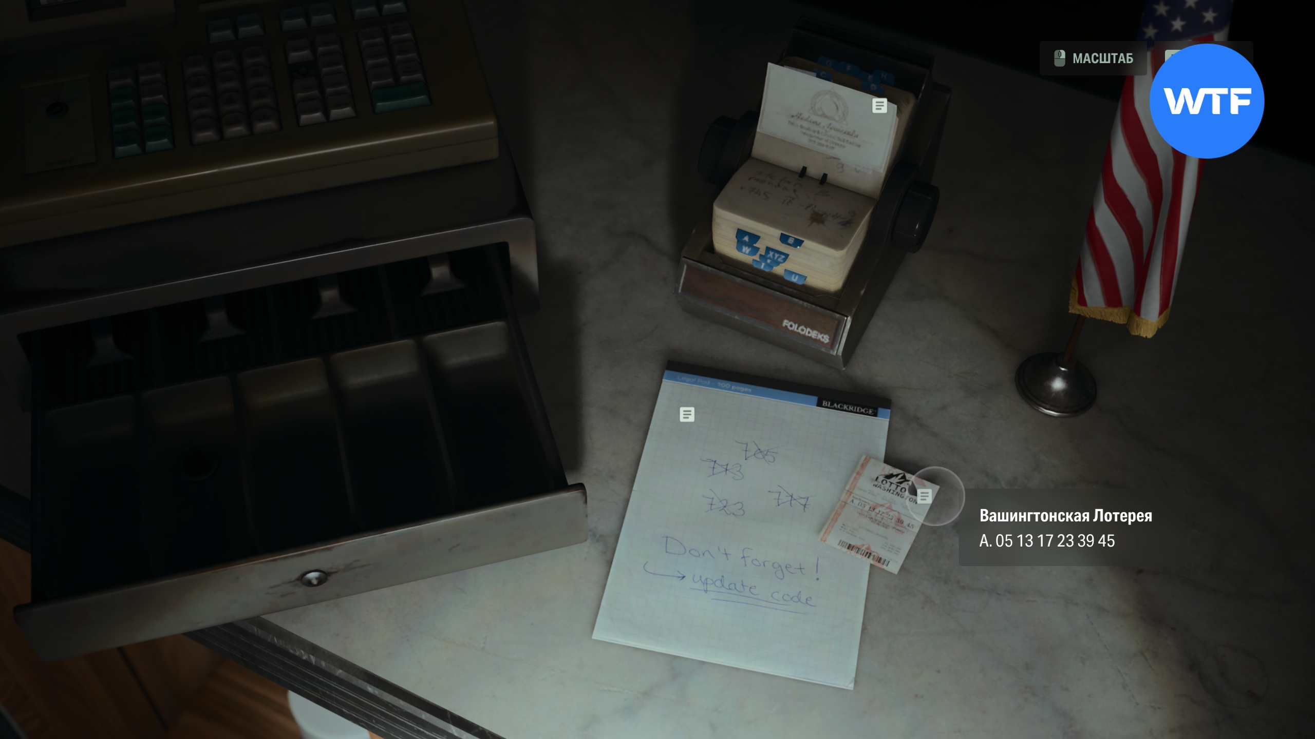 Другой интересный момент: все цифры, за исключением первой, по очереди взяты с билетика «Вашингтонской Лотереи», лежащего рядом с блокнотом.