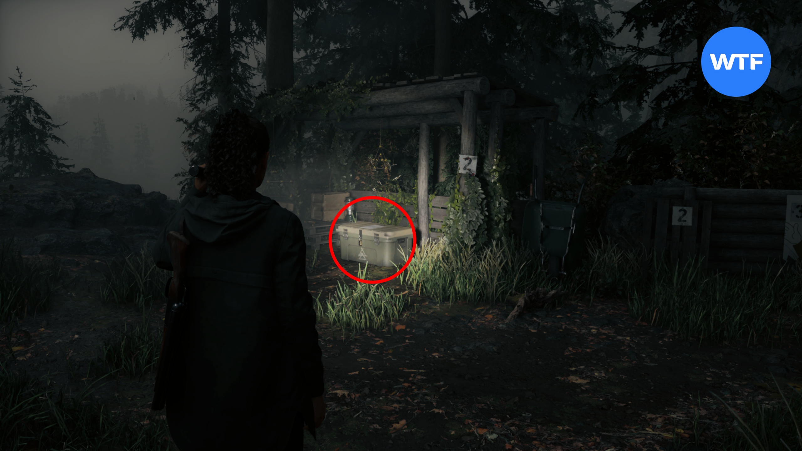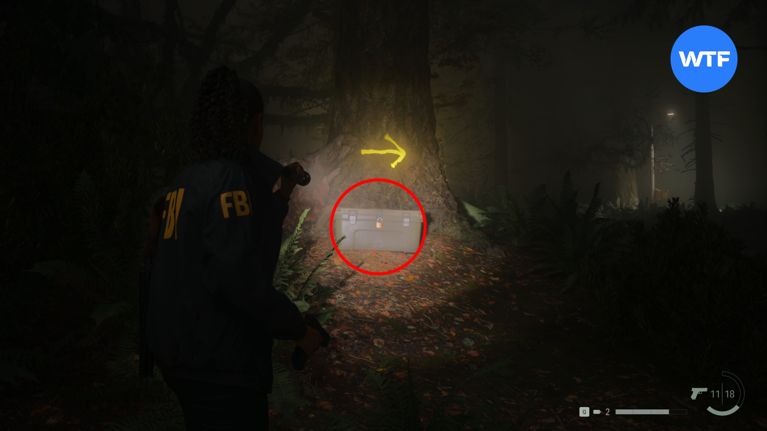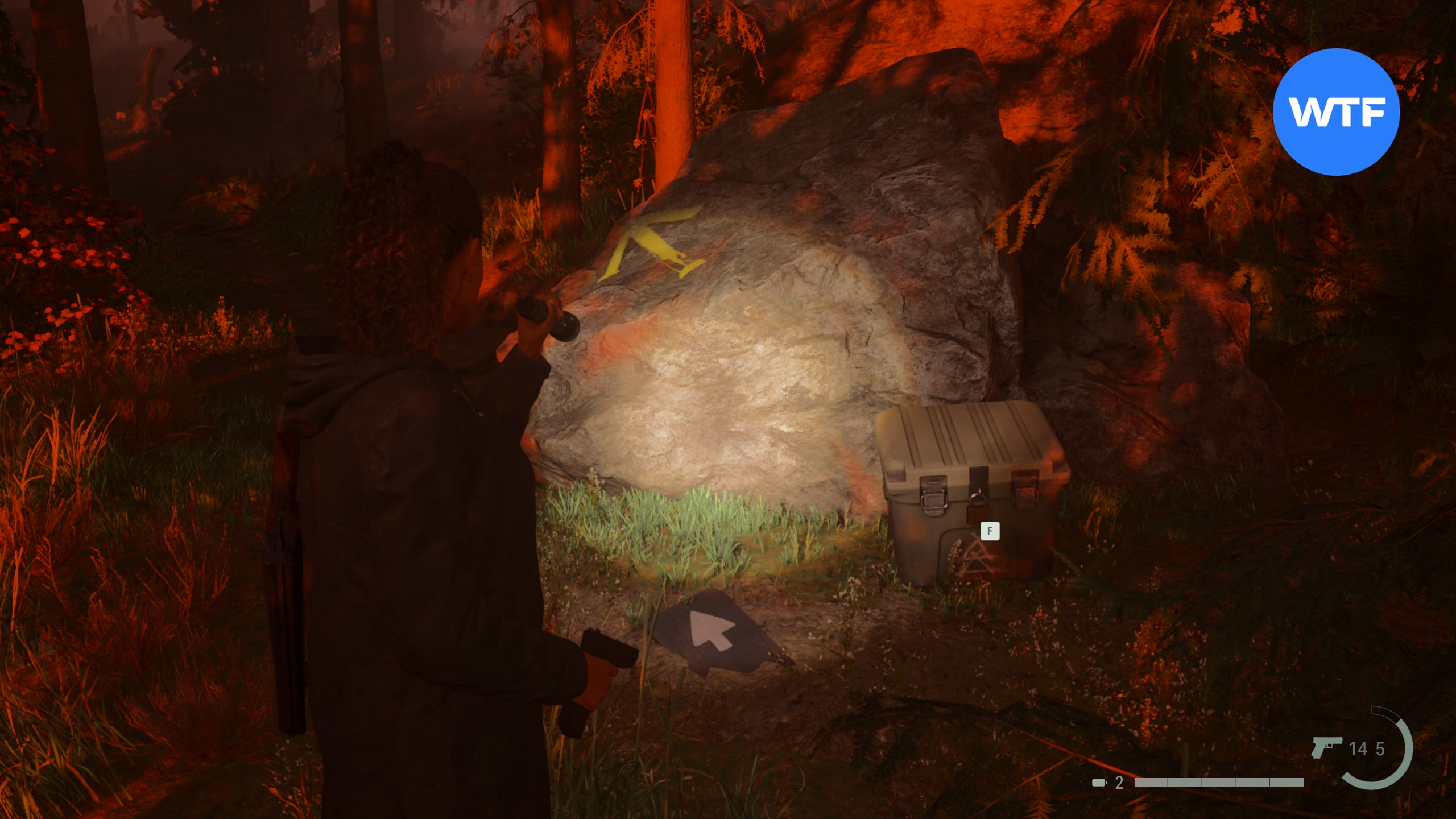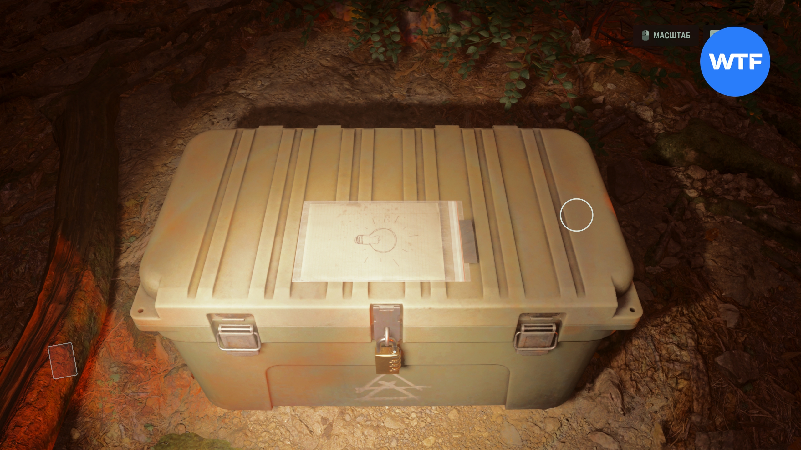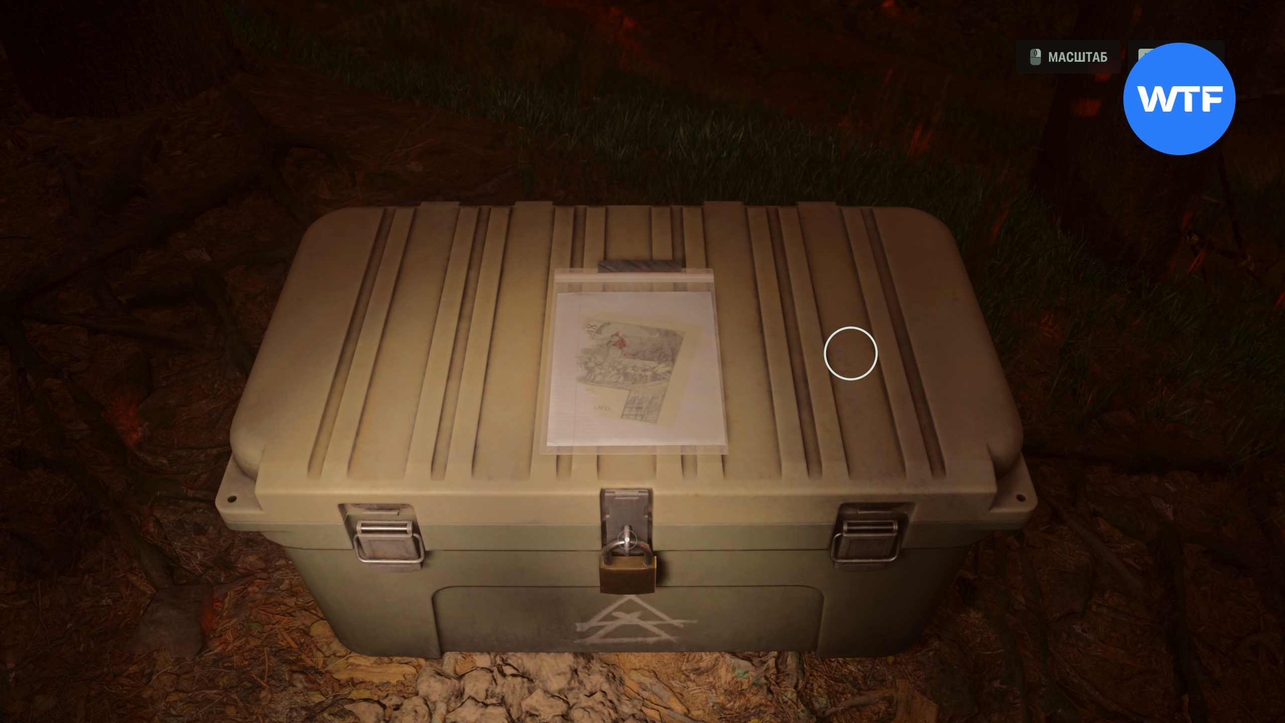 Следующий схрон культа вы найдете в лесу к северо-западу от станции рейнджеров, на холме. К крышке ящика прикреплено что-то вроде карты, на которую вам нужно ориентироваться при поисках ключа.