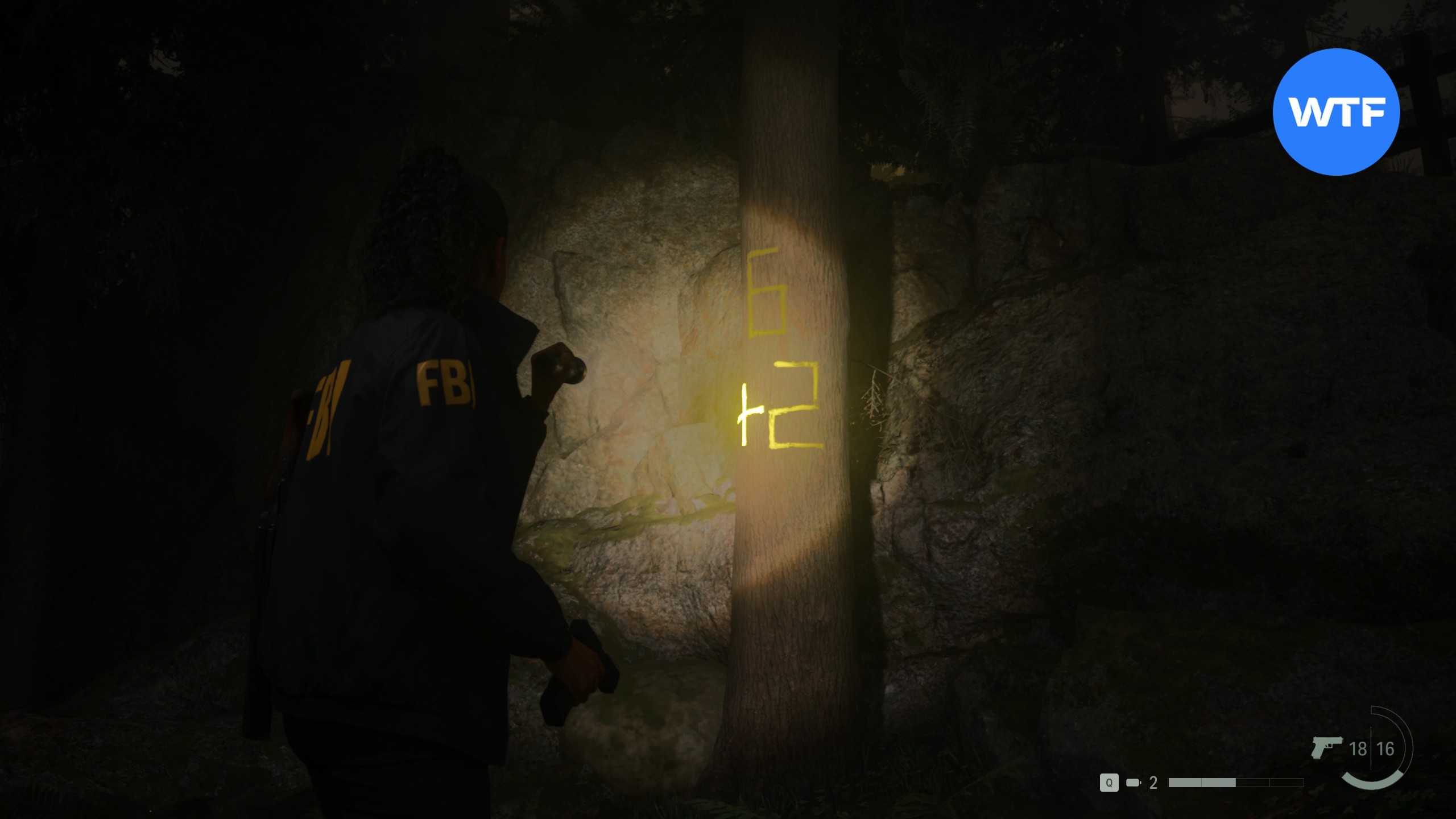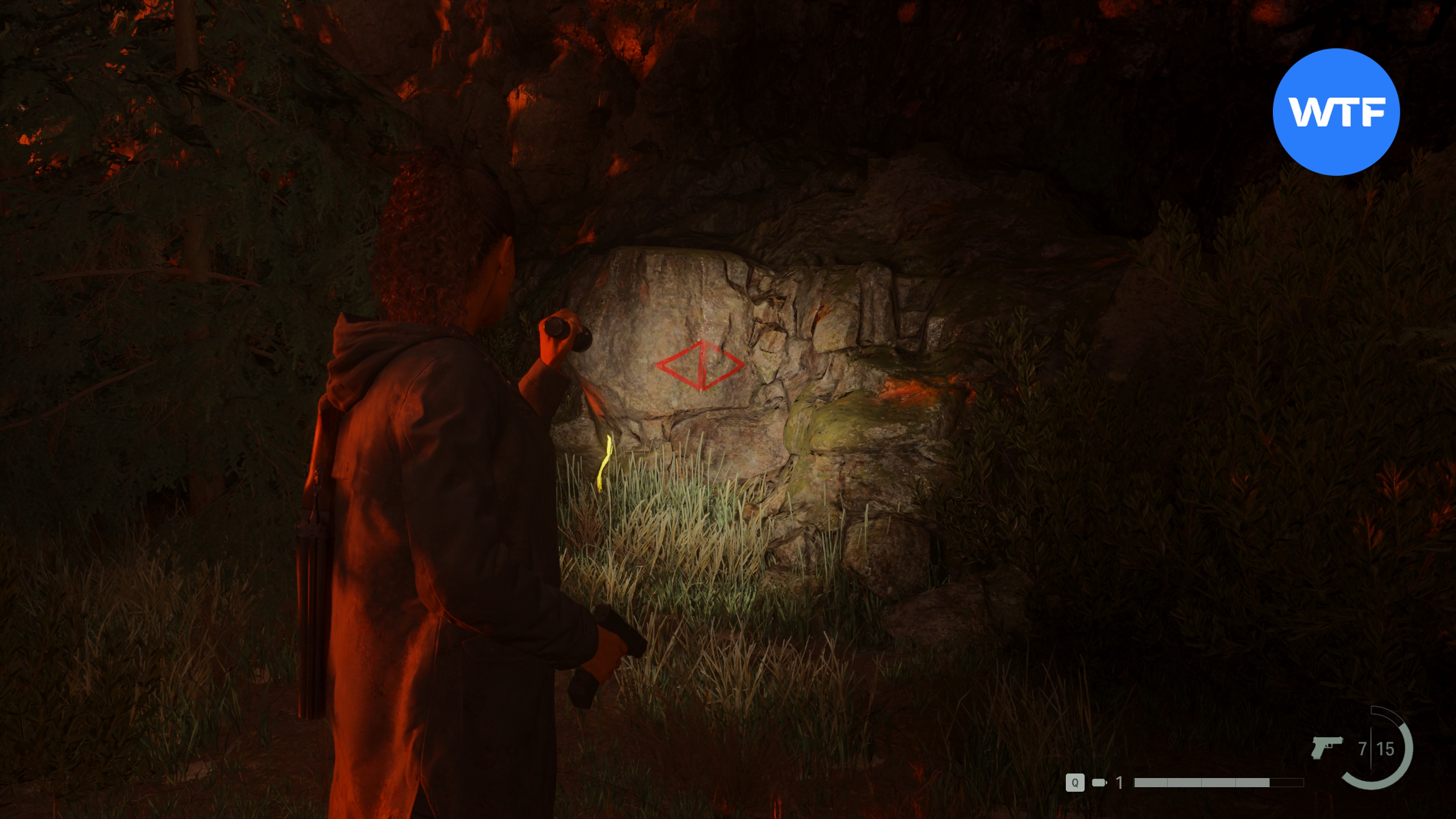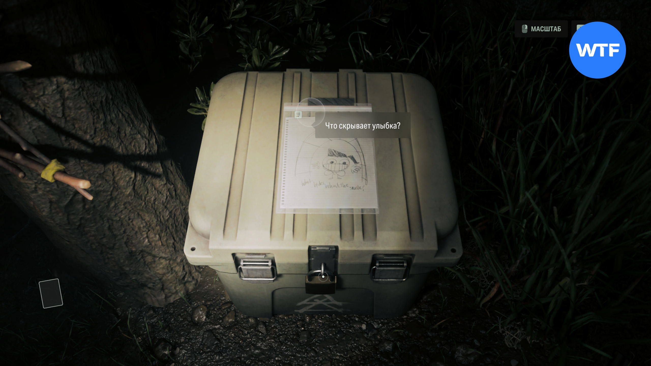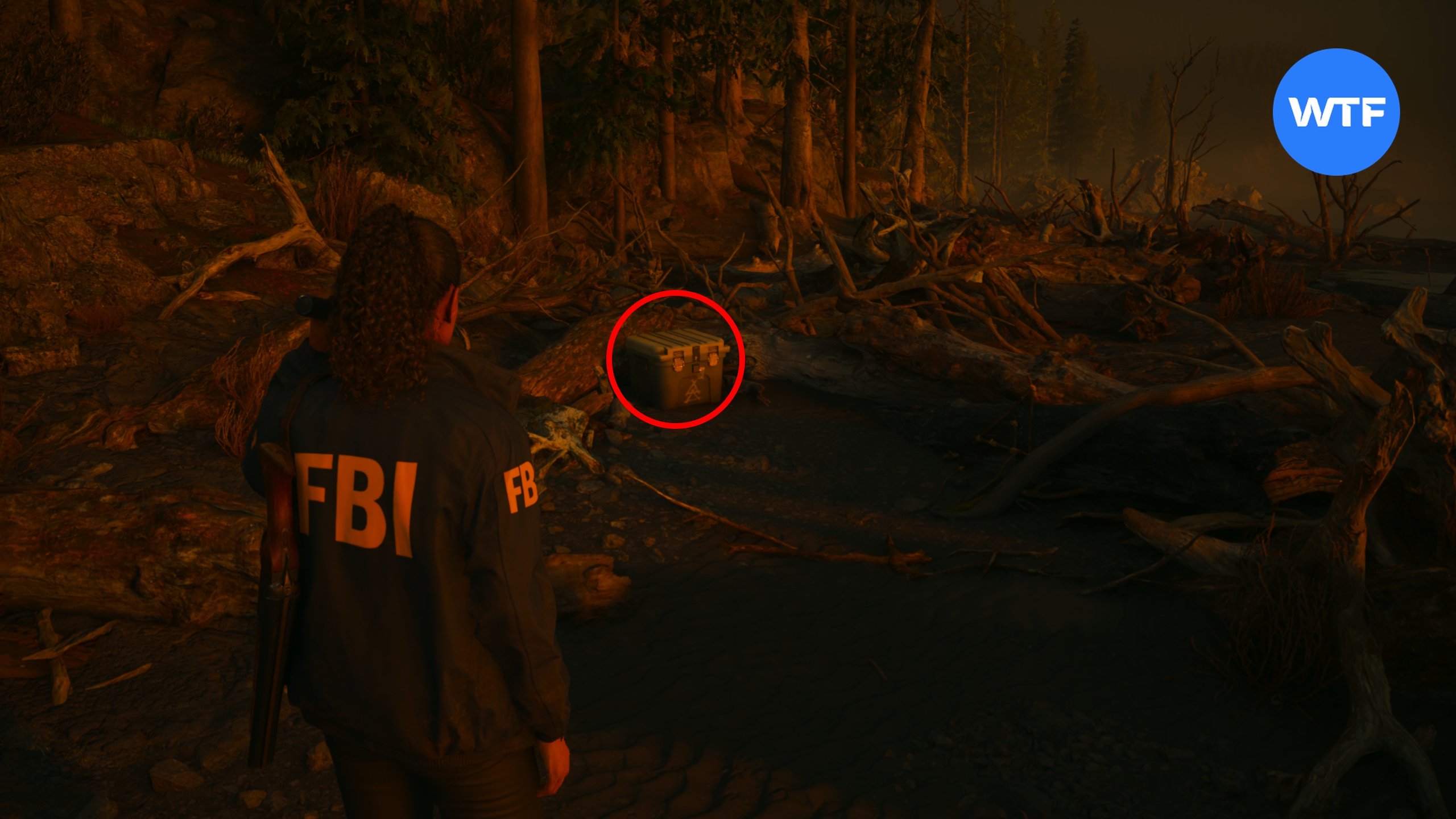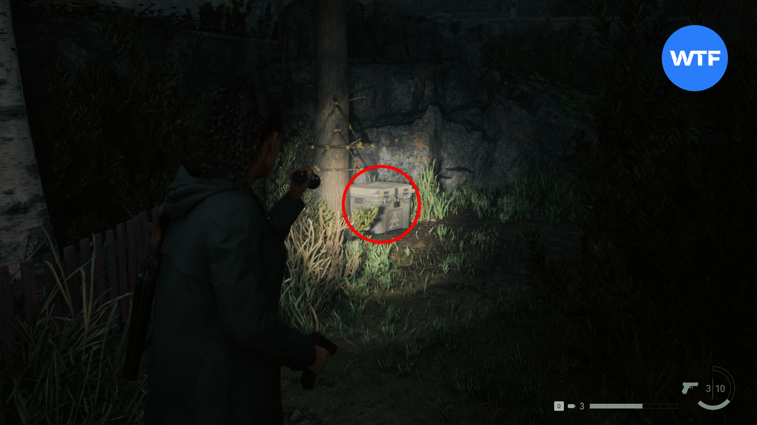 Следующий схрон культа вы найдете в лесу к северо-западу от станции рейнджеров, на холме. К крышке ящика прикреплено что-то вроде карты, на которую вам нужно ориентироваться при поисках ключа.