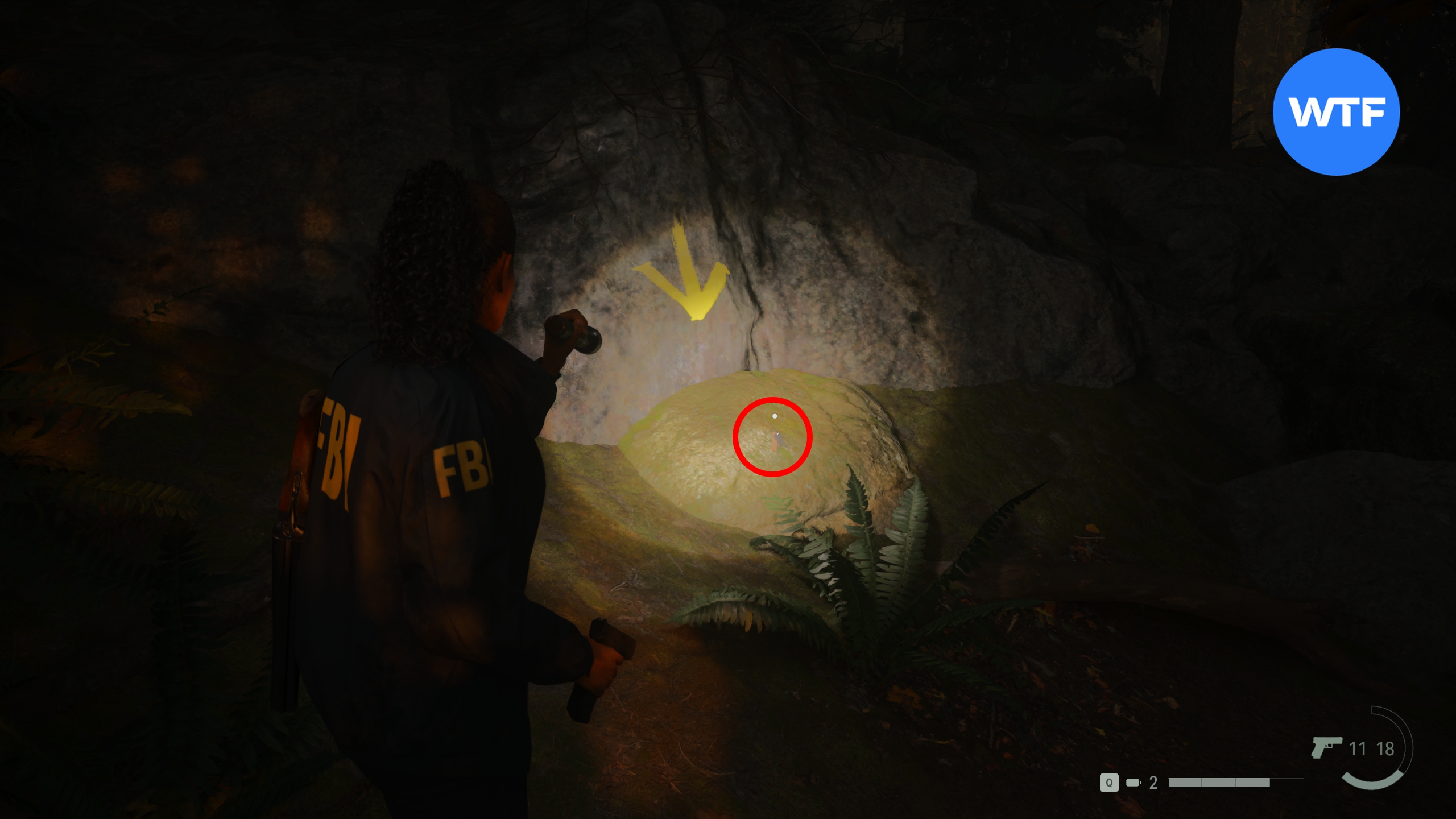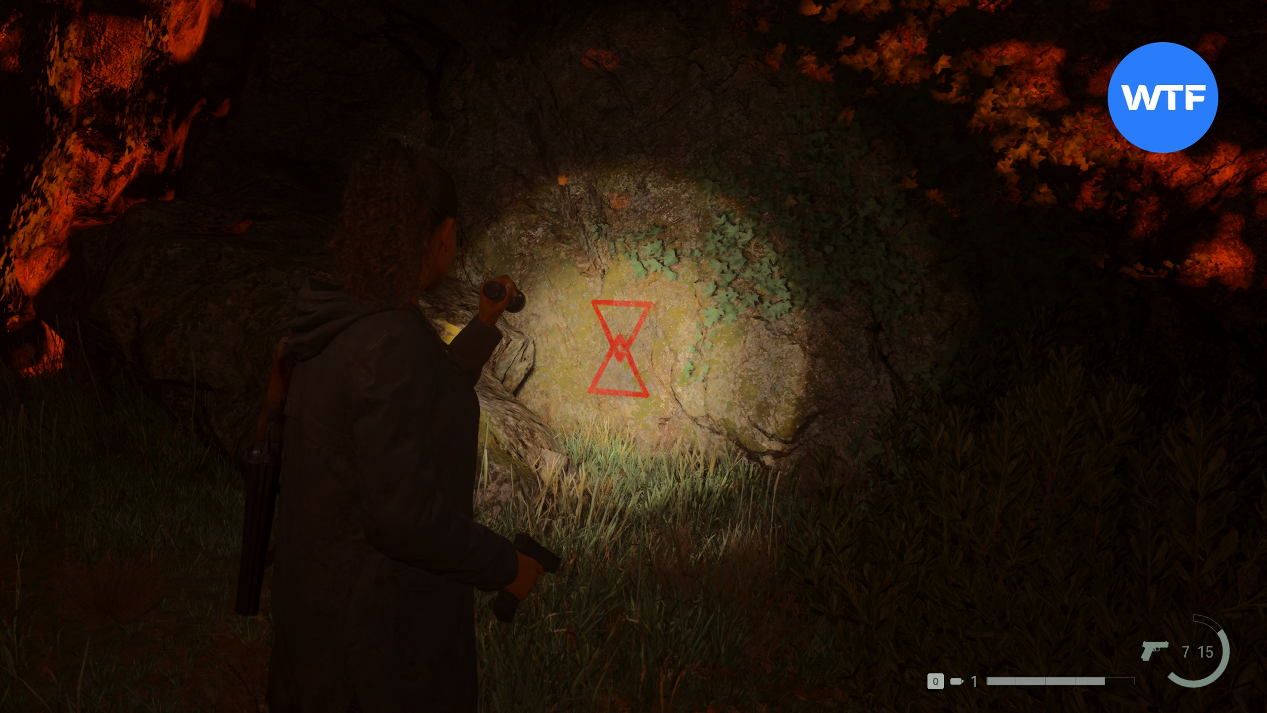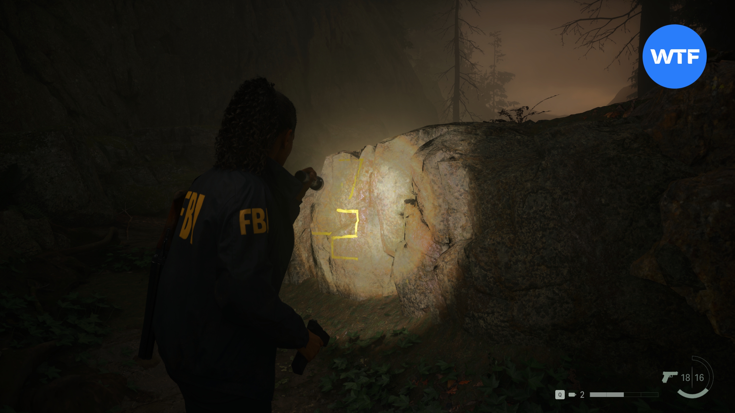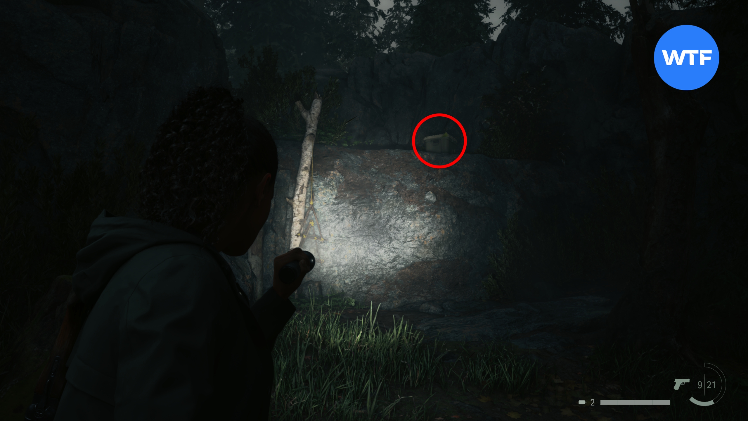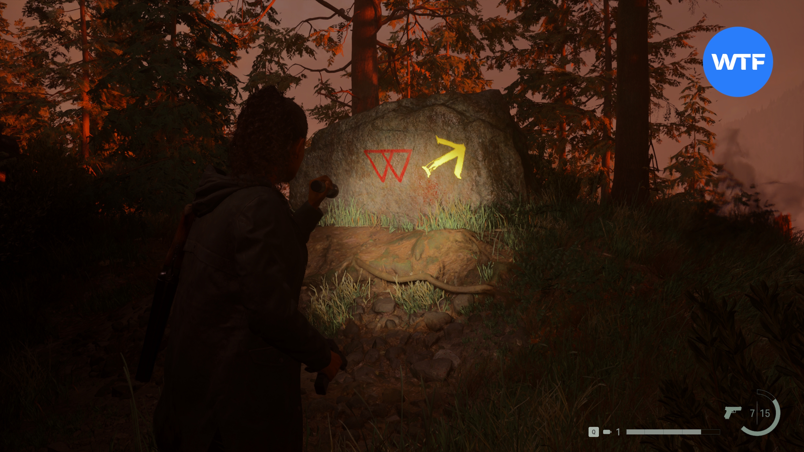 Следующий схрон культа вы найдете в лесу к северо-западу от станции рейнджеров, на холме. К крышке ящика прикреплено что-то вроде карты, на которую вам нужно ориентироваться при поисках ключа.