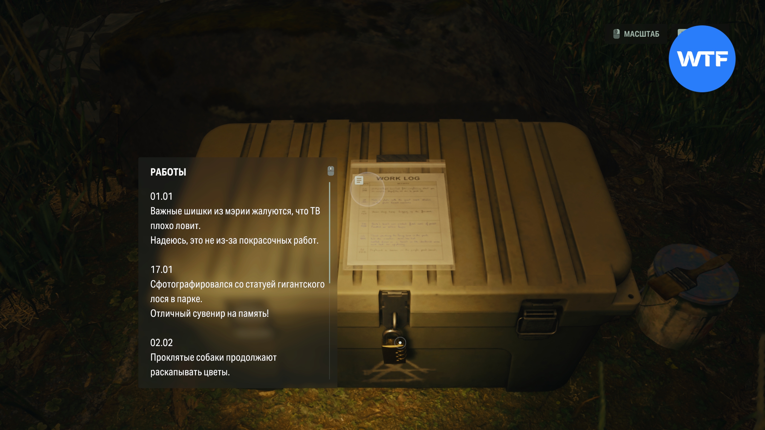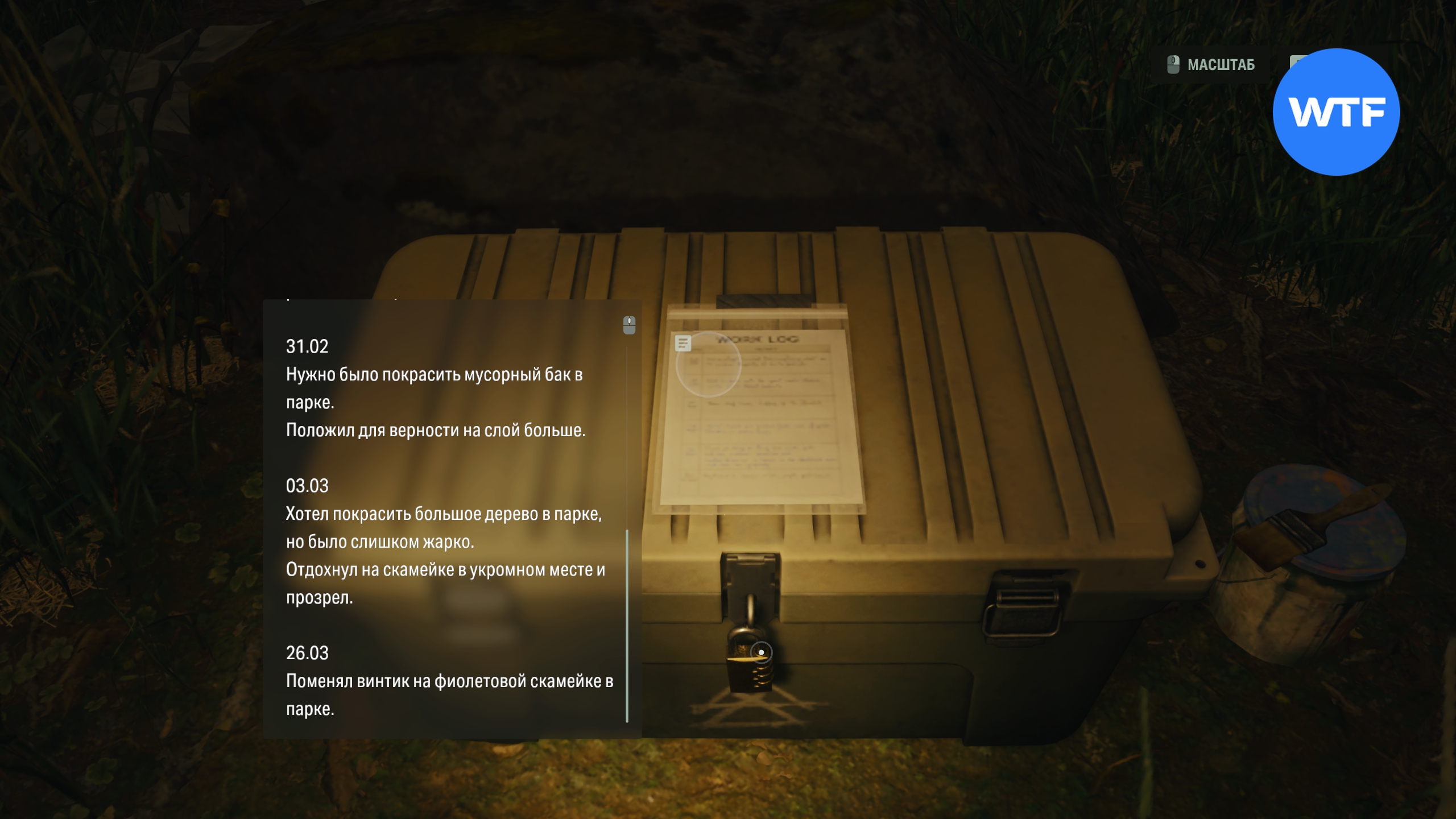 Ящик с этим тайником стоит в закрытом дворе к югу от управления шерифа. Вам понадобится болторез, чтобы срезать замок и попасть внутрь. Записка на крышке содержит длинный отчет о работах, но нам интересны только пункты под датами 01.01, 02.02 и 03.03: