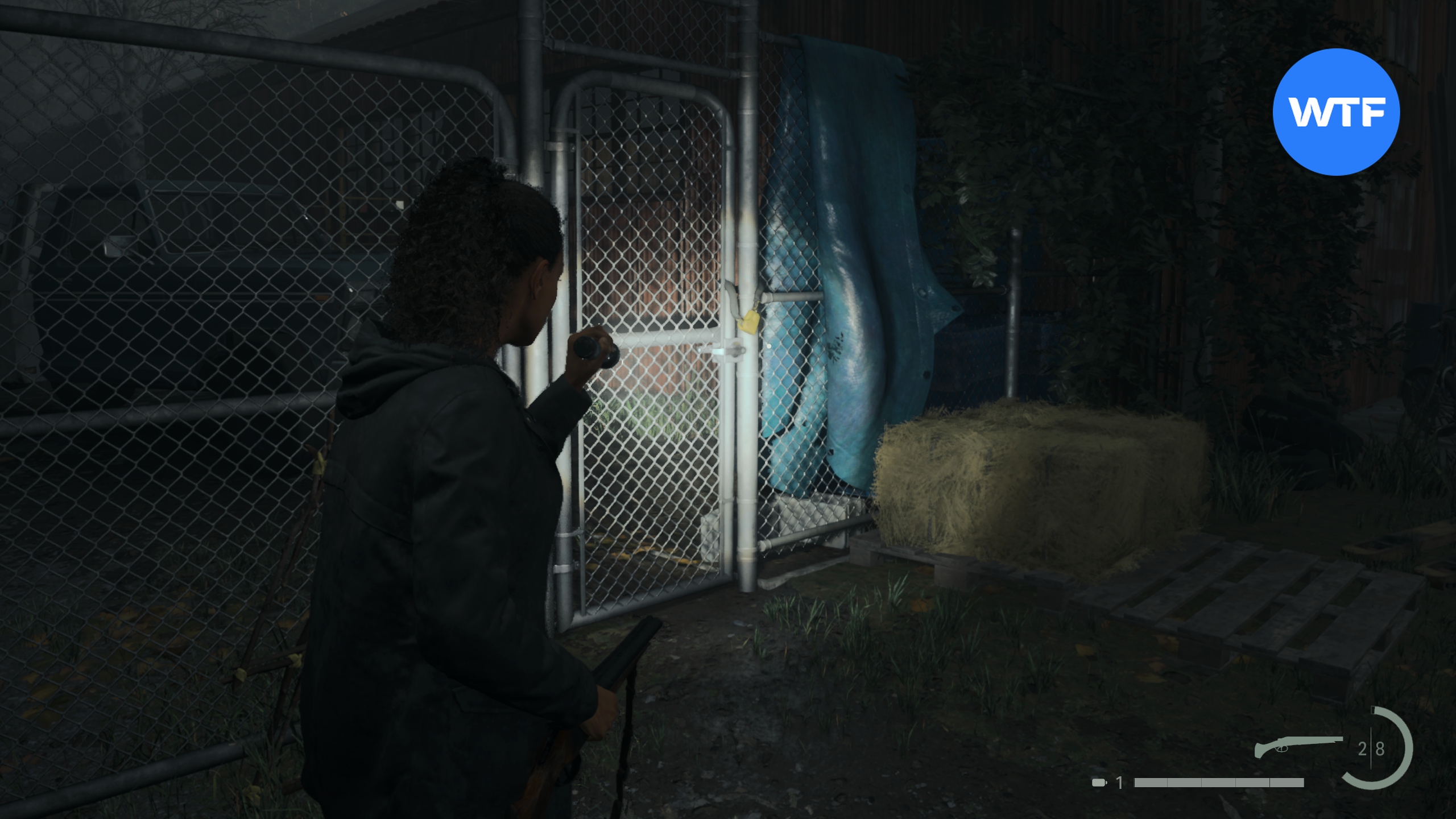 Впрочем, чтобы найти ключ от схрона у трейлеров далеко вам ходить не придется. Он висит на фонарном столбе в паре шагов к западу. Вам нужно поднять по деревянной доске, опирающейся на синий контейнер, чтобы до него добраться (см. скриншот 2).