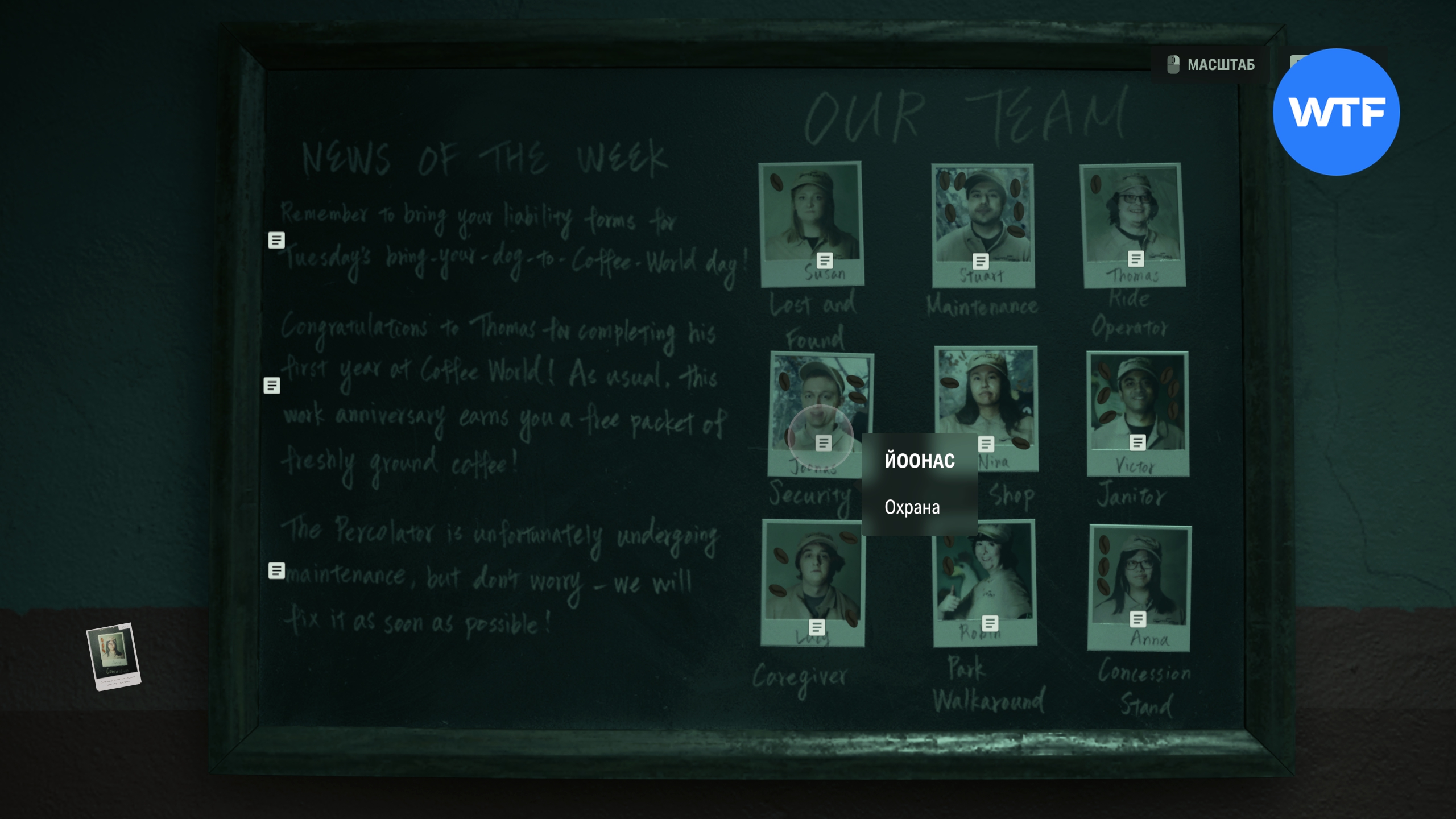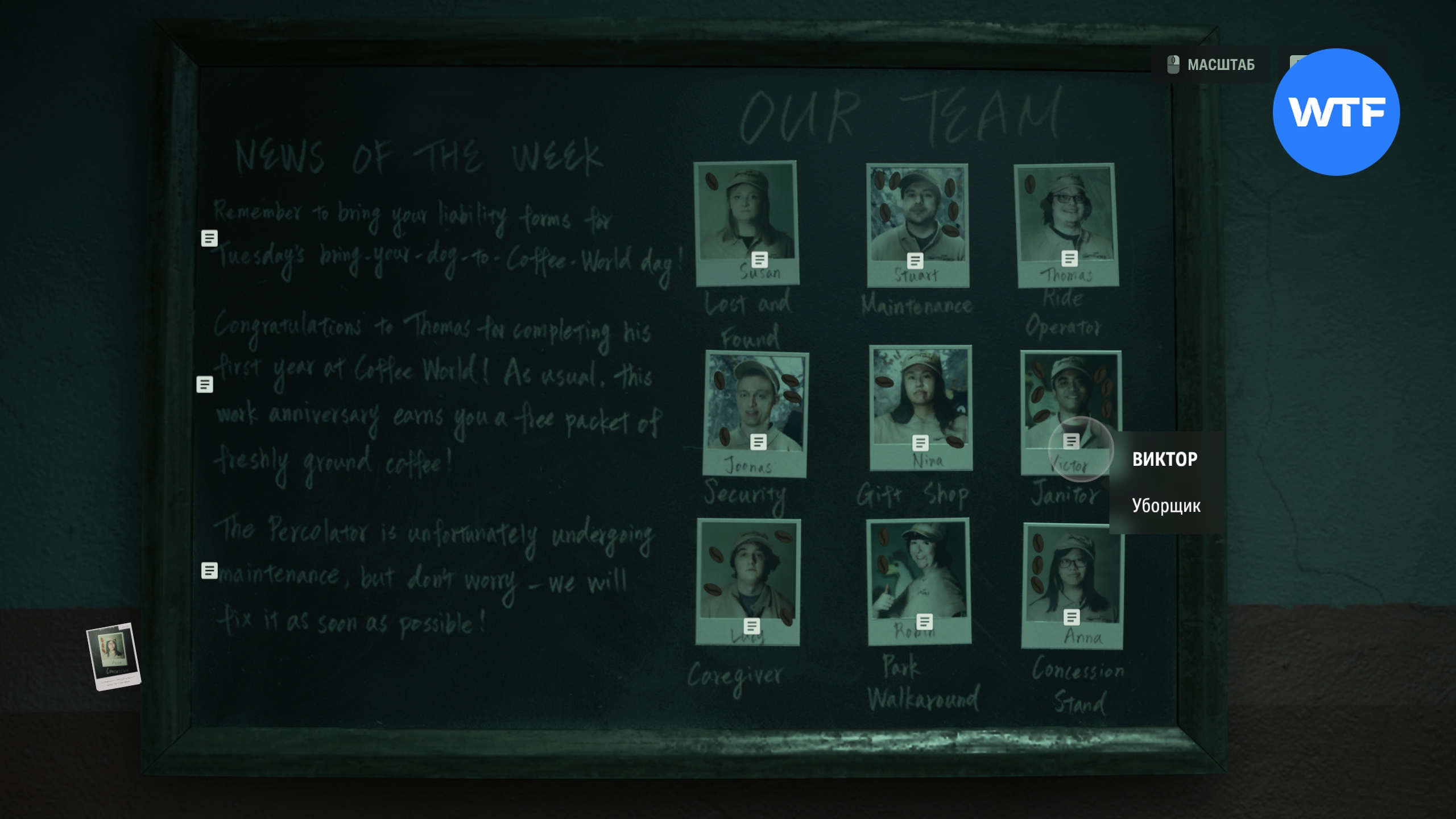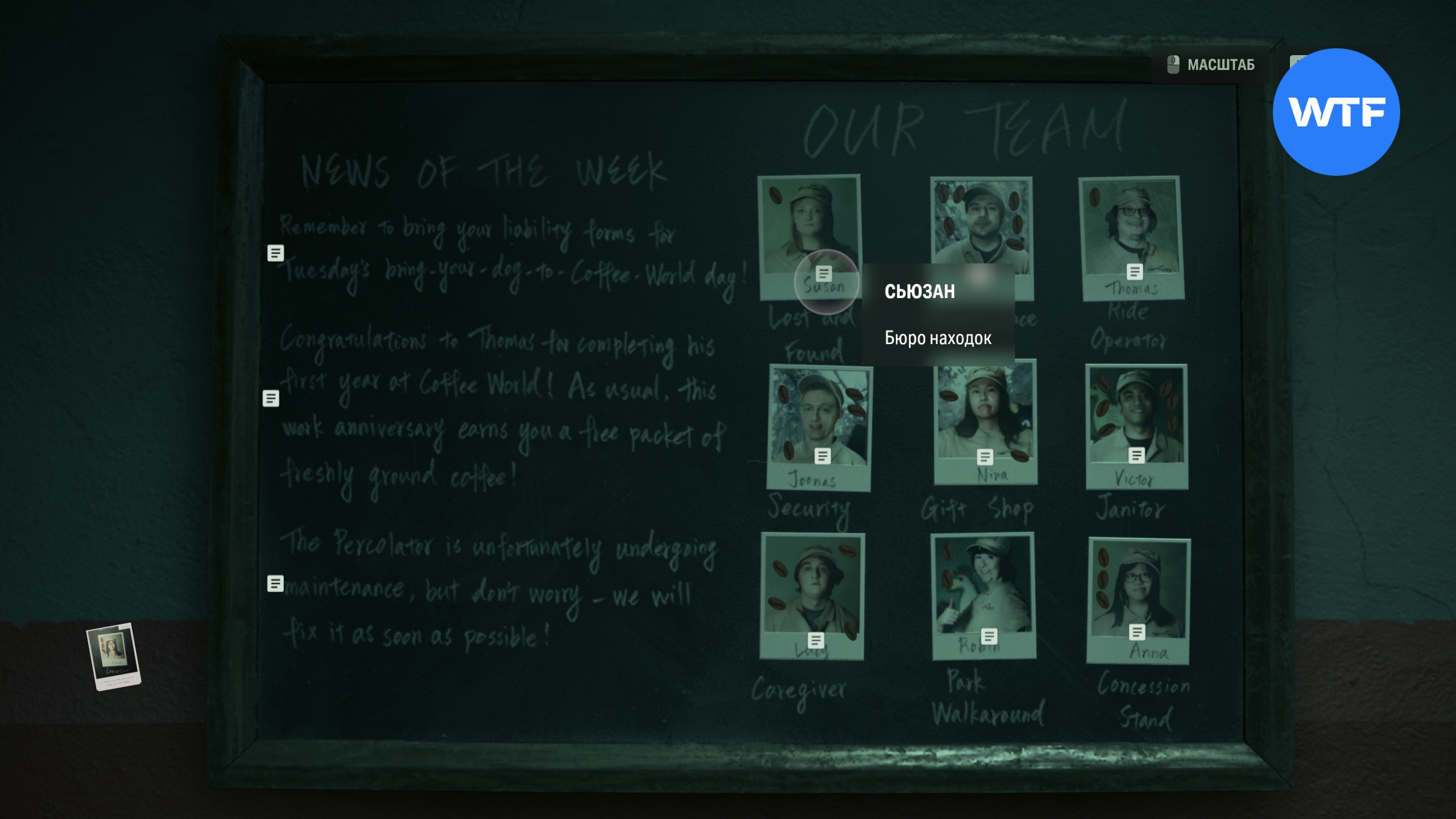 Осмотритесь: вам нужна доска с фотографиями сотрудников сувенирной лавки, она висит на одной из стен. Обратите внимание, что на каждом фото написана должность сотрудника, а также нарисовано несколько кофейных зернышек, что довольно странно. Из этих подсказок мы и составим пароль от сейфа.