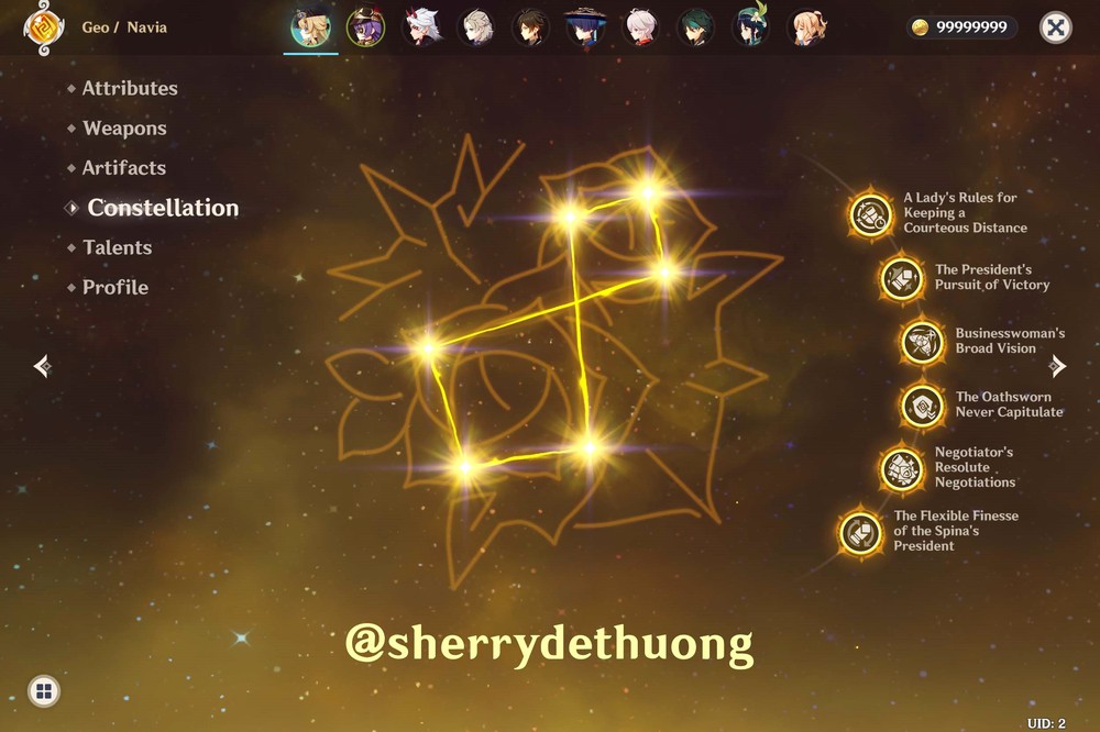 - 4 части: При использовании элементального навыка на 10 секунд наделяет эффектом Золотого сердца: бонус Гео урона увеличивается на 20%. Когда персонаж находится под защитой щита, созданного реакцией Кристалл, бонус Гео урона Золотого сердца дополнительно увеличивается на 150%. Через 1 секунду после потери щита это дополнительное увеличение бонуса исчезает.