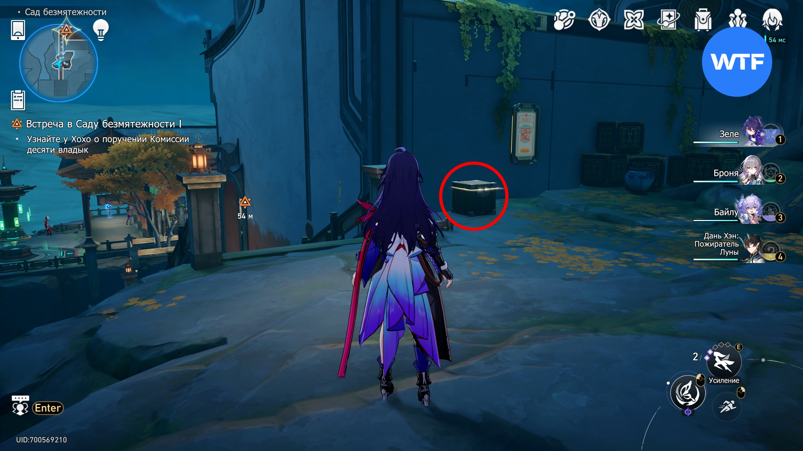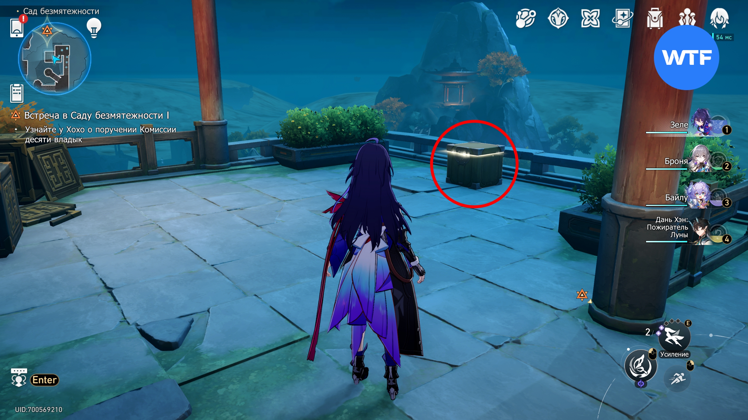 Начинайте двигаться по сюжетному маршруту и от телепорта «Выход на зеленую террасу» идите по проходу на запад. Первый обычный сундук будет стоять прямо на вашем пути, под навесом.