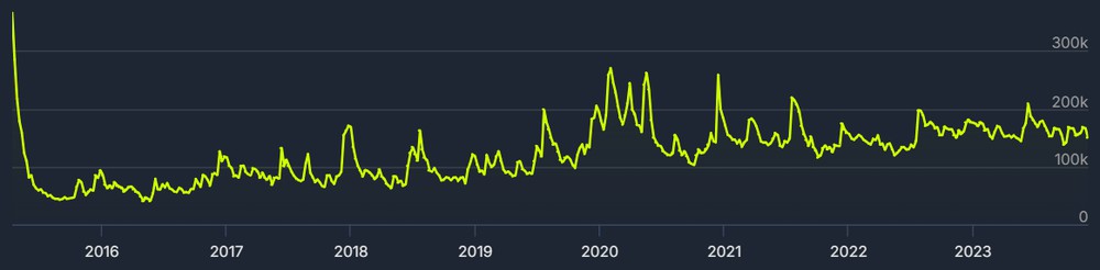 Во-вторых, даже через почти 10 лет после релиза ПК-версия GTA 5 пользуется завидной популярностью. Прямо сейчас в игре находятся по меньшей мере 120 тысяч человек, причем с годами онлайн скорее растет, чем падает.