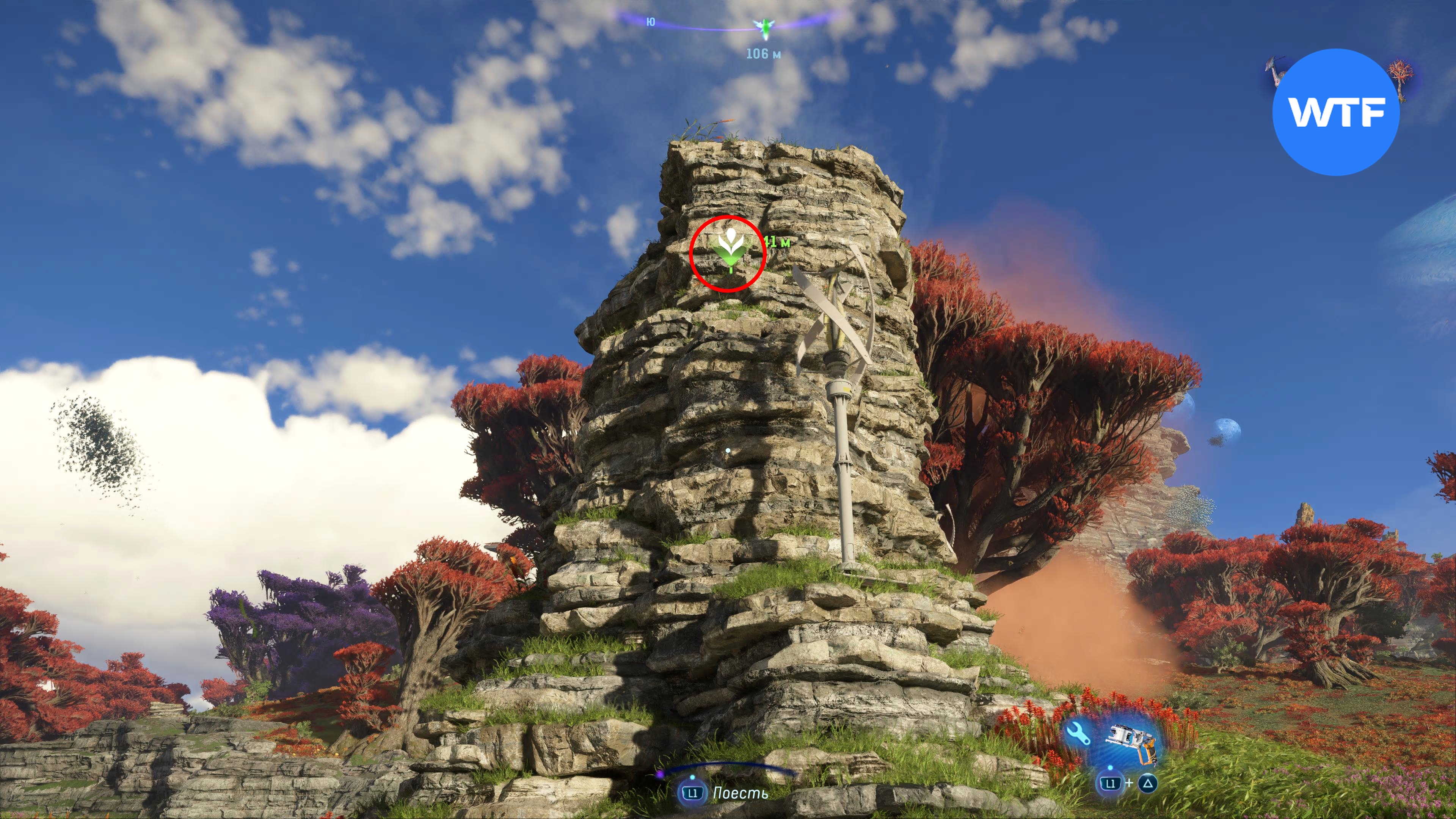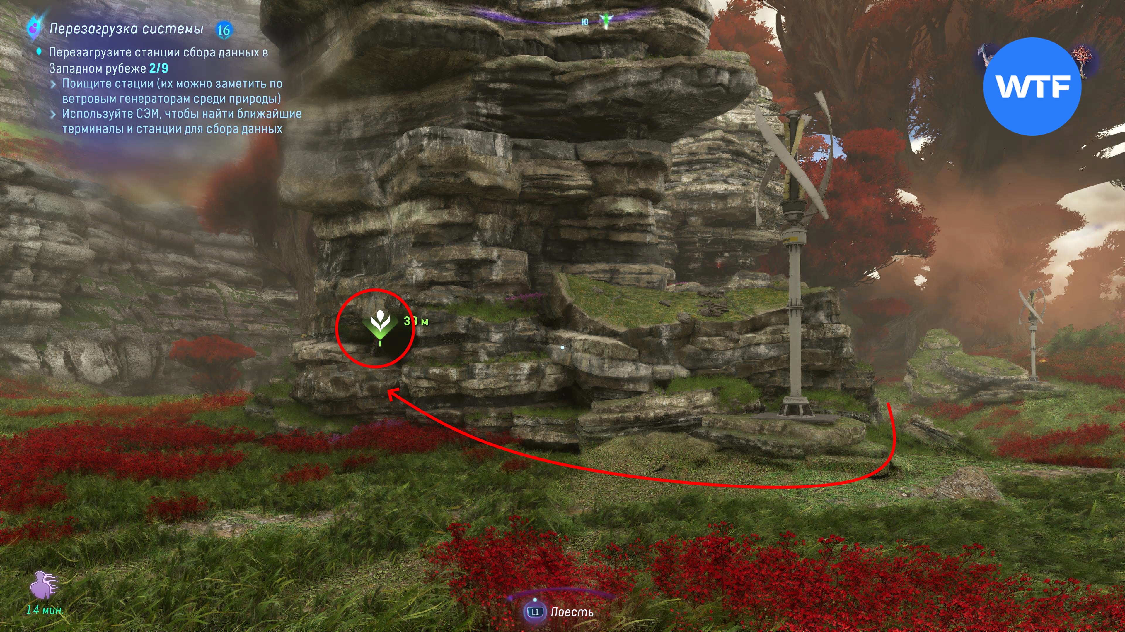 Теперь заберитесь наверх к этому ветряку и от него посмотрите в сторону красных деревьев вдалеке. Бегите в этом направлении и найдете последний датчик за камнями у обрыва.
