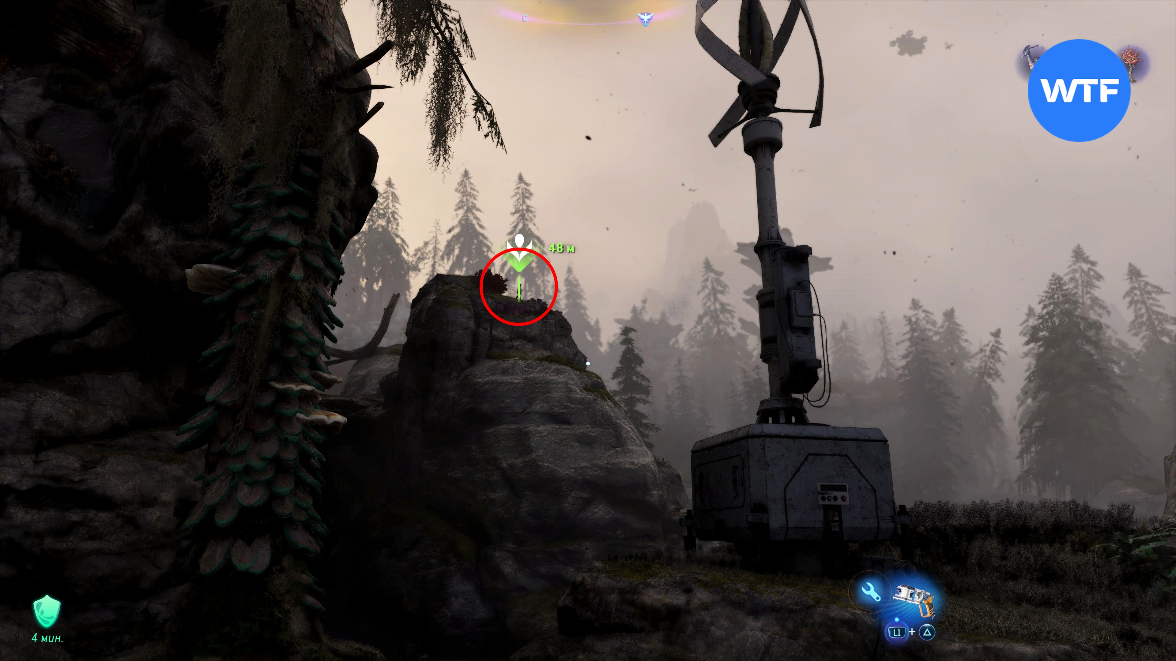 Вернитесь к терминалу и от него поднимитесь налево к ветряку. Пройдите немного вперед до дерева. С этого места вы можете заметить вдалеке лиану. Если пройти по бревну за ней — доберетесь до второго датчика.