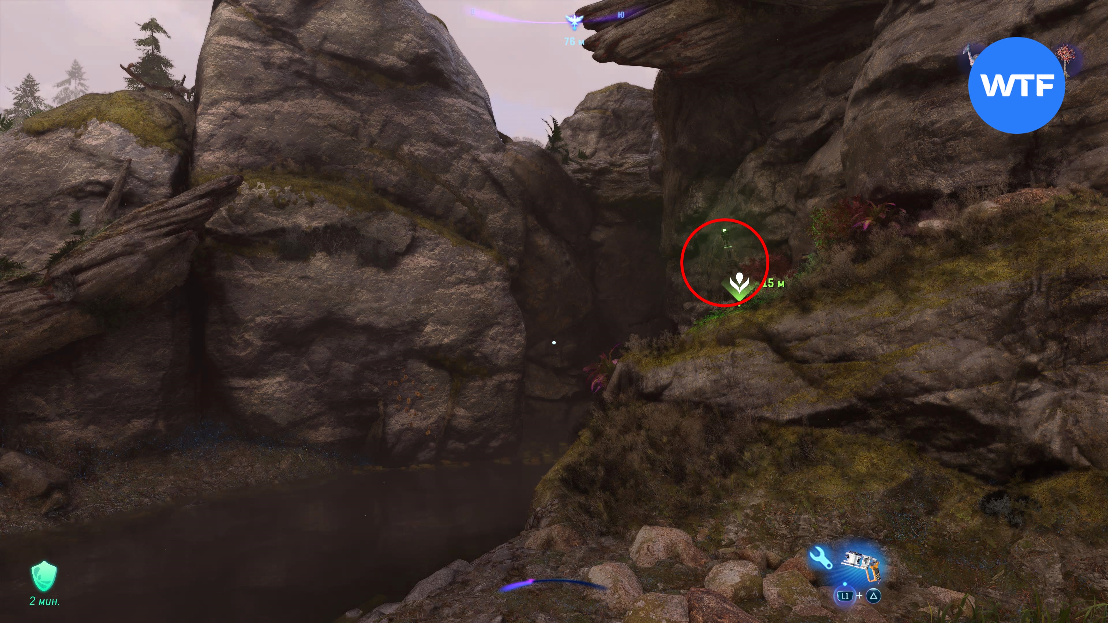Станьте лицом к терминалу и от него идите направо, огибая скалу и продолжая идти к следующей. Напротив водоема и деревьев с плодами дапофета, в расщелине среди камней, вы найдете первый датчик.