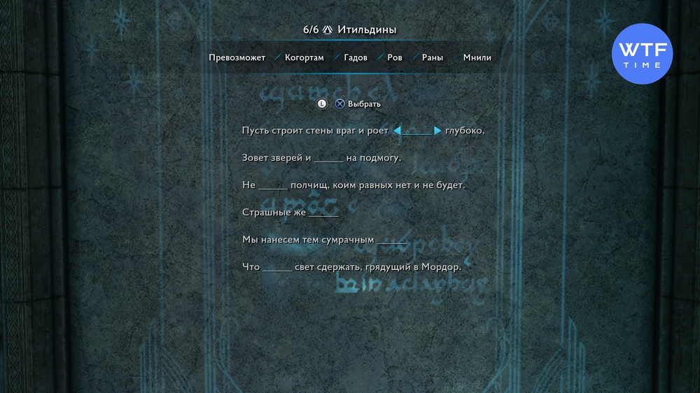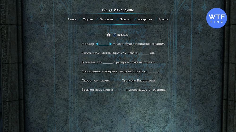 - Серегост. Расставляем слова следующим образом: Окутан / Отравлен / Коварство / Павших / Ярость / Гниль.