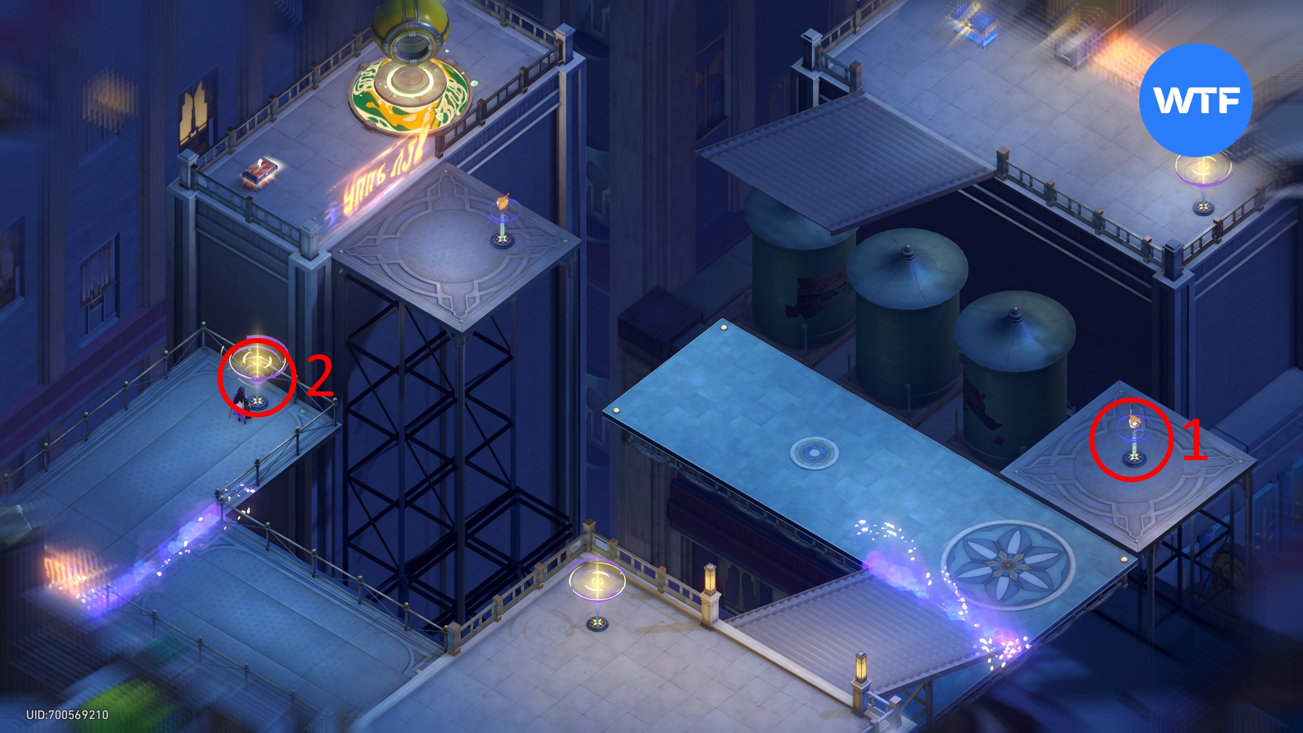 От предыдущего сундука бегите на юг и воспользуйтесь оком грез. Используйте модуль грез, чтобы повернуть г-образную платформу влево (цифра 1 на втором скриншоте ниже), а затем закройте око грез при помощи переключателя под цифрой два. Так вы окажетесь прямо на нужном месте, возле обычного сундука.