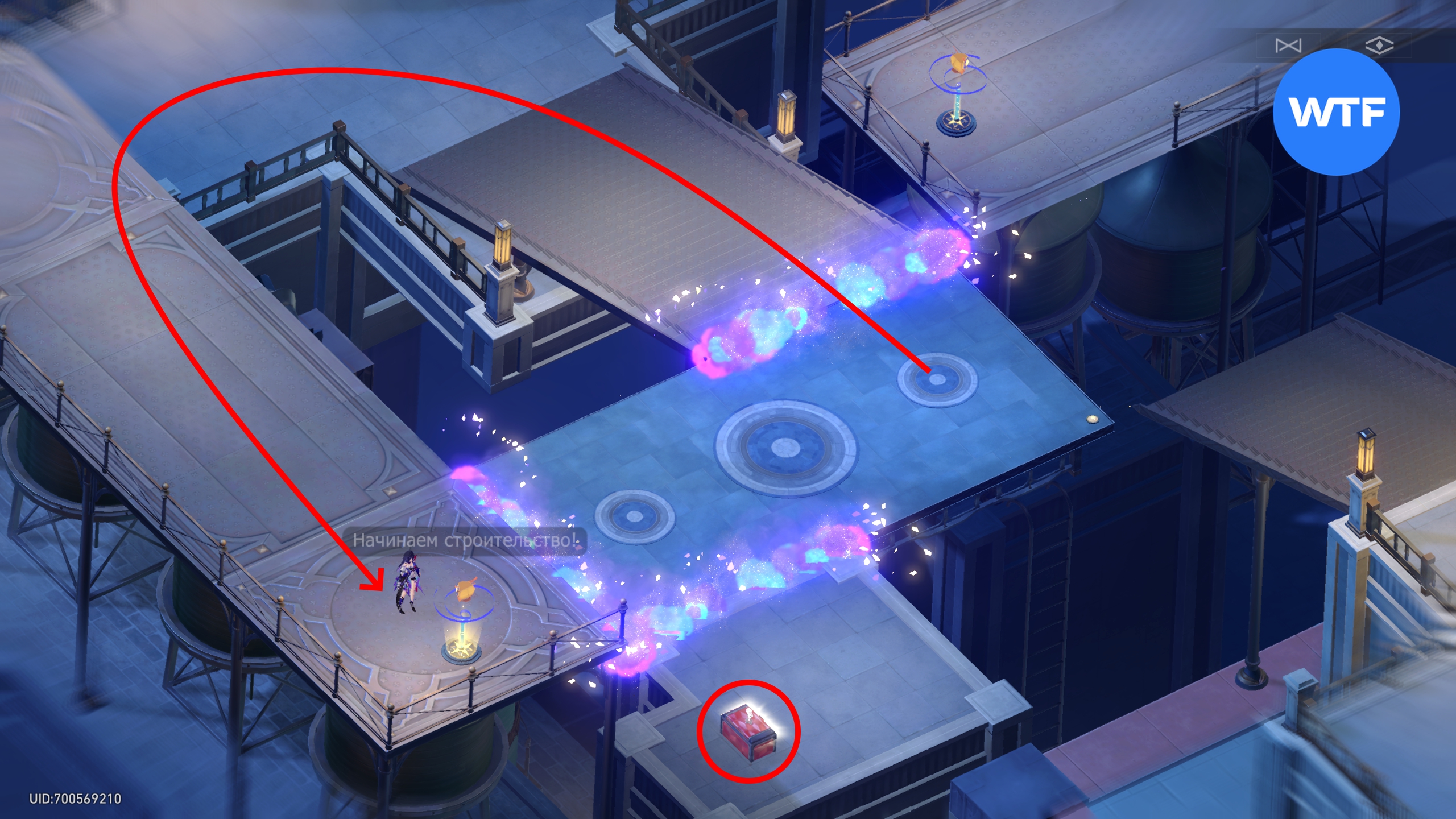 От телепорта «Площадь сновидцев» бегите на юг и воспользуйтесь модулем грез, чтобы повернуть г-образную платформу влево. По ней вы сможете добраться до роскошного сундука, который охраняется отрядом сильных противников.