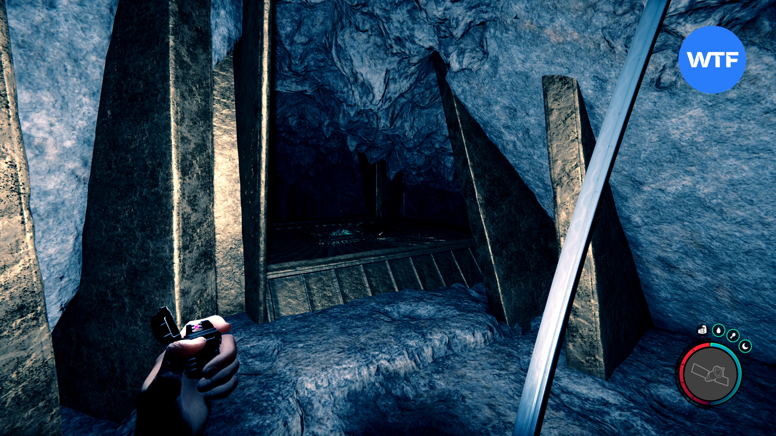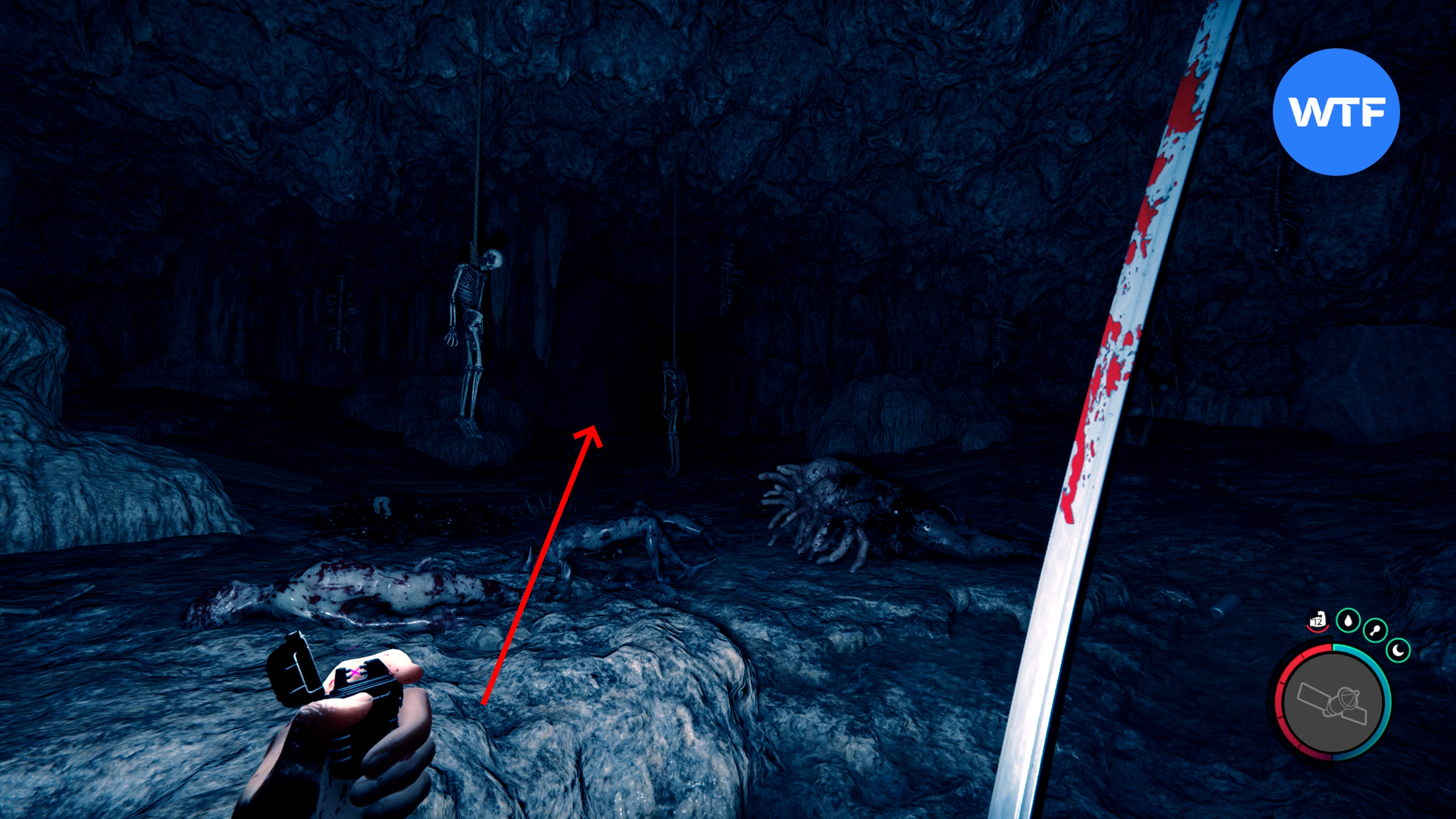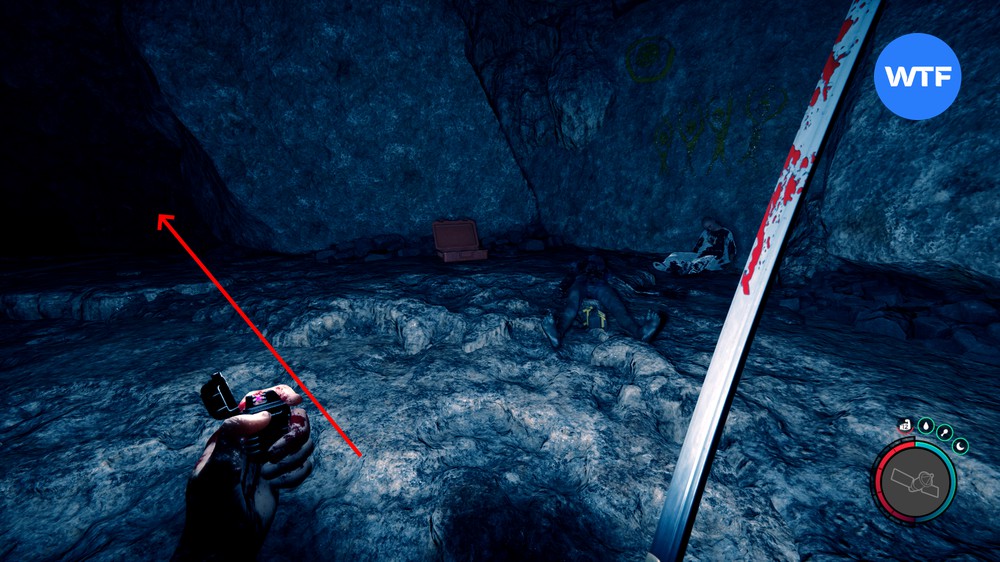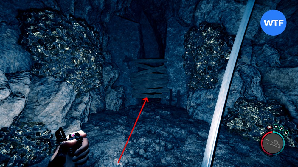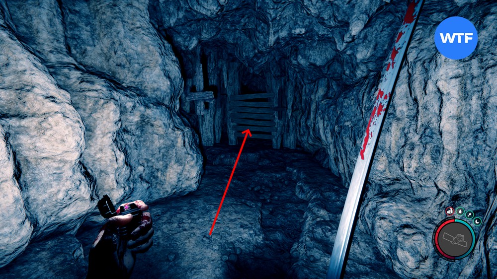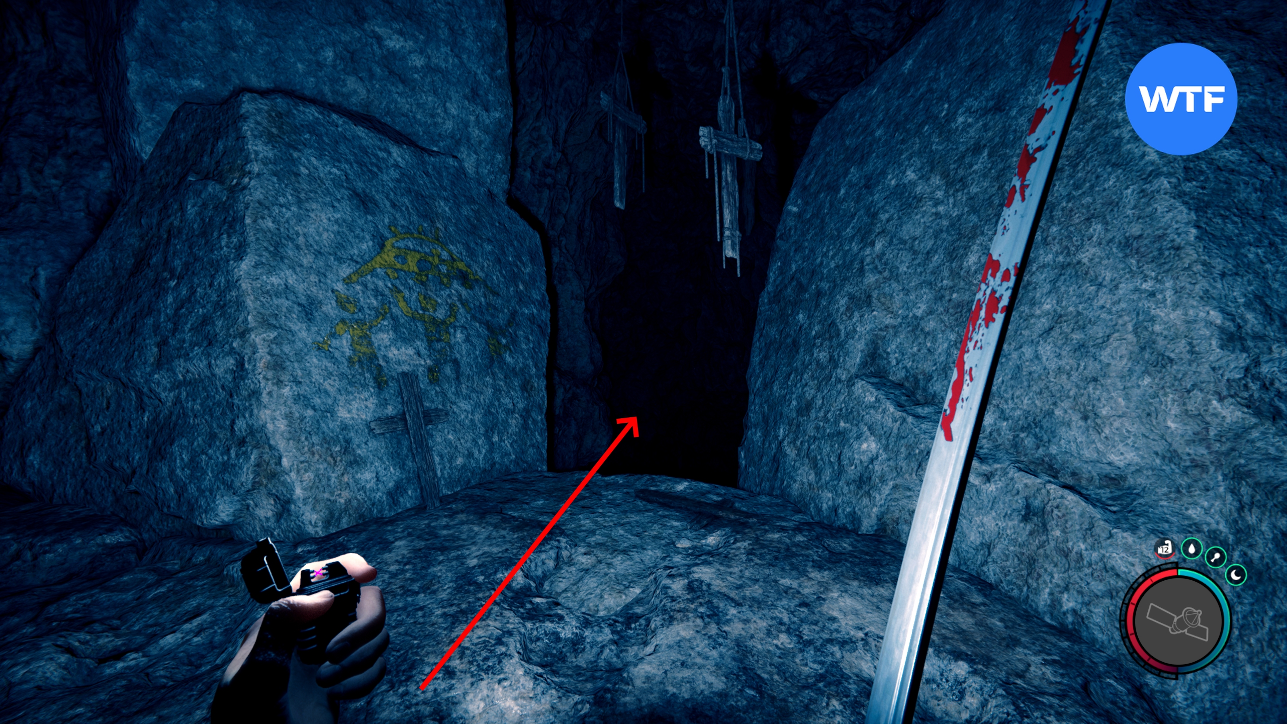 У входа в пещеру лежат два мертвых культиста в белых одеждах, можете взять их за ориентир при спуске к воде. Проход в пещеру заколочен, сломайте доски, чтобы попасть внутрь.