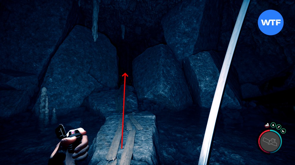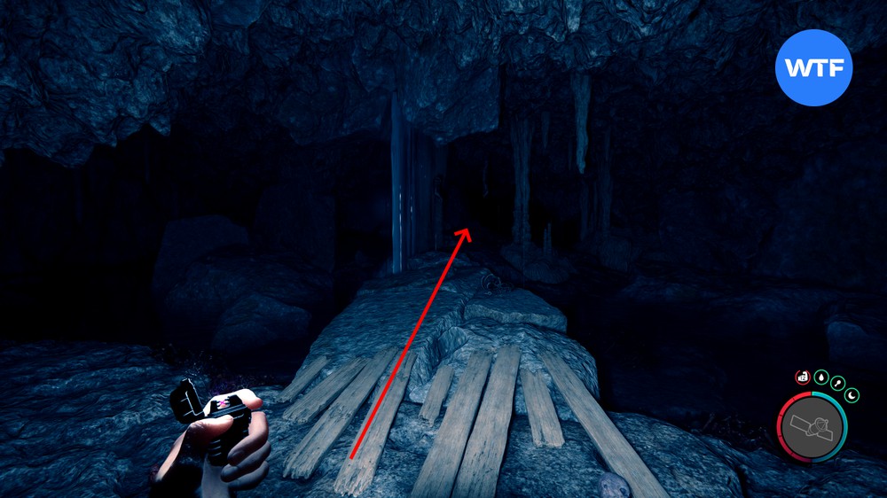 В конце тоннеля вы увидите проход среди камней, к которому ведут деревянные доски на полу пещеры.
