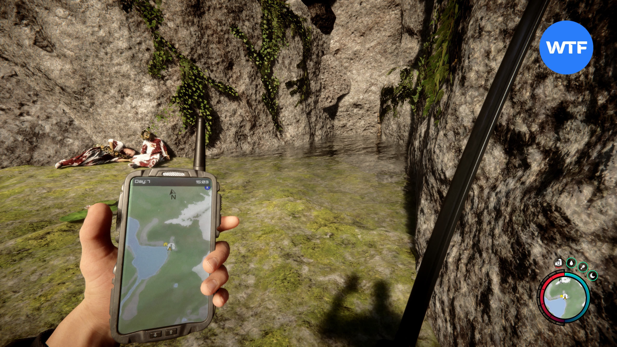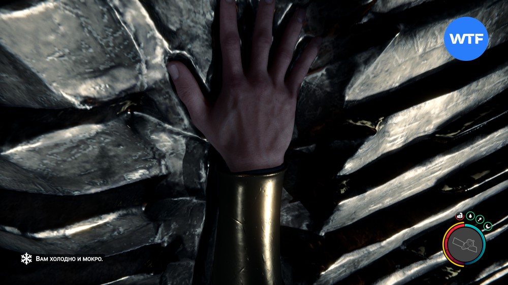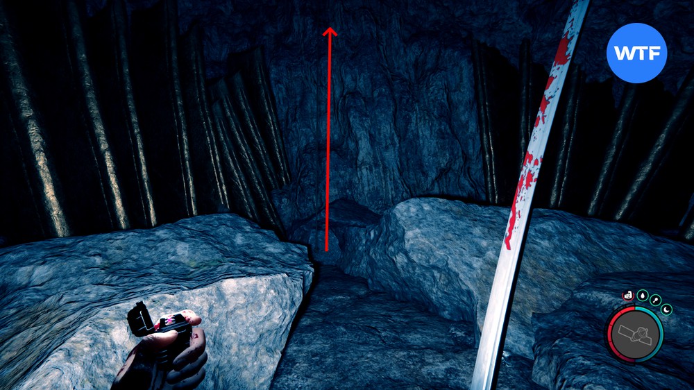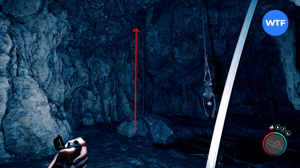 Выбравшись из воды, разберитесь с мутантами и бегите вперед — в сторону свисающих с потолка скелетов. Так вы доберетесь до скалы с рисунком (см. скриншот 2), возле которой можно съехать по склону вниз.