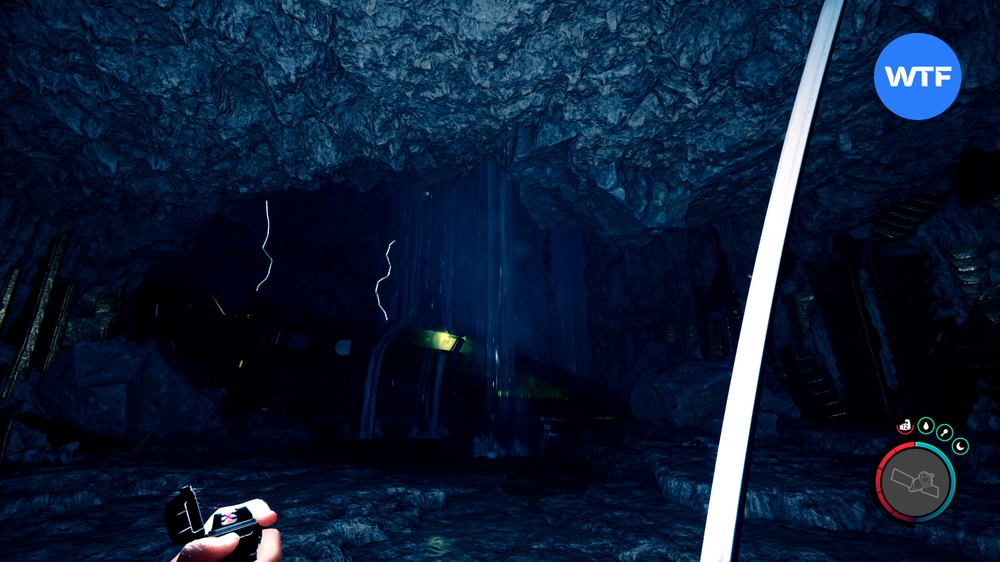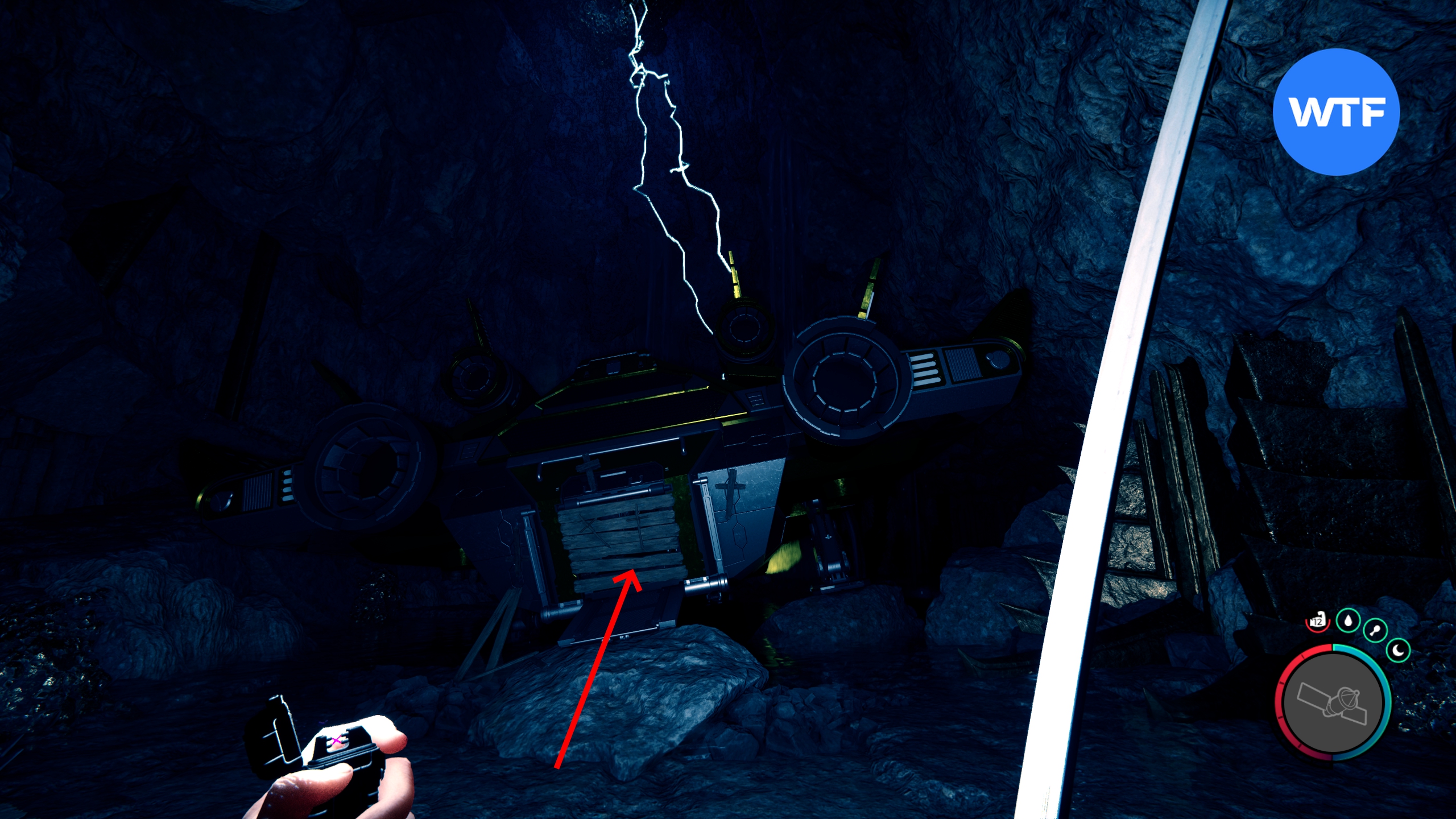 Выйдя из воды, двигайтесь вперед по единственно возможному пути, пока не дойдете до большой области с разбившимся летательным аппаратом и бьющими молниями.