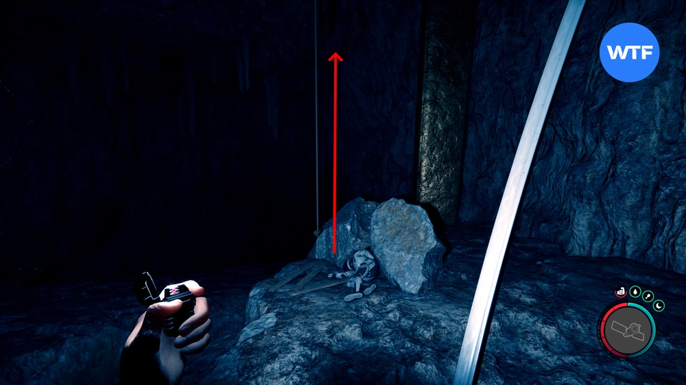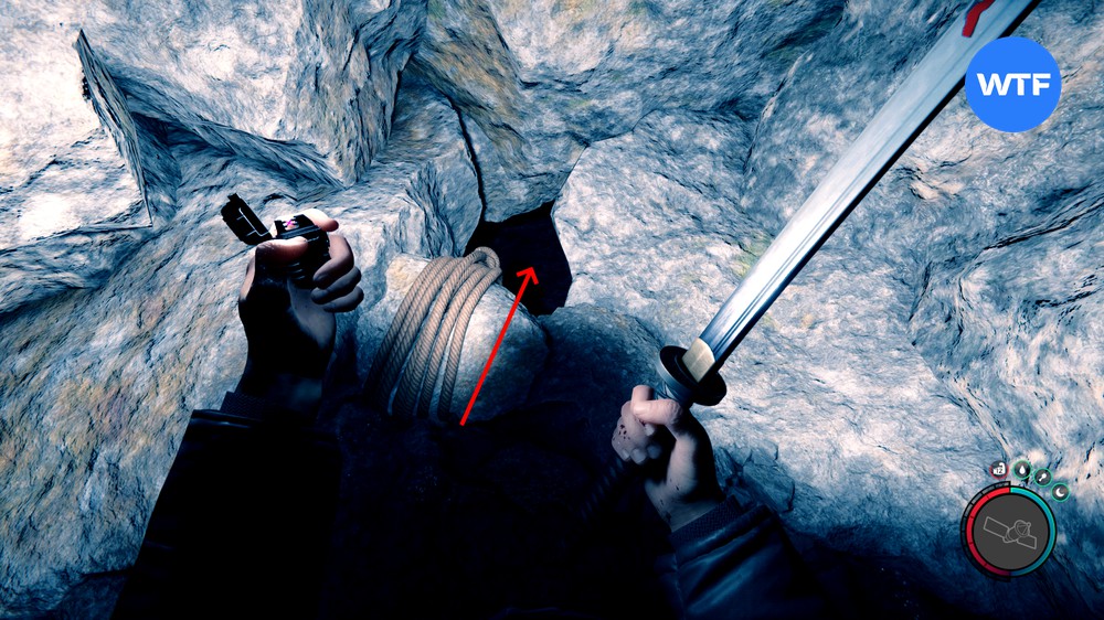 Поднявшись, идите по узкому тоннелю вперед до упора, а затем спускайтесь по веревке вниз и съезжайте по склону.