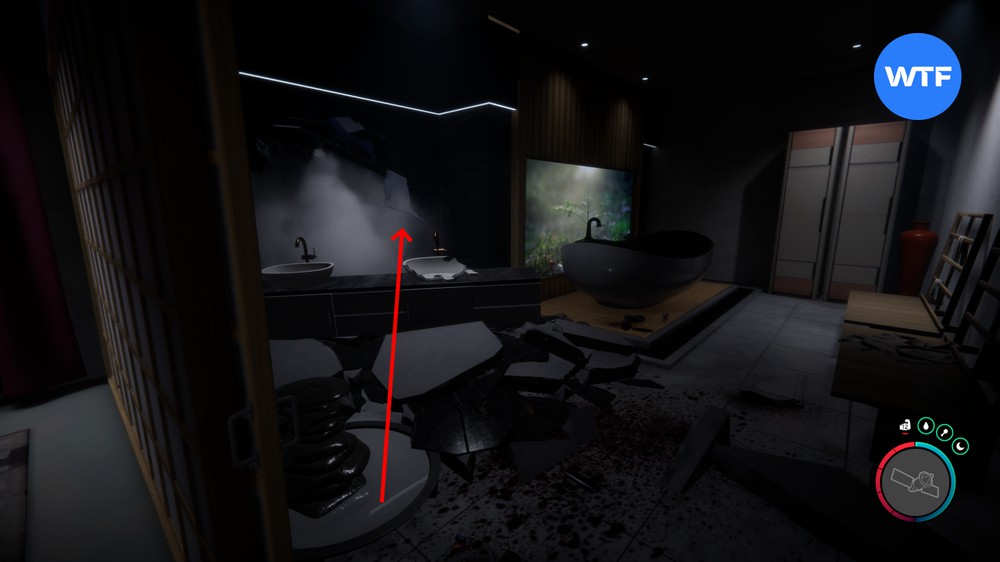 Внутри бункера идите вперед до самого конца, пока не дойдете до ванной комнаты с проломленной стеной, из которой валит пар.