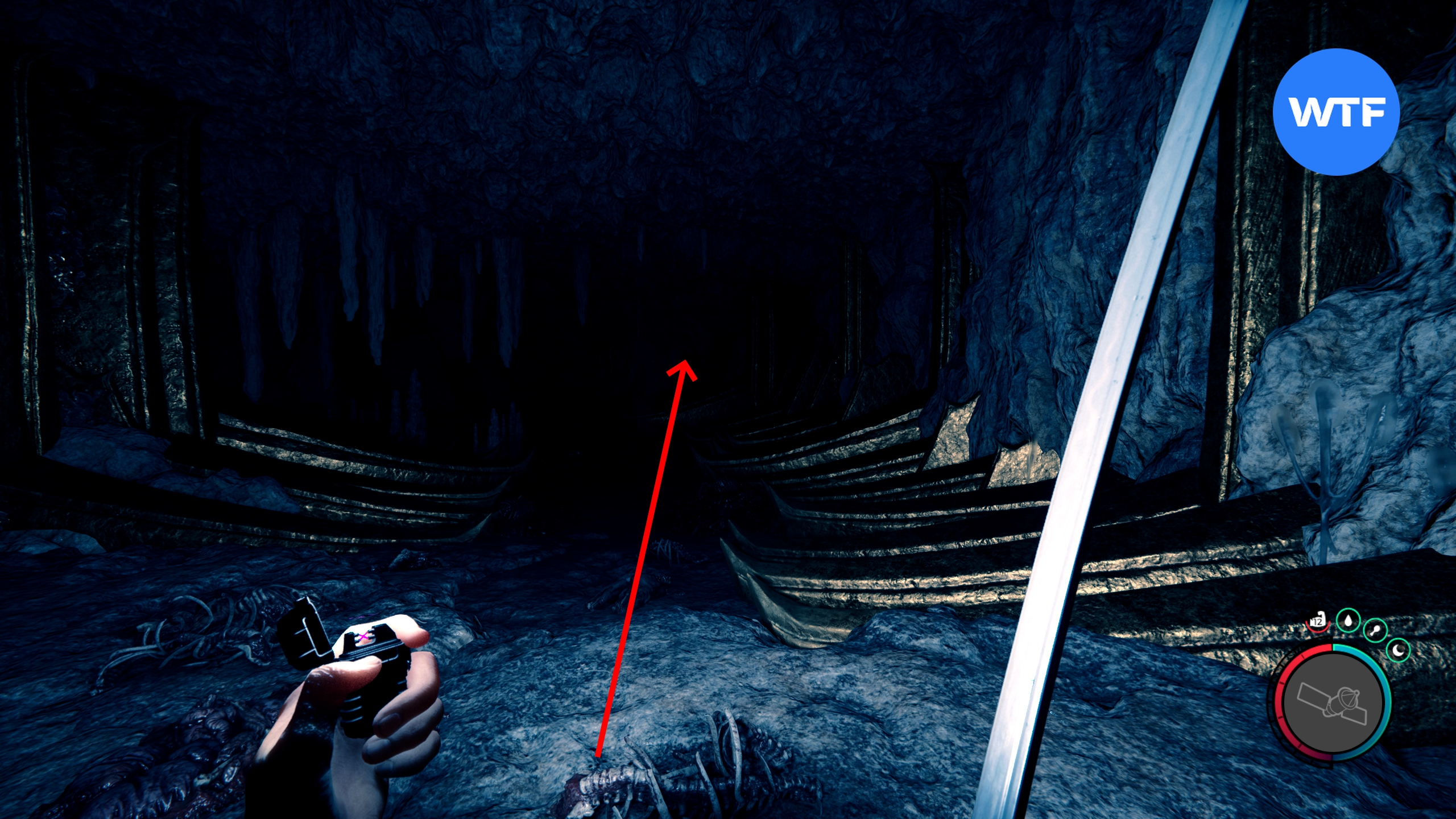 Вернитесь к развилке и теперь идите налево. Этот путь в итоге и приведет вас к выходу из пещеры с древней броней. Чтобы добраться до него, придется разобраться с парочкой мутантов и воспользоваться аквалангом в конце.