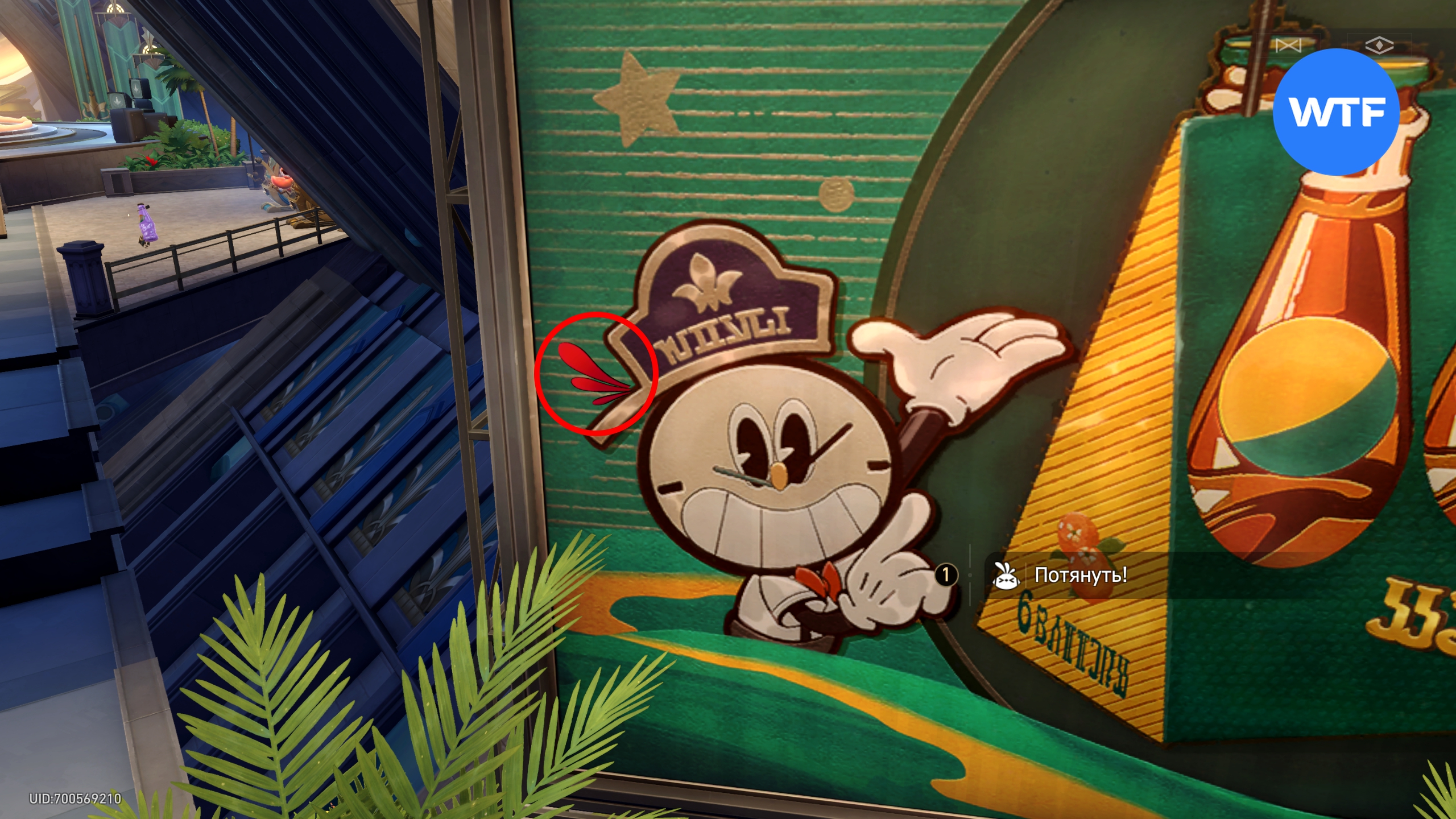После входа в локацию бегите вперед и посмотрите направо. Вам нужен большой рекламный щит с Часиком возле клумбы. Поднимитесь по лестнице и подойдите к фонарному столбу, чтобы появилась кнопка «Осмотреть».