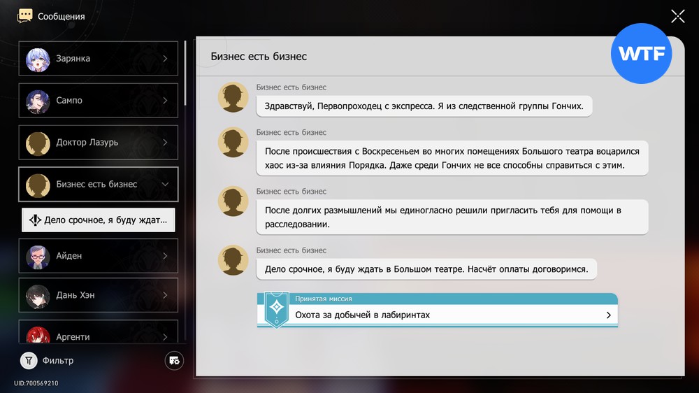 После этого на ваш смартфон придет сообщение от адресата Бизнес есть бизнес. С вами свяжется член следственной группы Гончих, который попросит помочь им с расследованием в Большом театре.