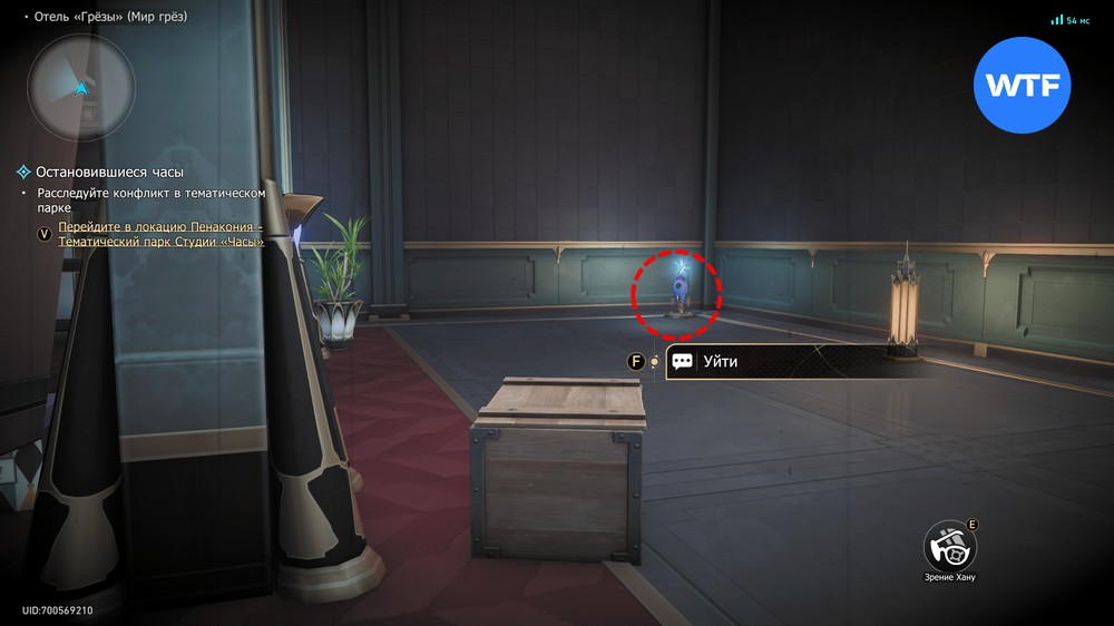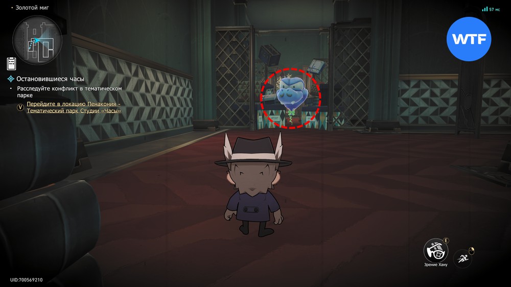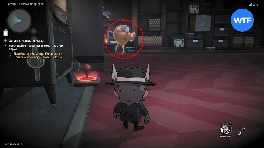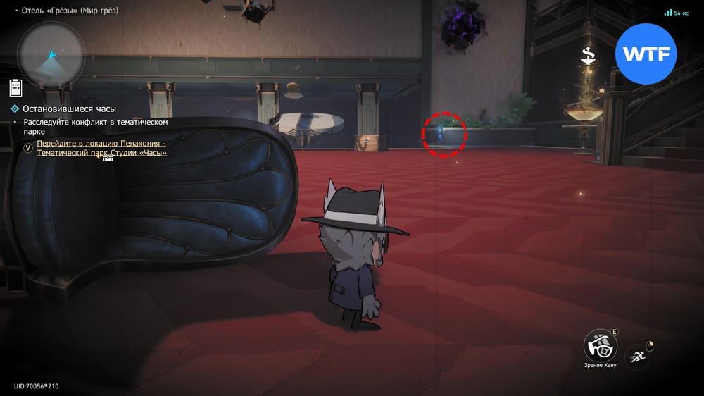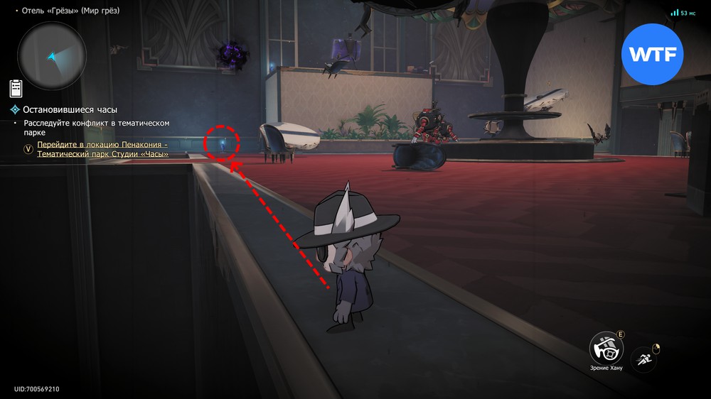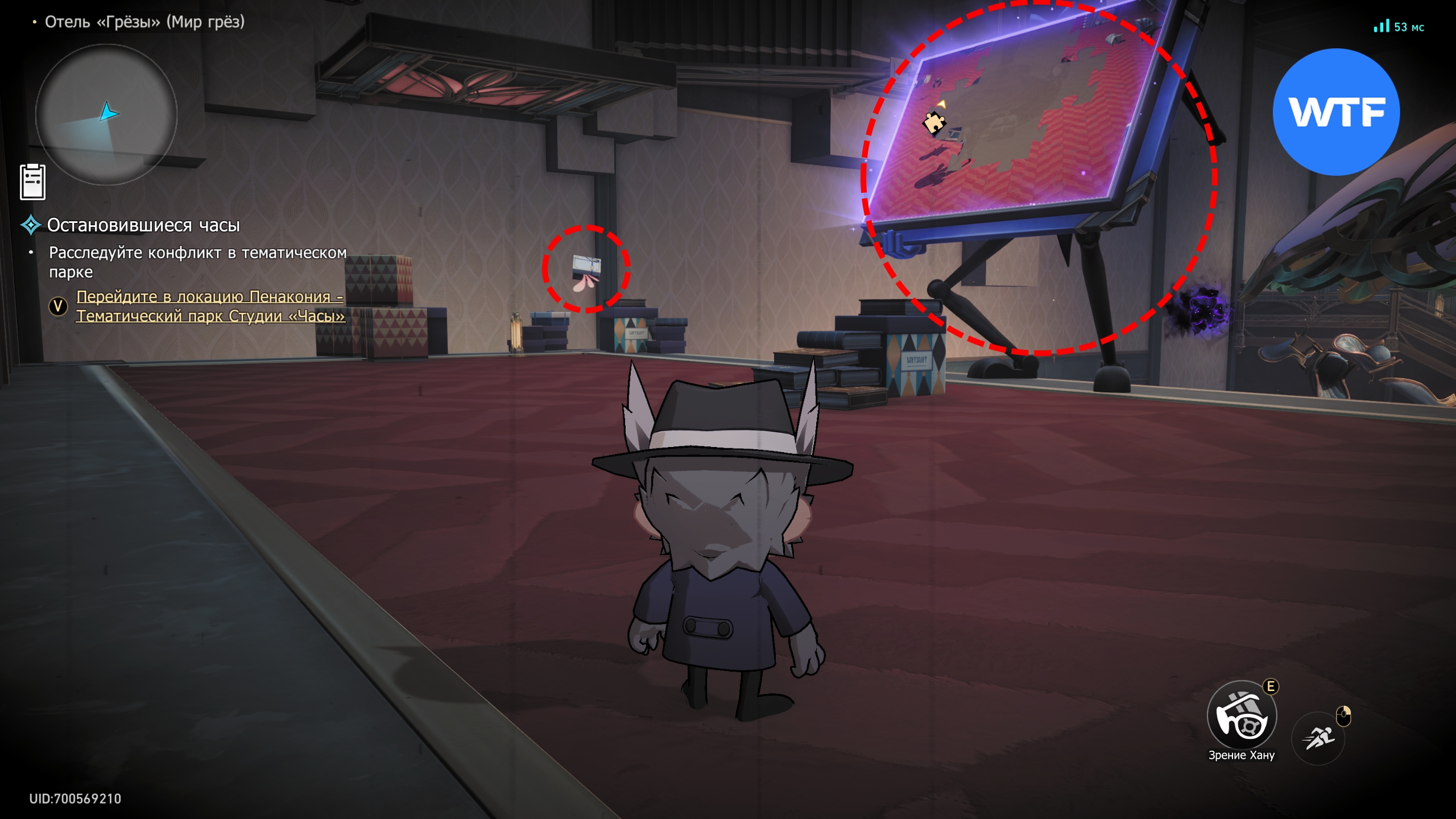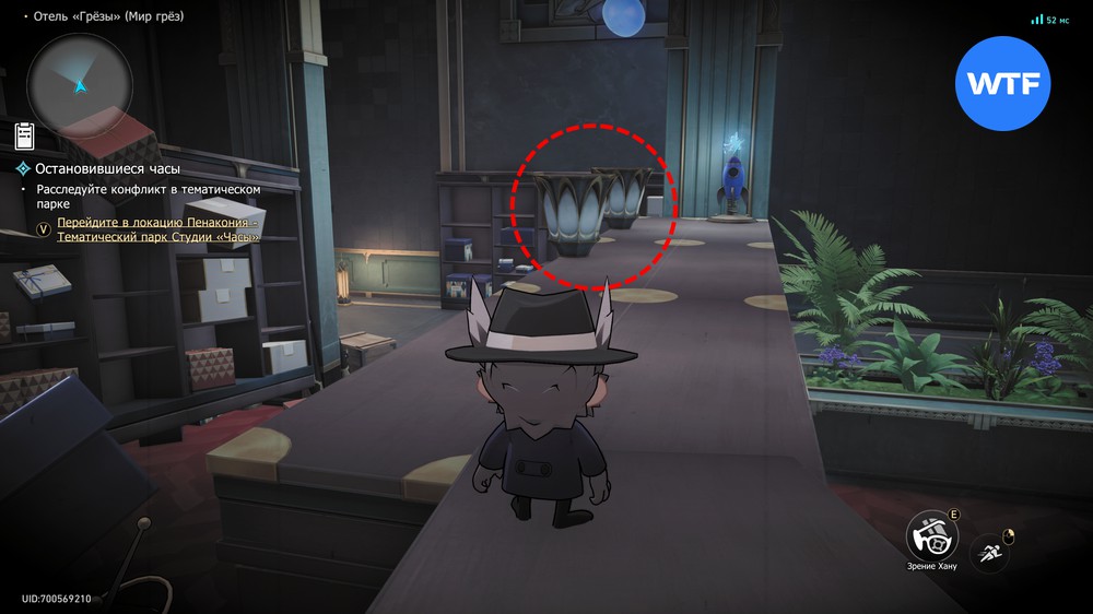 Перейдите в локацию «Отель Грёзы (Мир грёз)» и воспользуйтесь точкой быстрого перемещения «Коридор VIP-зала» на третьем этаже. От неё пройдите через дверь на западе, а затем спуститесь по лестнице вниз. Сразу после этого поверните направо и увидите телевизор для превращения в Хану возле клумбы с цветами.