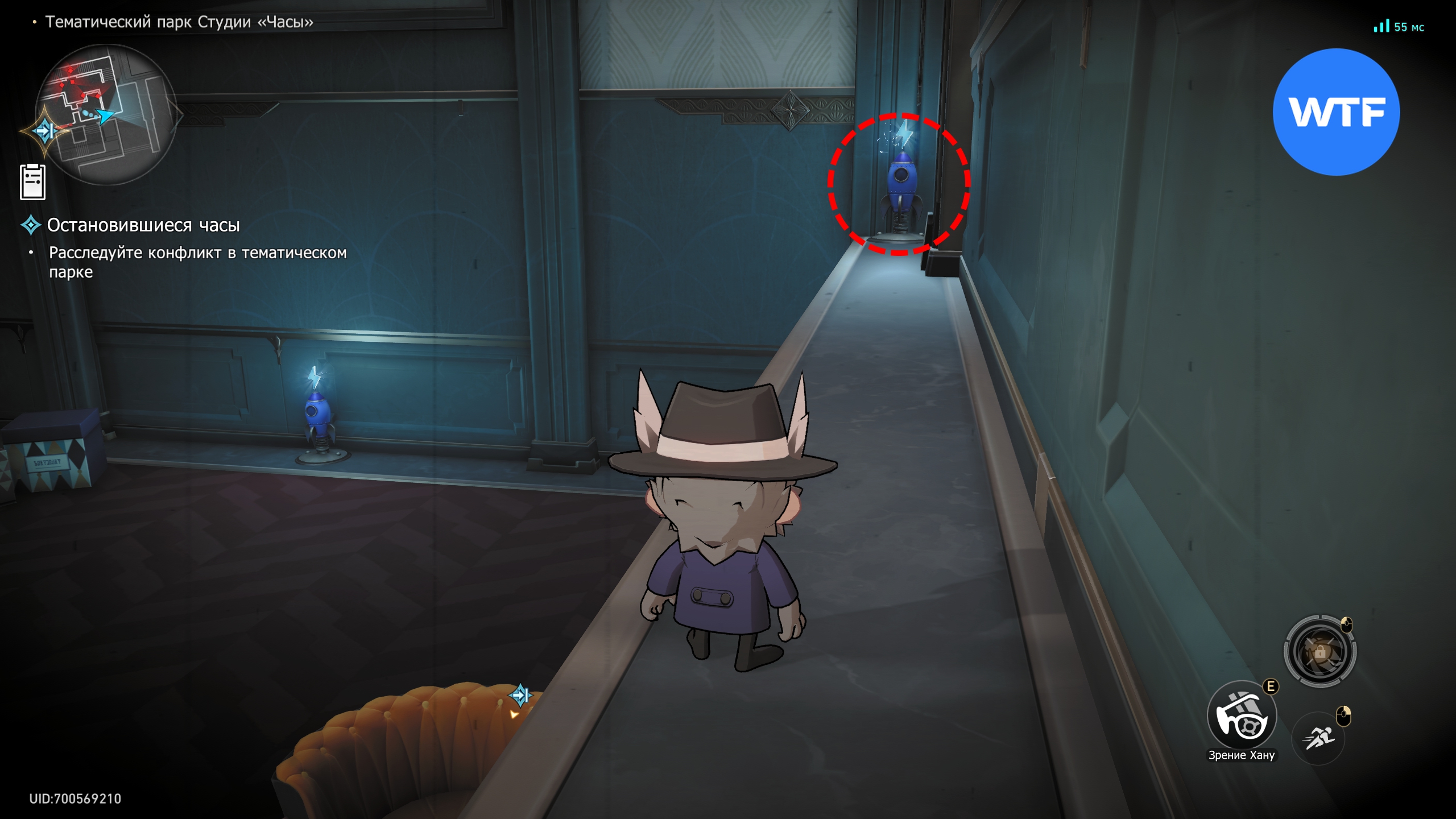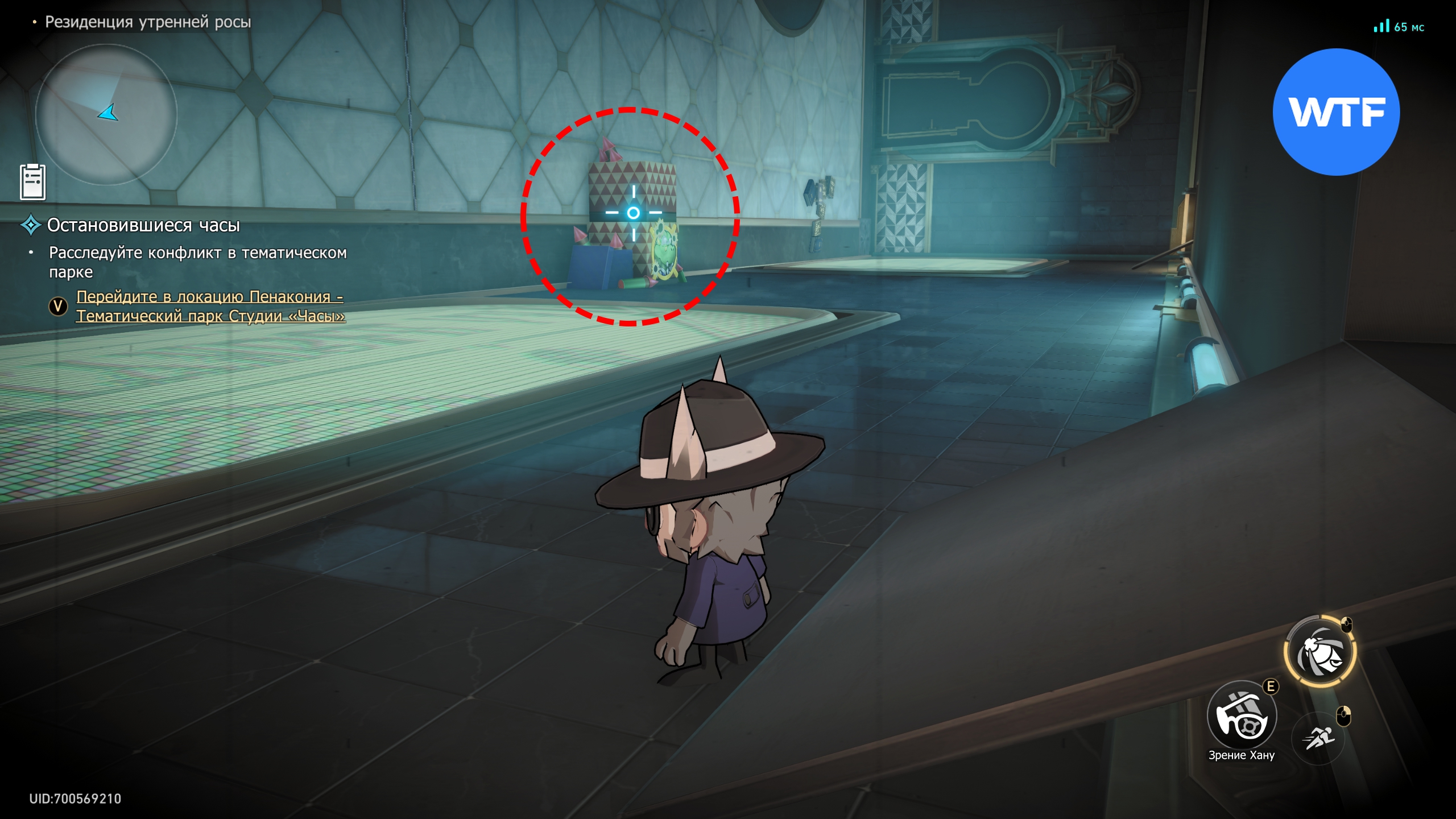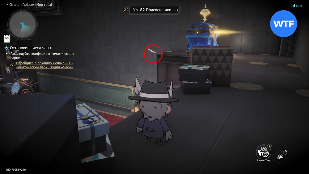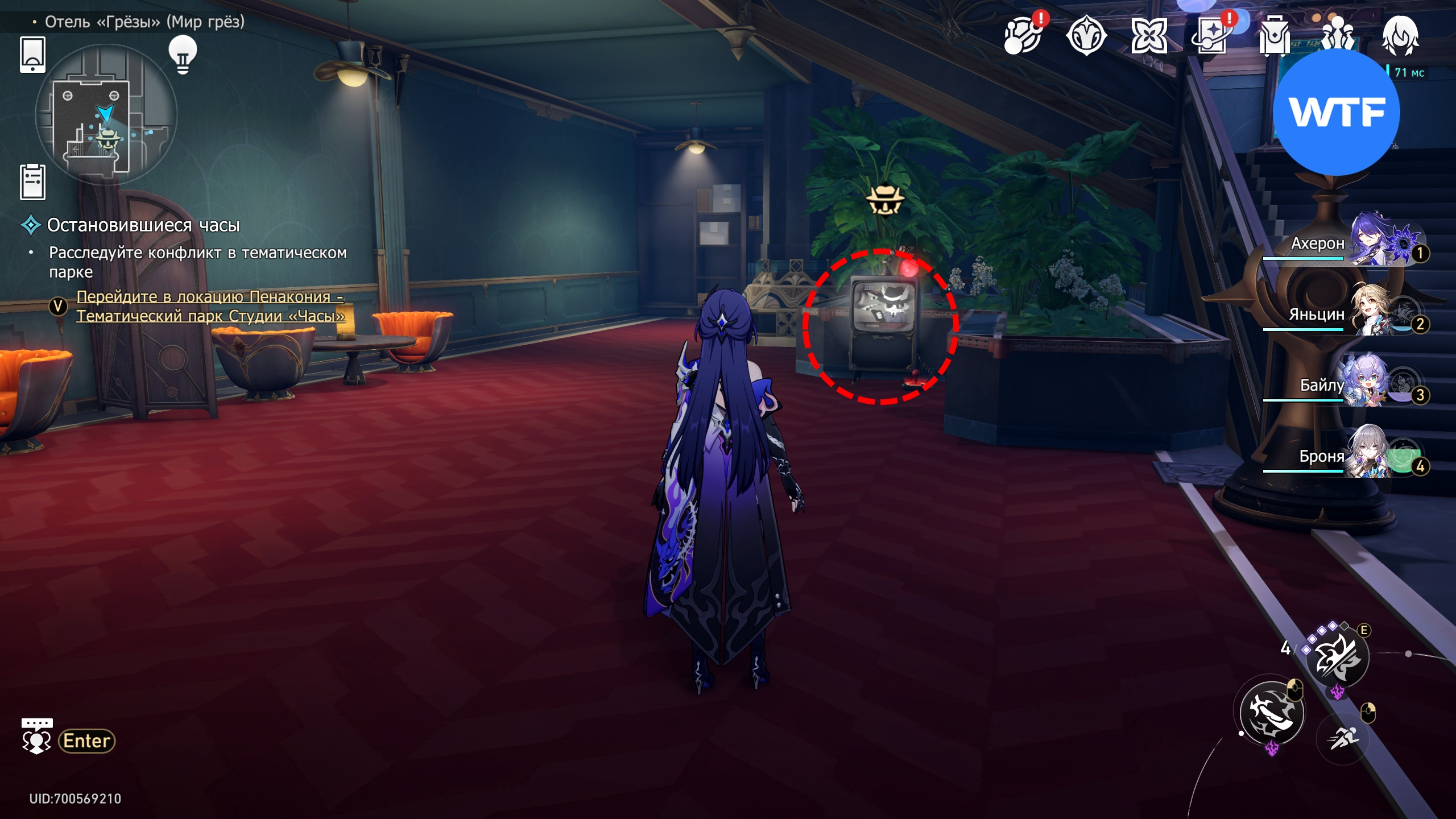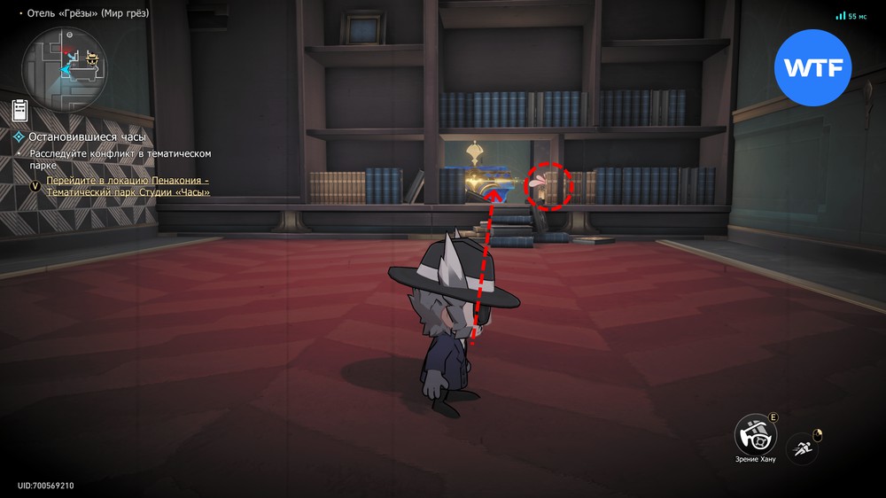 Перейдите в локацию «Отель Грёзы (Мир грёз)» и воспользуйтесь точкой быстрого перемещения «Коридор VIP-зала» на третьем этаже. От неё пройдите через дверь на западе, а затем спуститесь по лестнице вниз. Сразу после этого поверните направо и увидите телевизор для превращения в Хану возле клумбы с цветами.
