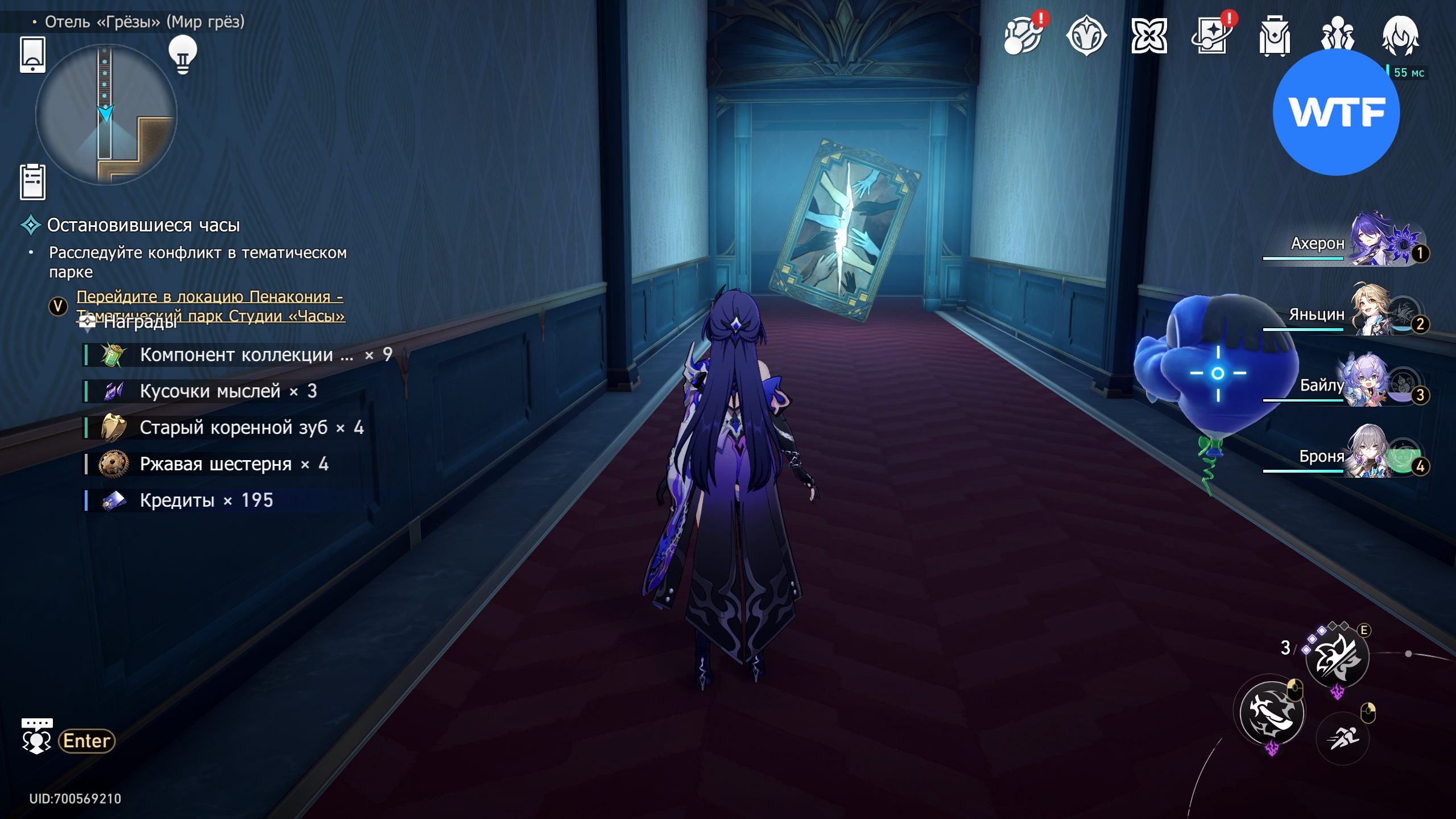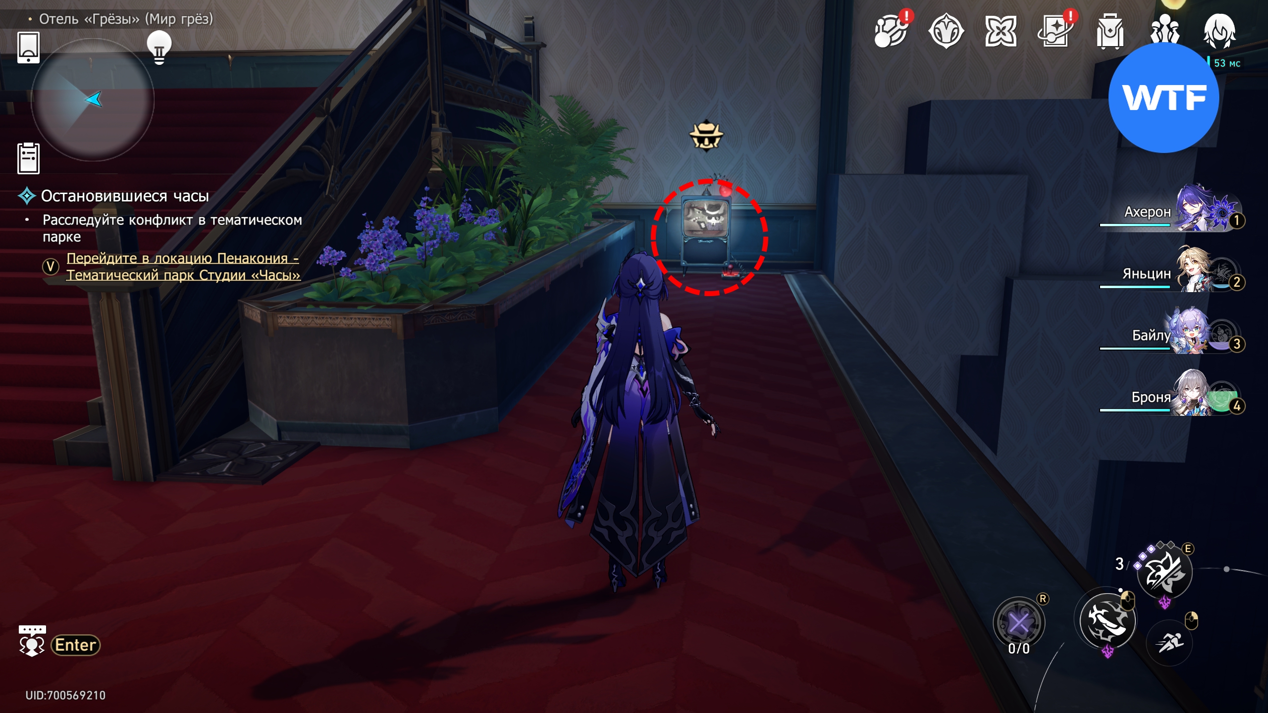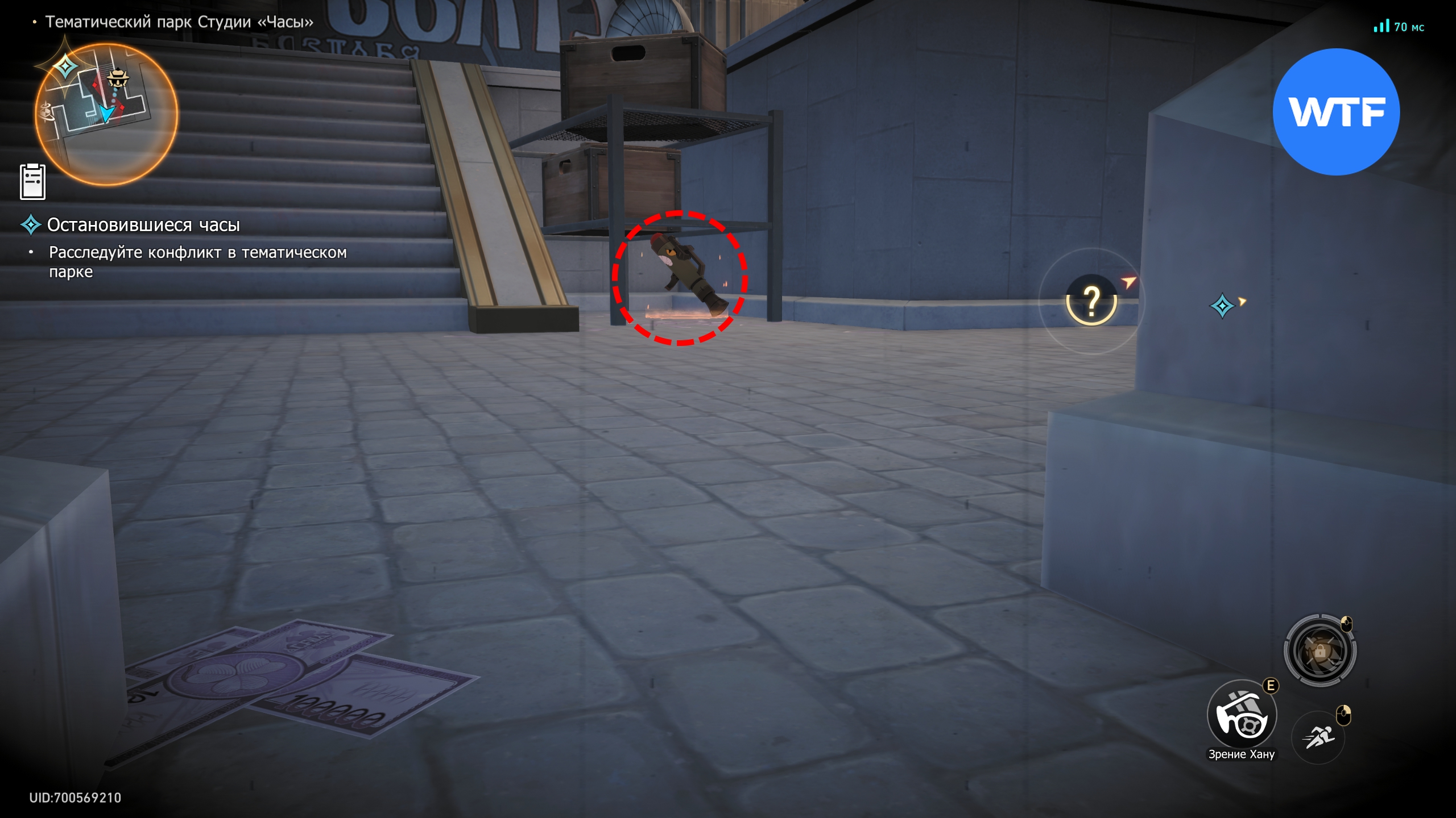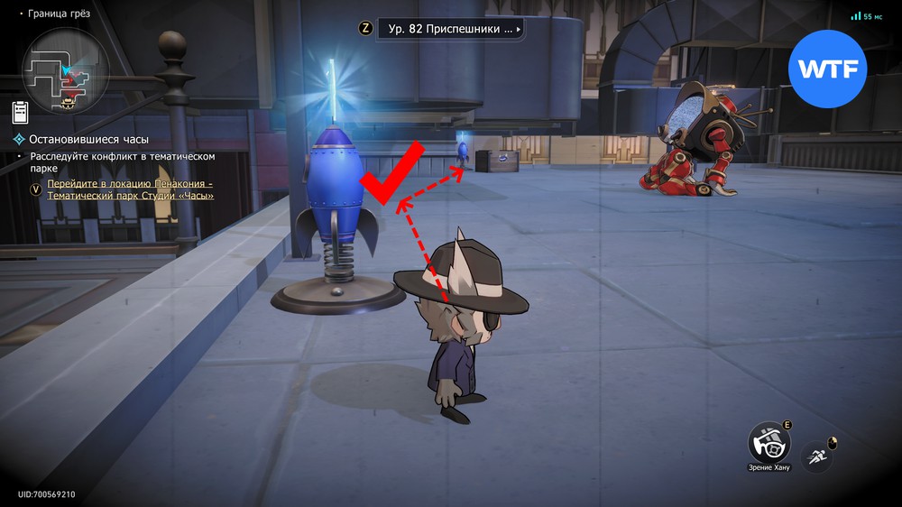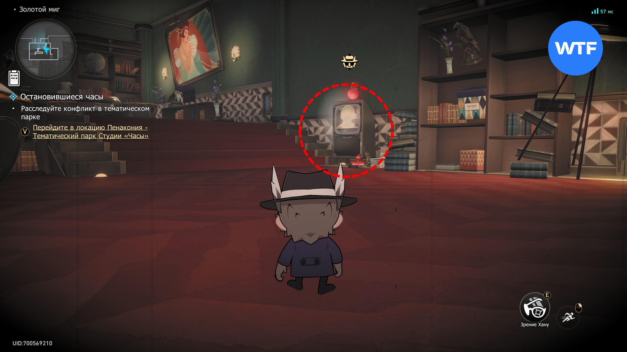 Перейдите в локацию «Отель Грёзы (Мир грёз)» и воспользуйтесь точкой быстрого перемещения «Коридор VIP-зала» на третьем этаже. От неё пройдите через дверь на западе, а затем спуститесь по лестнице вниз. Сразу после этого поверните направо и увидите телевизор для превращения в Хану возле клумбы с цветами.