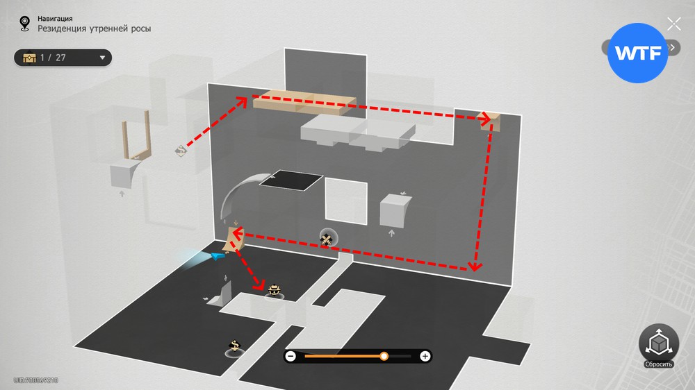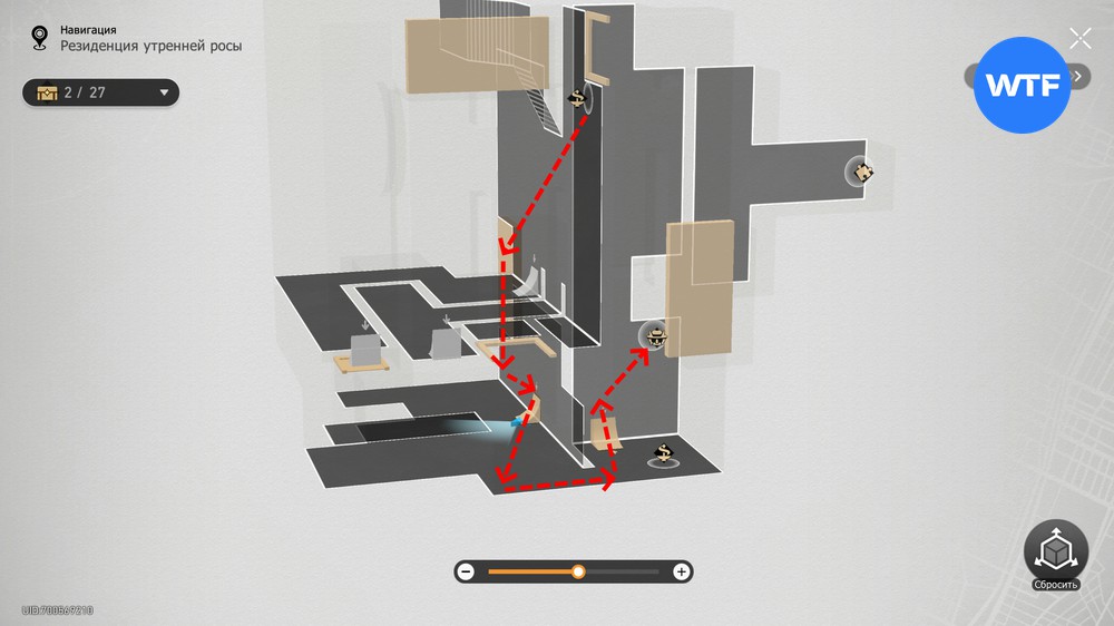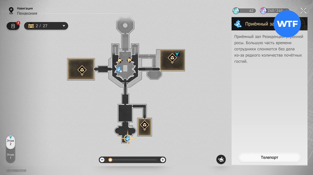 Перейдите в локацию «Резиденция утренней росы» и воспользуйтесь точкой быстрого перемещения «Приёмный зал» на втором этаже. От неё бегите на север, а затем по балкону налево, чтобы оказаться у двери, которая доставит вас в область с трехмерной картой.