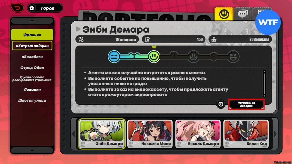 После завершения заказа не забудьте заглянуть в Рабочий уголок в Видеопрокате и заглянуть в раздел «Досье партнеров». Откройте фракцию «Хитрые зайцы» и найдите там Энби Демара.