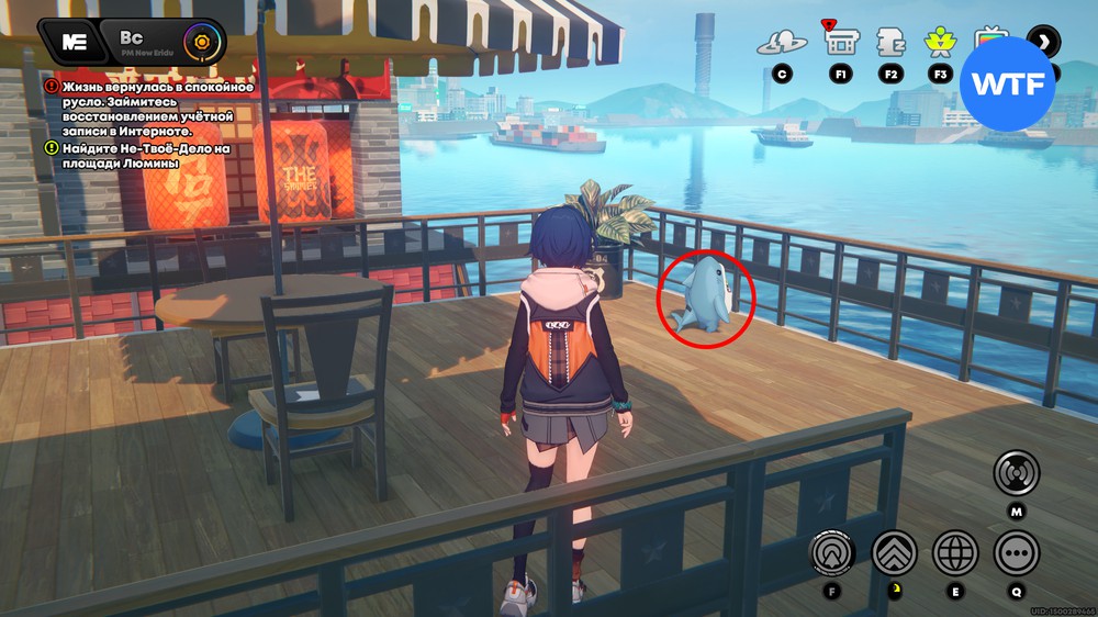 Переместитесь к кофейне «Кофф-кафе» на Площади Люмины и поднимитесь по лестнице на крышу. Там вы найдете банбу Не-Твоё-Дело в костюме акулы. Он будет стоять у ограждения и смотреть на воду.