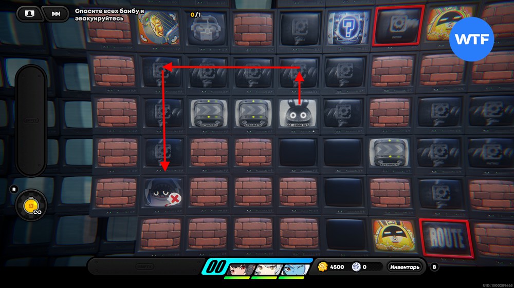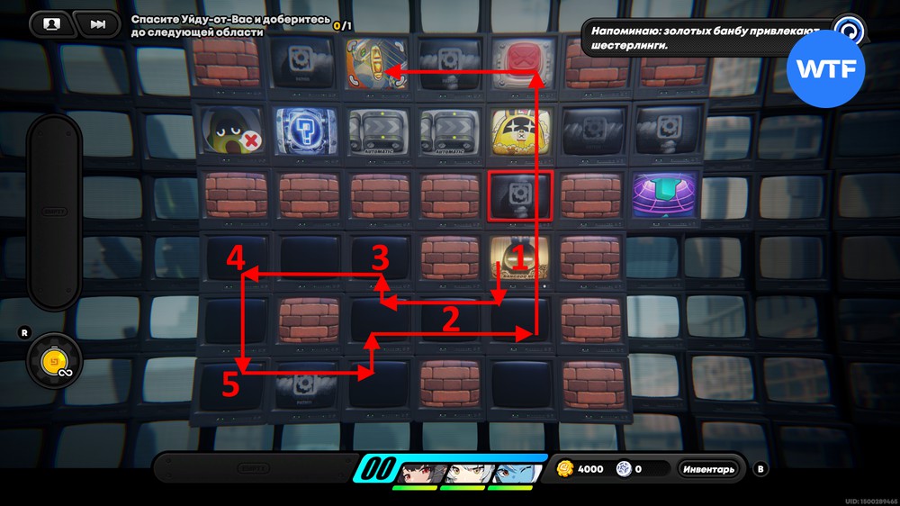 В следующей области первым делом нужно выманить золотого банбу вниз. Чтобы это сделать, двигайтесь по маршруту со скриншота ниже и последовательно оставляйте шестерлинги на месте цифр, а затем идите наверх.