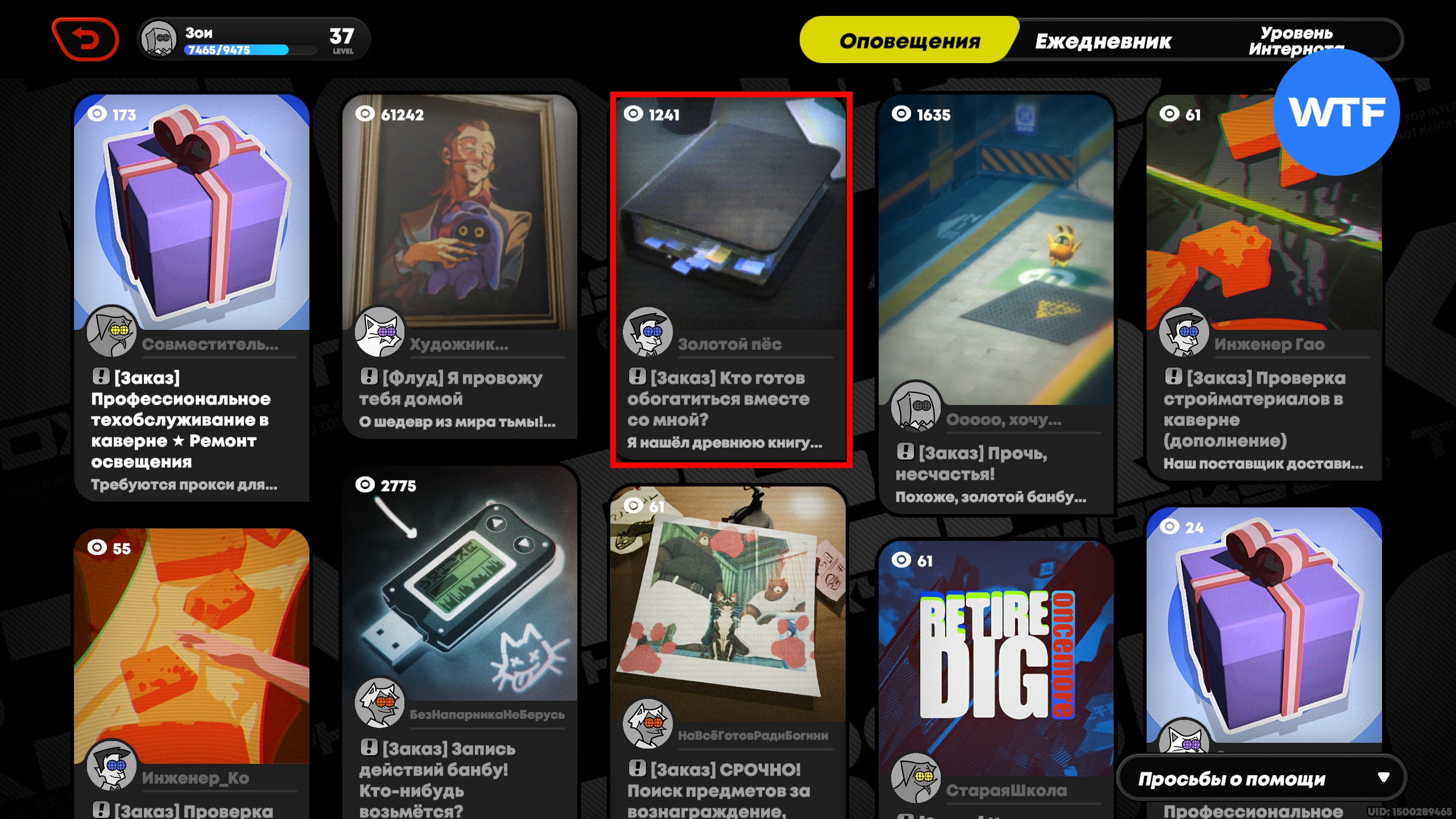 Там вы увидите новый заказ от пользователя с ником Золотой пёс. Согласитесь сопроводить его в каверну, чтобы забрать деньги из хранилища «Близнецов Баллет». Это запустит задание «[Исследование] Цена лжи II».