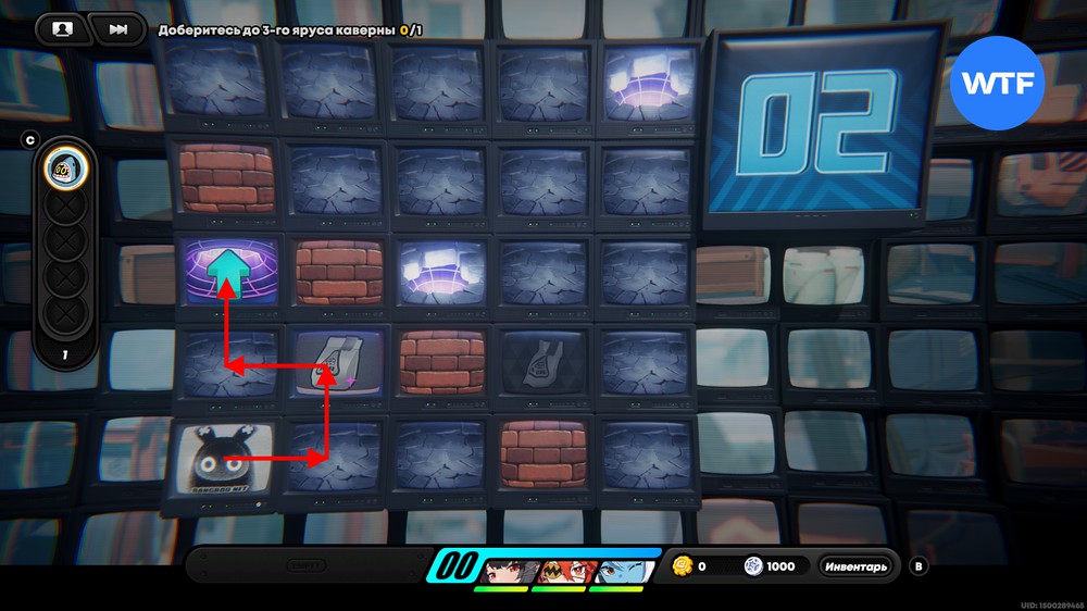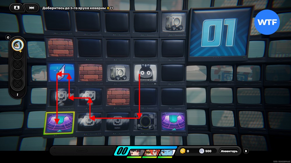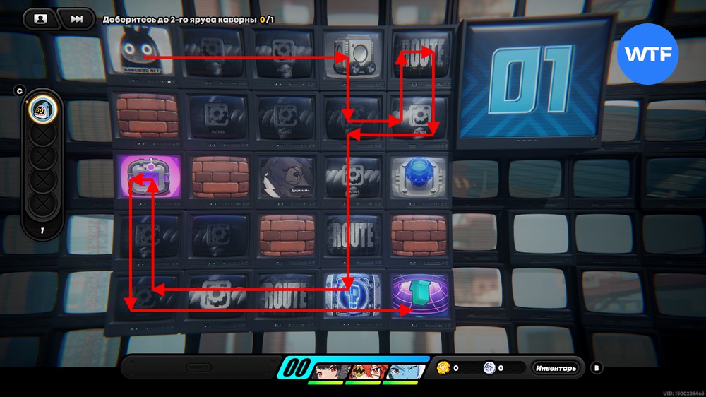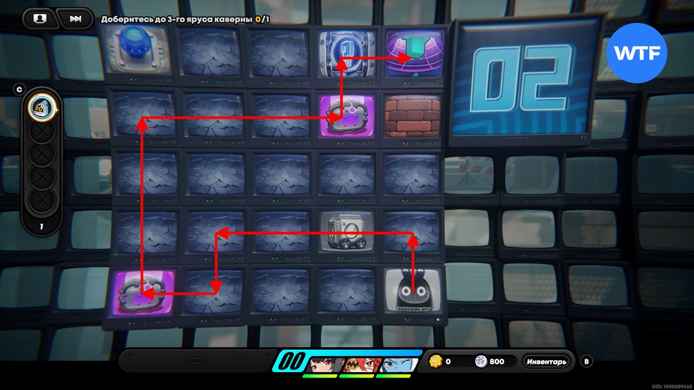 После спуска в каверну двигайтесь по маршруту, показанному на скриншоте ниже, чтобы загнать первый ящик на кнопку и разблокировать клетку со знаком вопроса. После этого прихватите фиолетовый сундук и двигайтесь к разлому в правом нижнему углу, чтобы перейти на второй ярус.