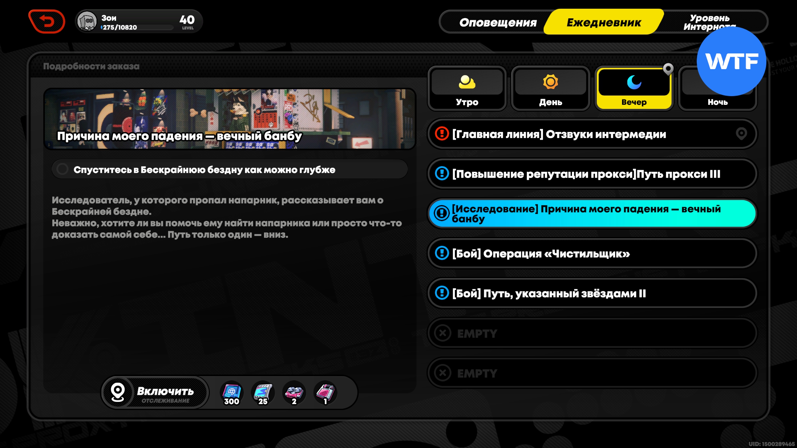 Чтобы разблокировать заказ «[Исследование] Бескрайняя бездна» в ZZZ необходимо достичь 40 уровня Интернота. После этого напротив вашего видеопроката появится Исследователь каверн, который даст задание «[Исследование] Причина моего падения — вечный банбу».