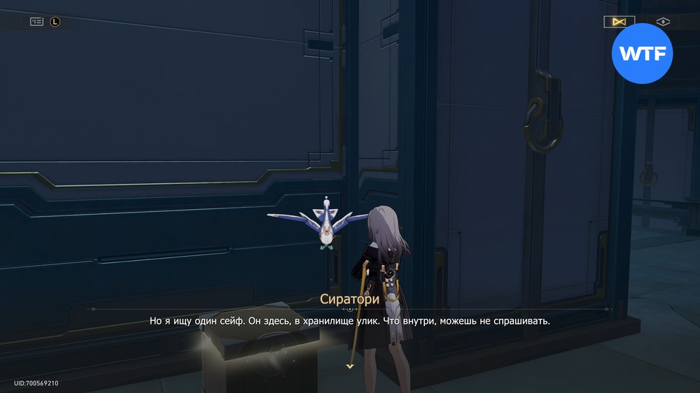 Поговорив с робоптахой, вы узнаете, что его зовут Сиратори. Птица расскажет, что ищет сейф, спрятанный в хранилище улик. Чтобы пройти через лабиринт внутри контейнера, нужны *инструкции по маршруту, оставленные предшественниками*.