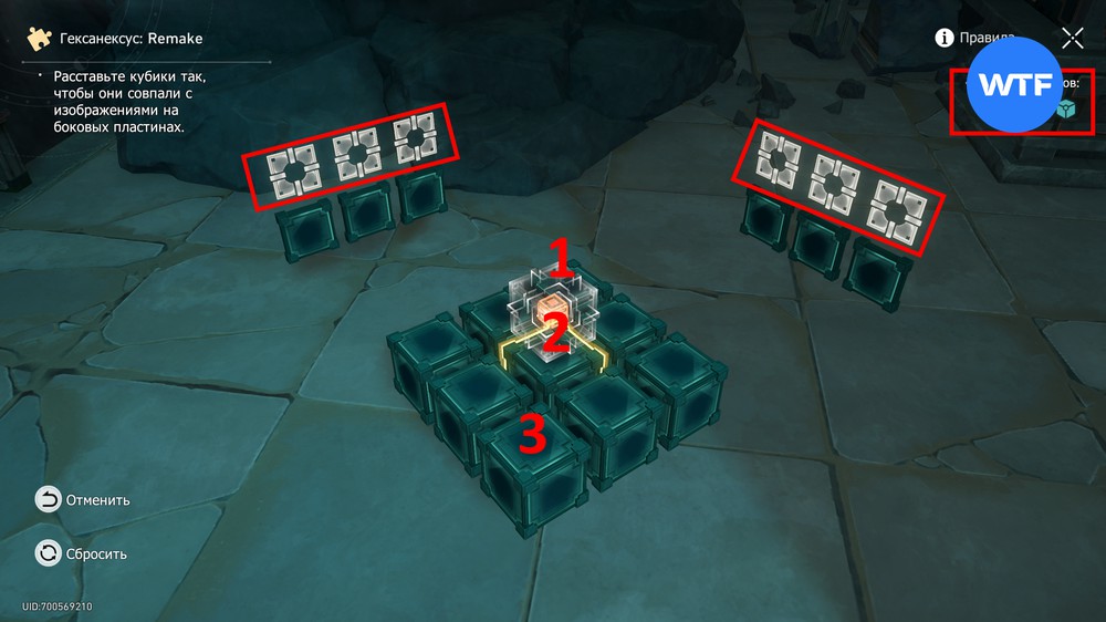 Для прохождения этого испытания нужно расставить три кубика в правильном порядке Финальная фигура показана на скриншоте ниже.