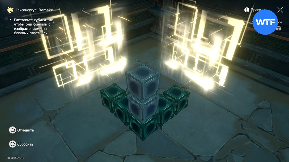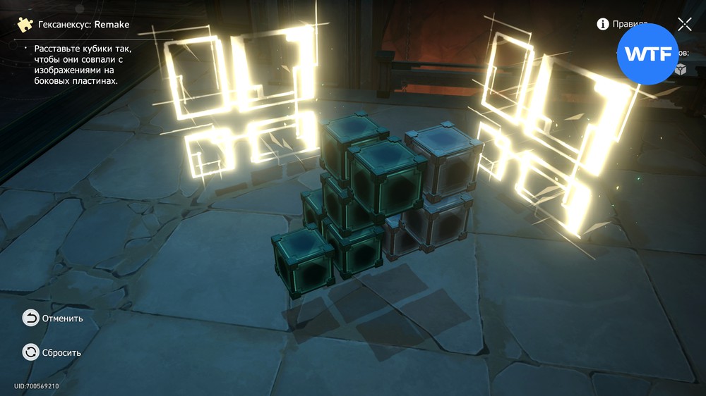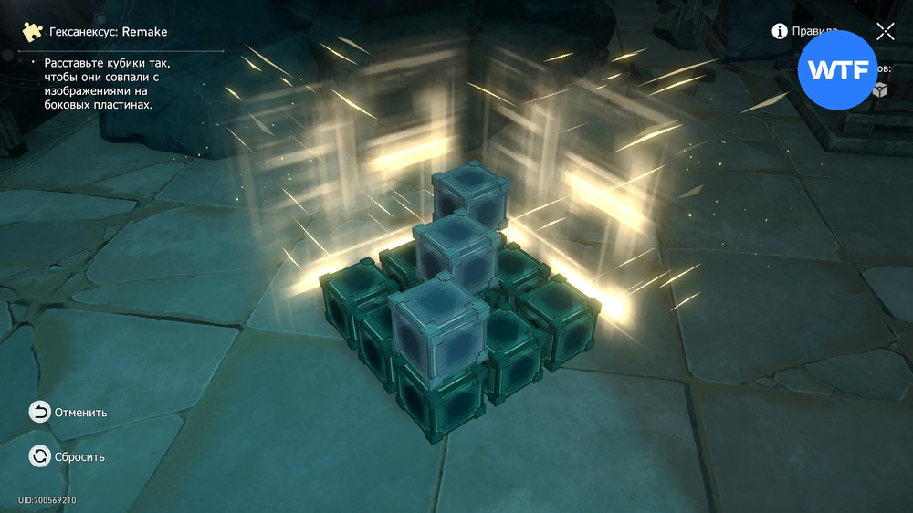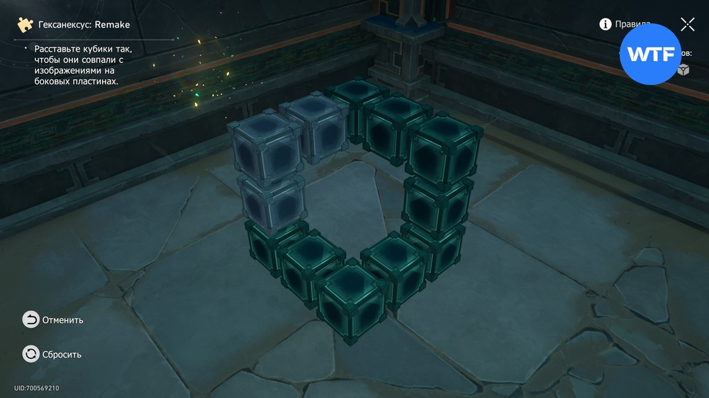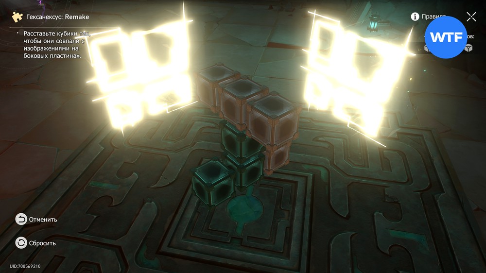 Для прохождения головоломки снова придется двигать кубики. На этот раз из них нужно собрать фигуру, напоминающую букву Т — в награду за это дадут еще один ценный сундук.