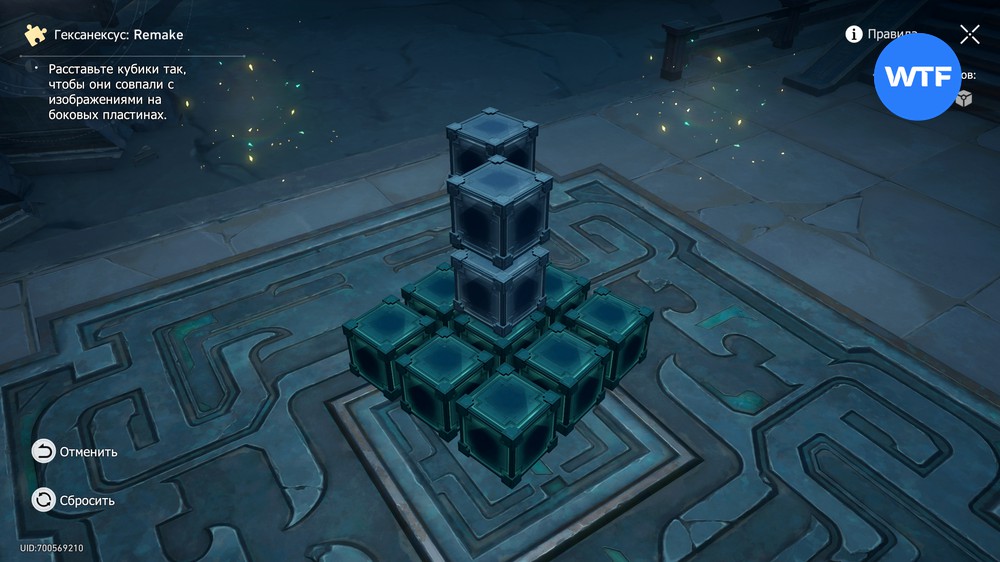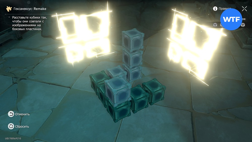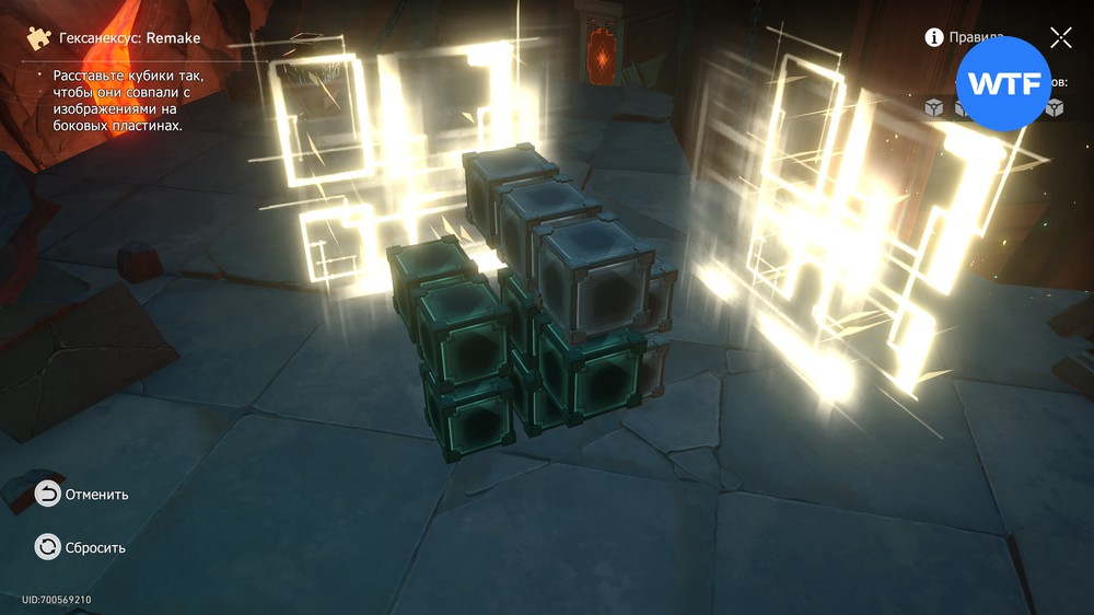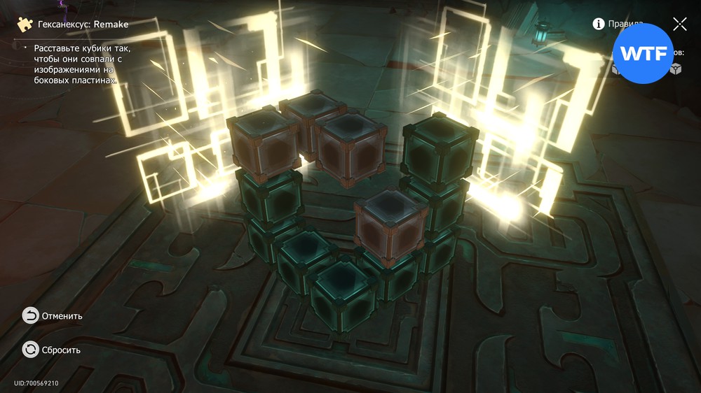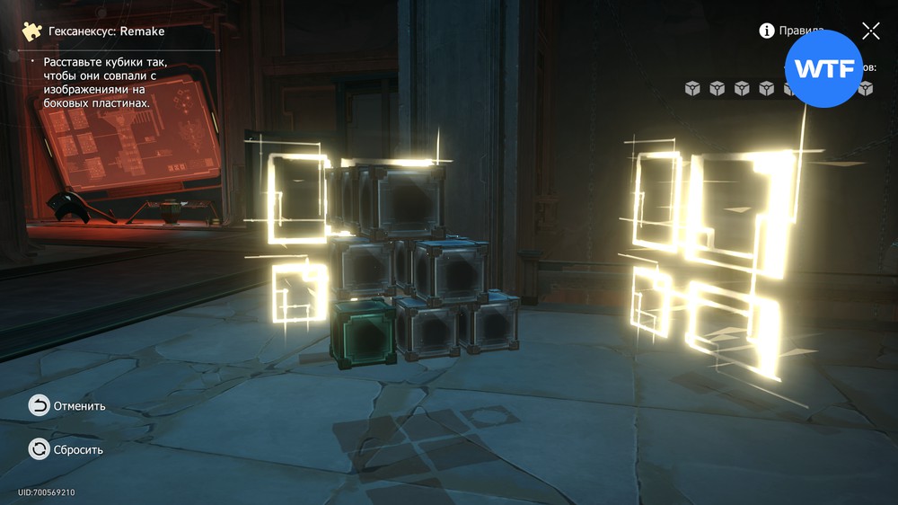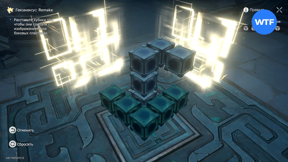 Для прохождения головоломки снова придется двигать кубики. На этот раз из них нужно собрать фигуру, напоминающую букву Т — в награду за это дадут еще один ценный сундук.