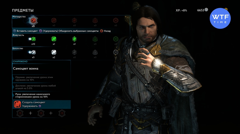 Мы рекомендуем вам как можно скорее собрать все Гондорские артефакты. Это разблокирует улучшение Золотоискатель для навыка Охотник за сокровищами, которое повышает шанс получить с поверженных врагов камни более высокого качества. Все действия с самоцветами производятся в меню Предметы. Выберите одну из ячеек и нажмите на неё, так вы перейдете в меню для улучшения камней.
