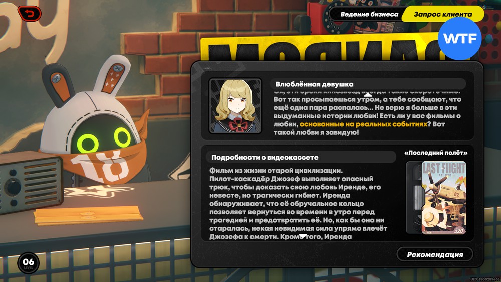 Влюбленная девушка в Zenless Zone Zero — одна из клиенток видеопроката, которая попросит вас подобрать фильм о любви, основанный на реальных событиях. Рассказываем, какую кассету ей предложить.