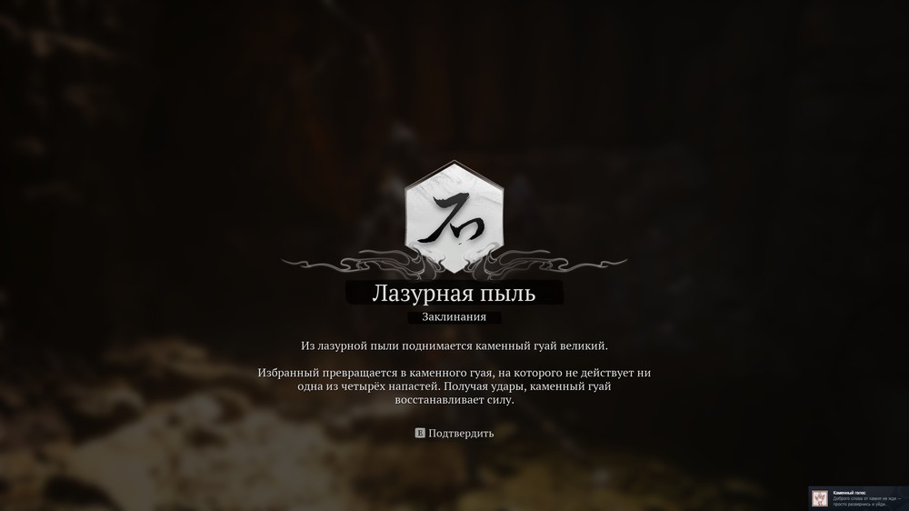 В награду за победу над ним вы получите заклинание «Лазурная пыль». Избранный превращается в каменного гуая, на которого не действует ни одна из четырех напастей. Получая удары, каменный гуай восстанавливает силу.
