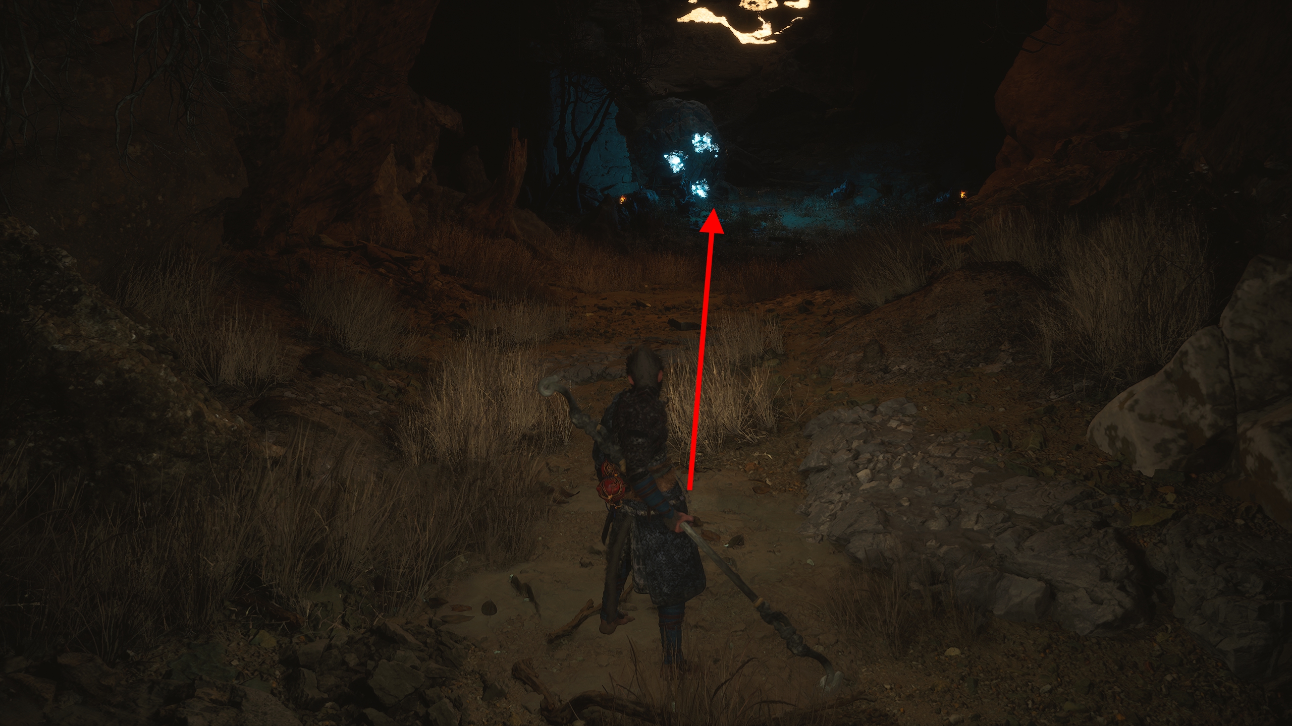 Чтобы её найти, станьте спиной к алтарю «Скала страха [Каменная равнина]» и идите в пещеру перед вами. Следуйте за светом факелов, чтобы подняться по тропе наверх, а затем идите вперед до конца, пока не увидите светящиеся синие камни.
