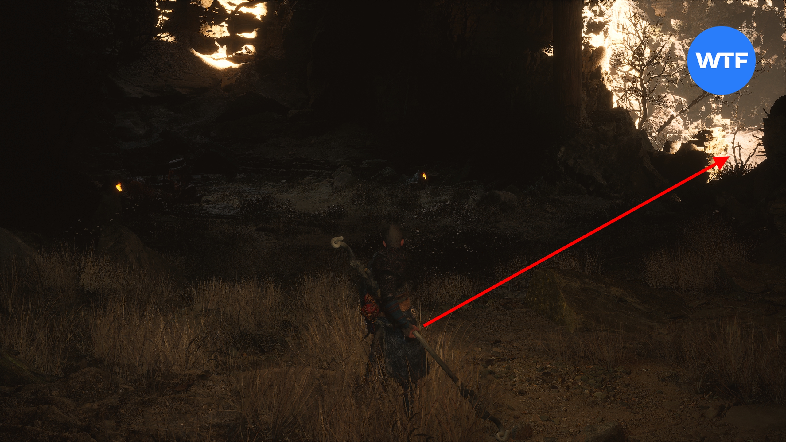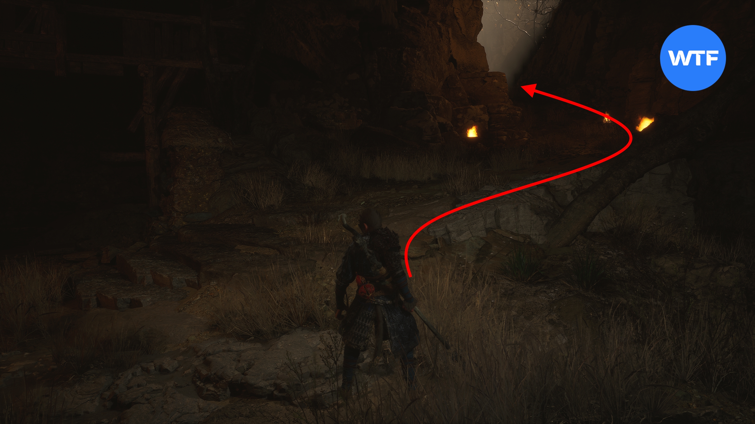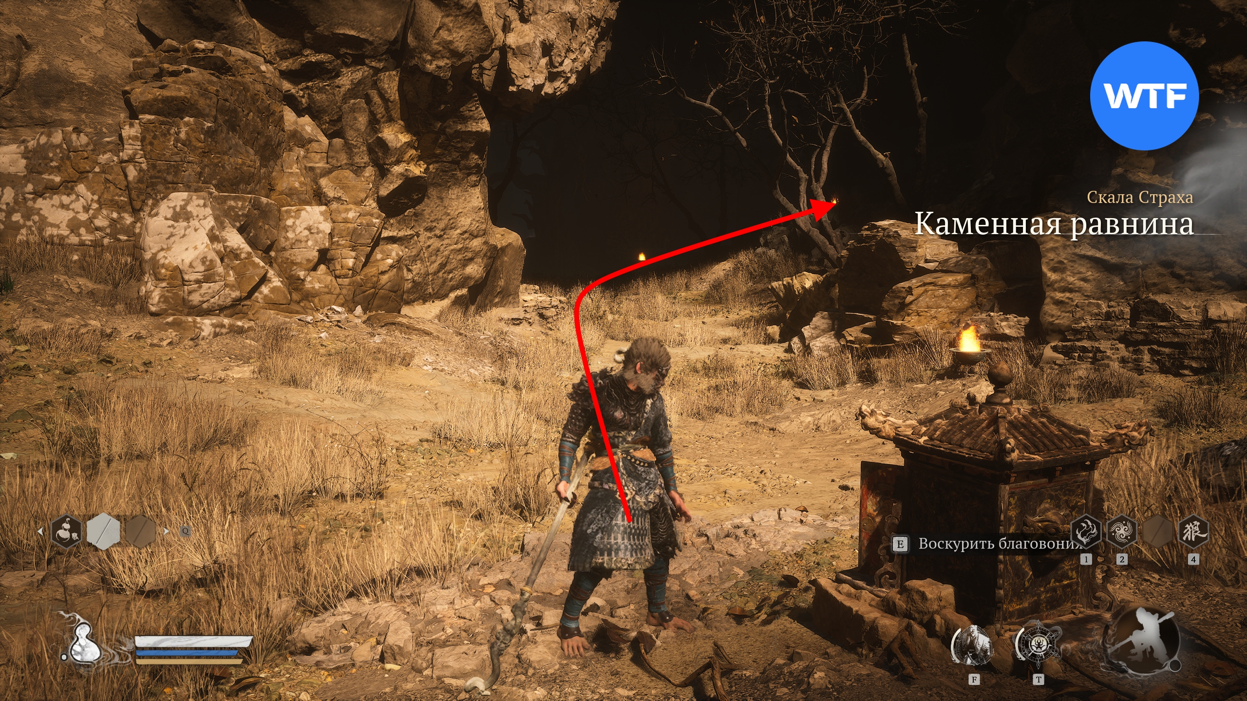 Станьте спиной к алтарю «Скала страха [Каменная равнина]» и идите в темную пещеру перед вами. Следуйте за светом факелов, чтобы подняться по каменной тропе наверх, а затем бегите вперед.