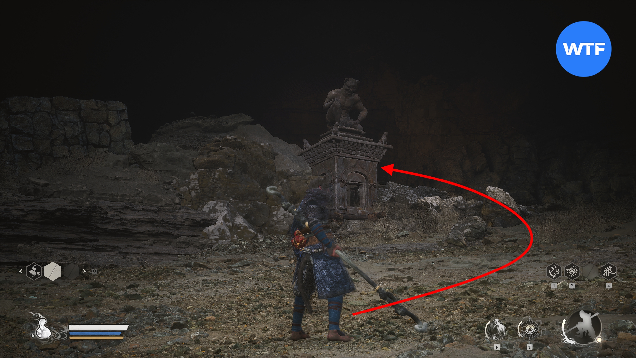 Станьте лицом к алтарю «Скала страха [Пристанище ветров]» и на этот раз бегите в пещеру слева. Доберитесь до каменной статуи со скриншота 2 и за ней сразу же поверните налево. Там вы найдете голову с четвертым оком будды.