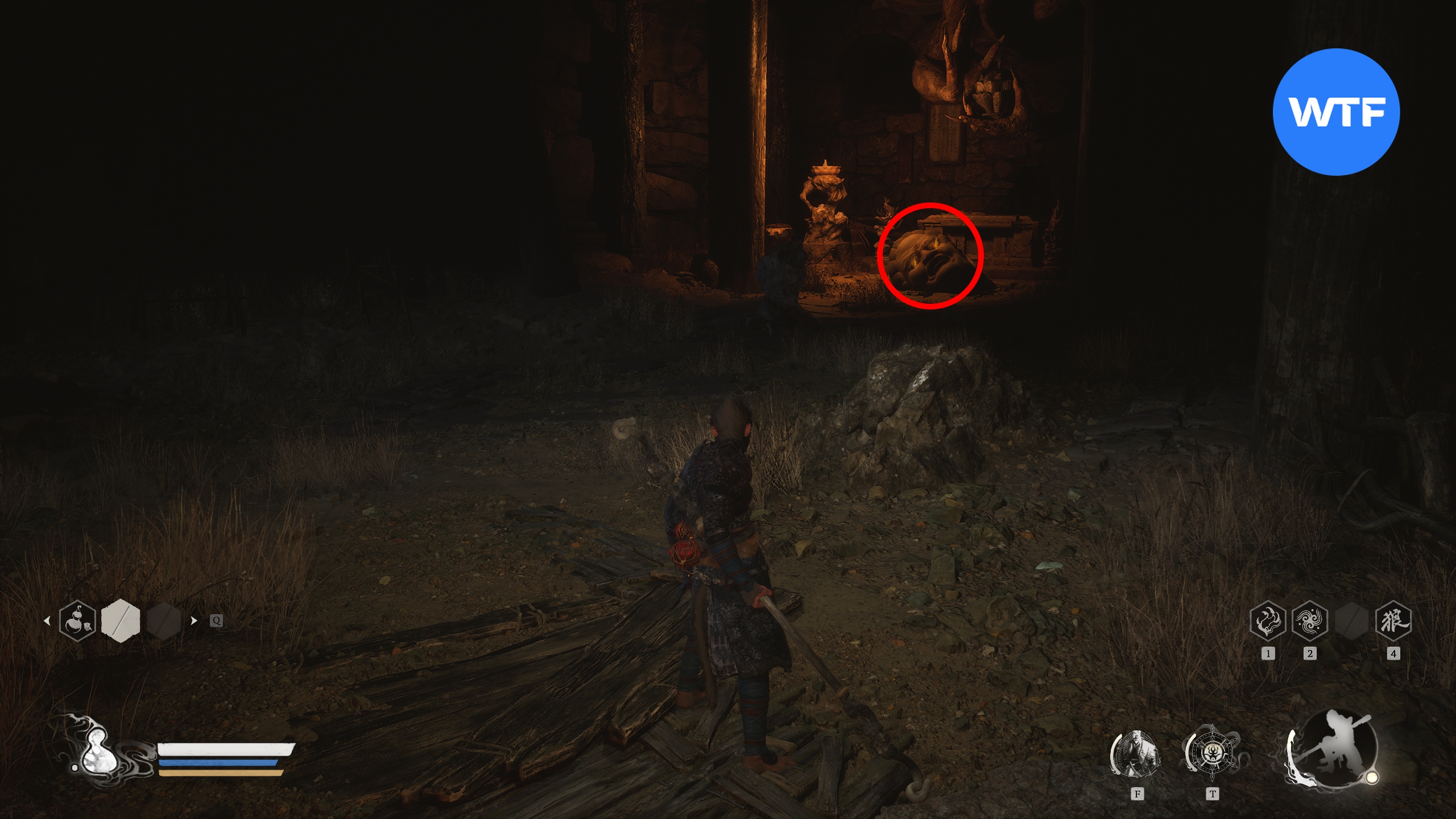 Станьте лицом к алтарю «Скала страха [Пристанище ветров]» и от него бегите направо, в сторону деревянной лестницы, которая виднеется вдалеке. Вам нужно подняться по ступенькам до самого верха, чтобы забрать это Око Будды из каменной головы.