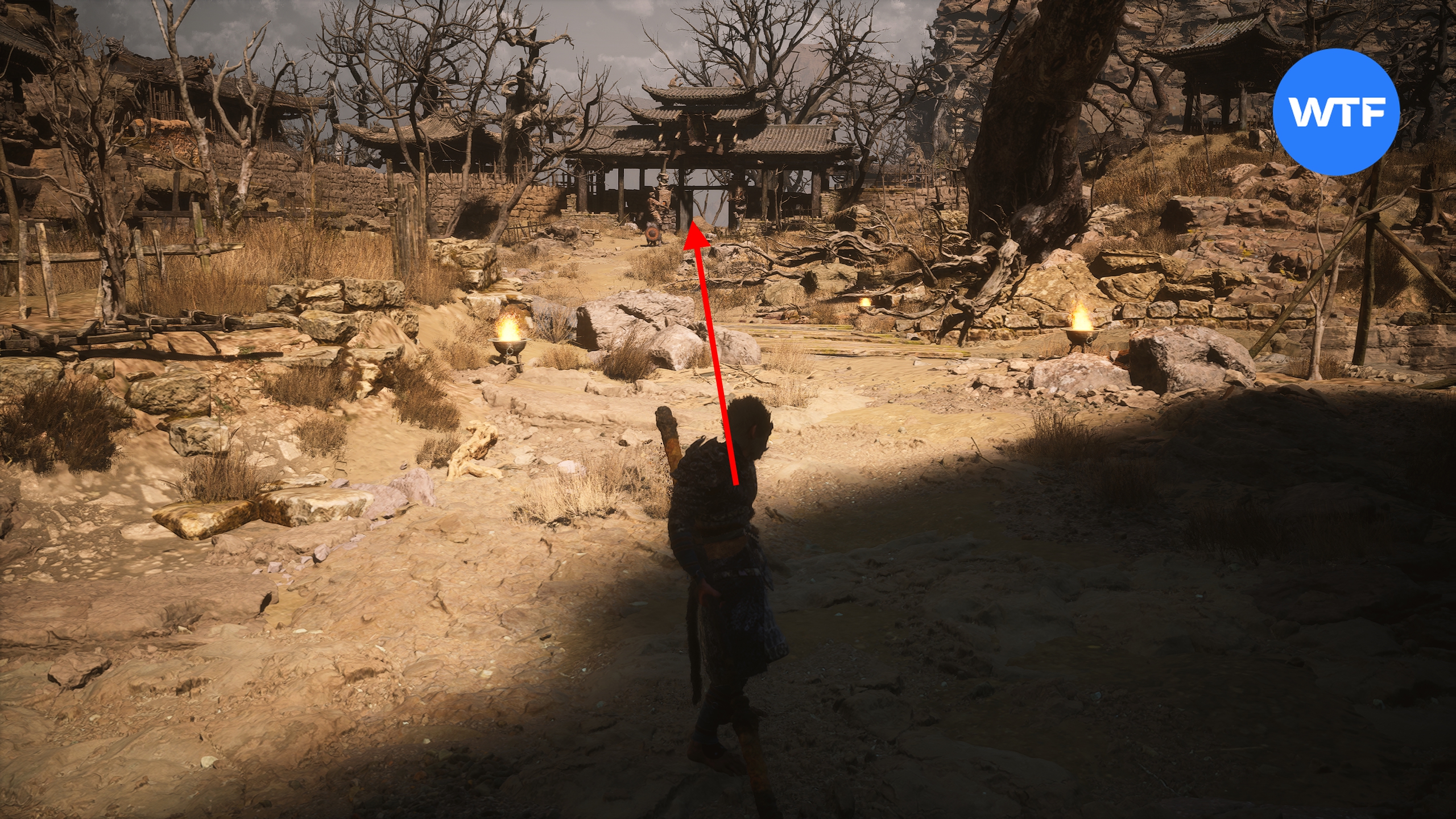 Чтобы добраться до третьего места, вернитесь к алтарю «Деревня Песчаные Врата [Вход в поселение]». Станьте к нему лицом и бегите через мост слева. Пройдите через главные ворота на арену, где вы сражались с Земляным волком, а затем сверните налево и пройдите через дыру в каменной стене.